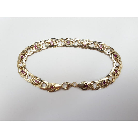 10K Solid Yellow Gold Double Sided Cubic Zirconia & Ruby Flat Link Bracelet