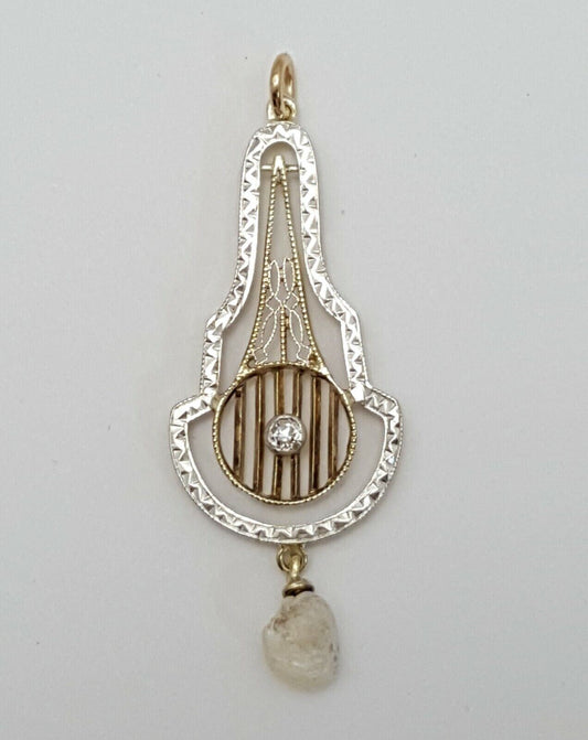 Vintage 14K Solid Two Tone Gold Dangle Diamond & Pearl Charm Pendant