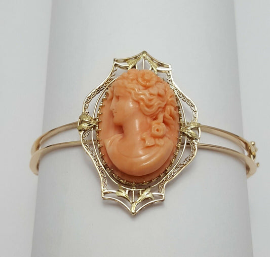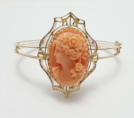 10K Yellow Gold Rose Coral Cameo Bangle Bracelet