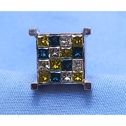 Single 14K White Gold Square Shaped White, Yellow & Green Diamond Stud Earring