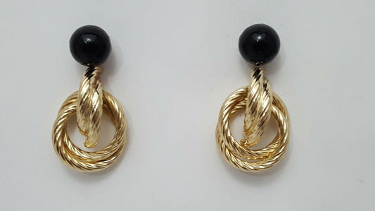 14K Yellow Gold Designer Dangle Hanging Black Ball Jacket Stud Earrings