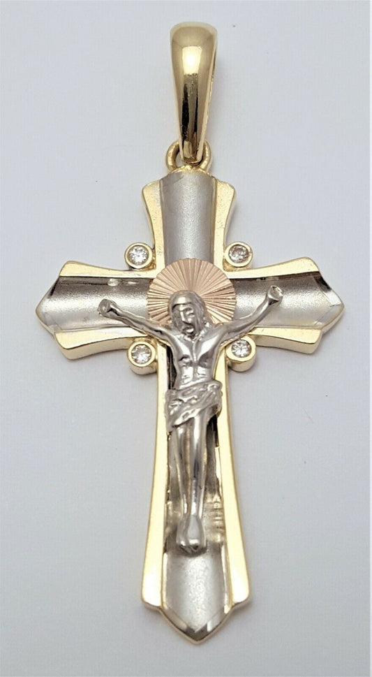 14K Solid Tri Tone Gold Cubic Zirconia Jesus Cross Charm Pendant