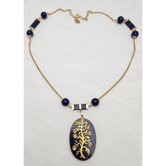 18K Solid Yellow Gold Floral Lapis Lazuli Bead Ball Link Chain Necklace