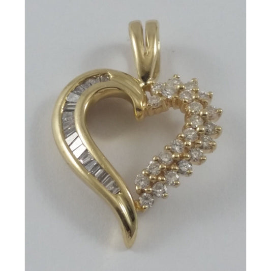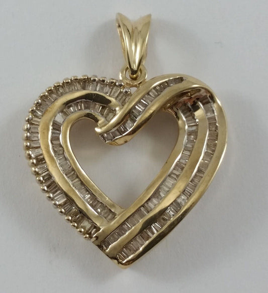 14K Solid Yellow Gold Open Heart Round & Baguette Diamond Charm Pendant