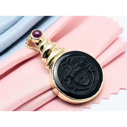 14K Yellow Gold Black Onyx & Cabochon Ruby Cameo Charm Pendant