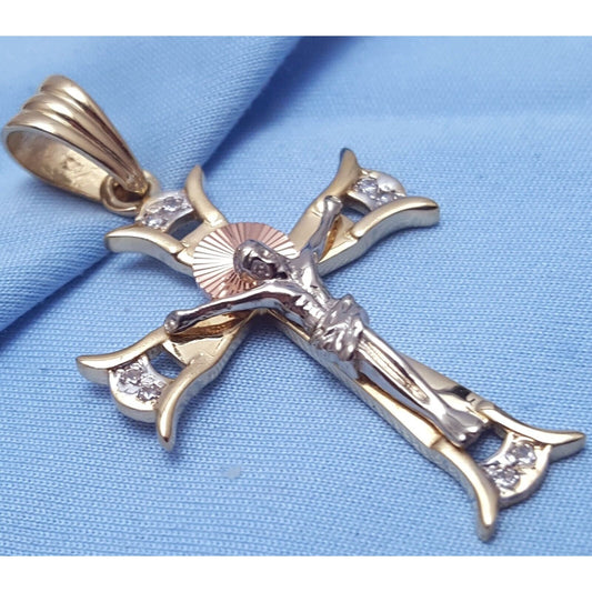 14K Solid Two Tone Religious Jesus on Cross Charm Pendant