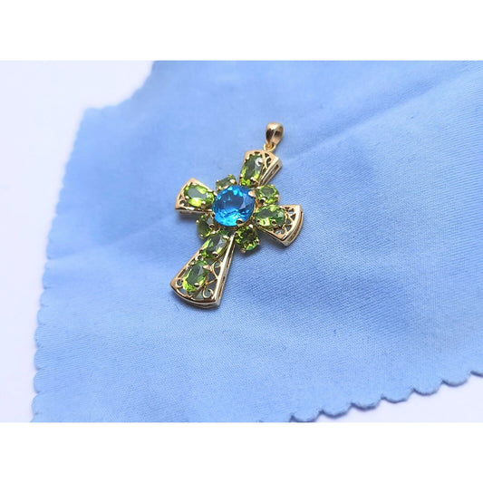 10K Yellow Gold Peridot & Blue Topaz Cross Charm Pendant