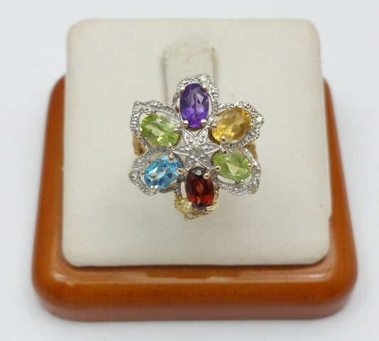 14K Solid Yellow Gold Flower Star Multi Color Stones & Diamond Ring