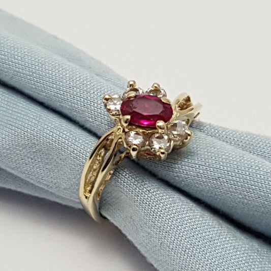14K Yellow Gold Ladies Synthetic Ruby & Cubic Zirconia Ring