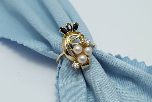 14K Solid Yellow Gold Designer Ladies Ring with CZ's, Onyx & Pearls