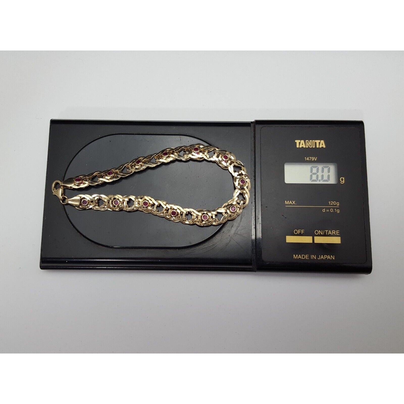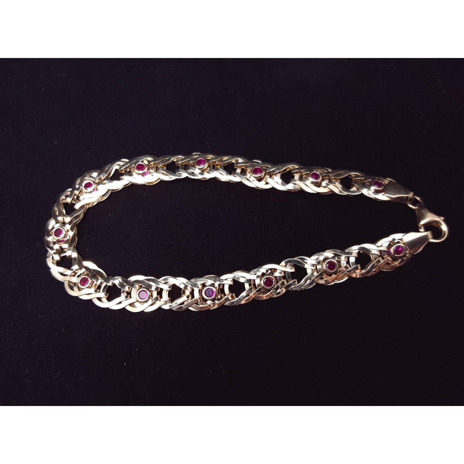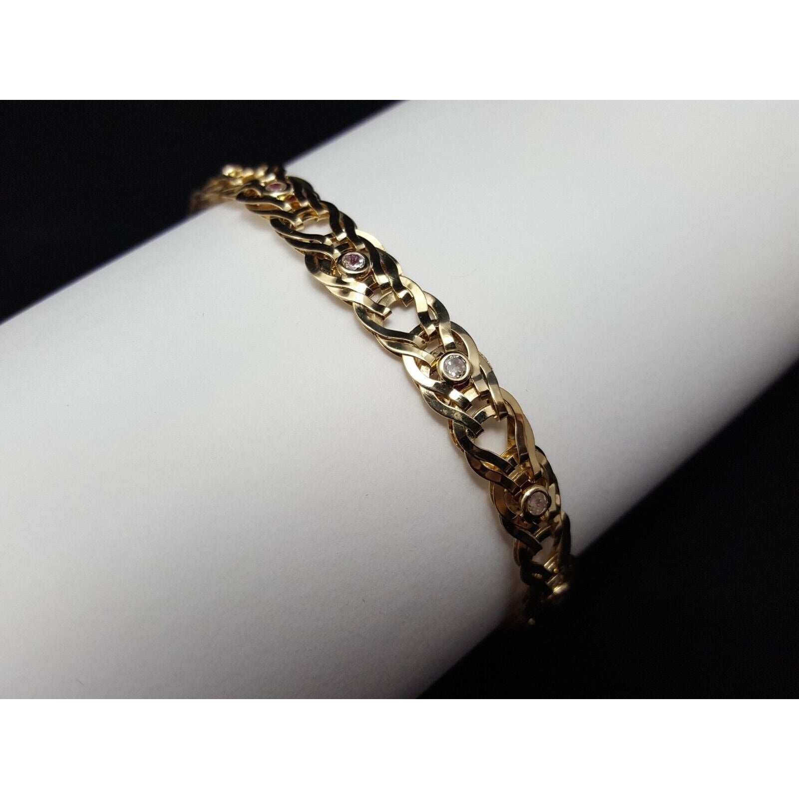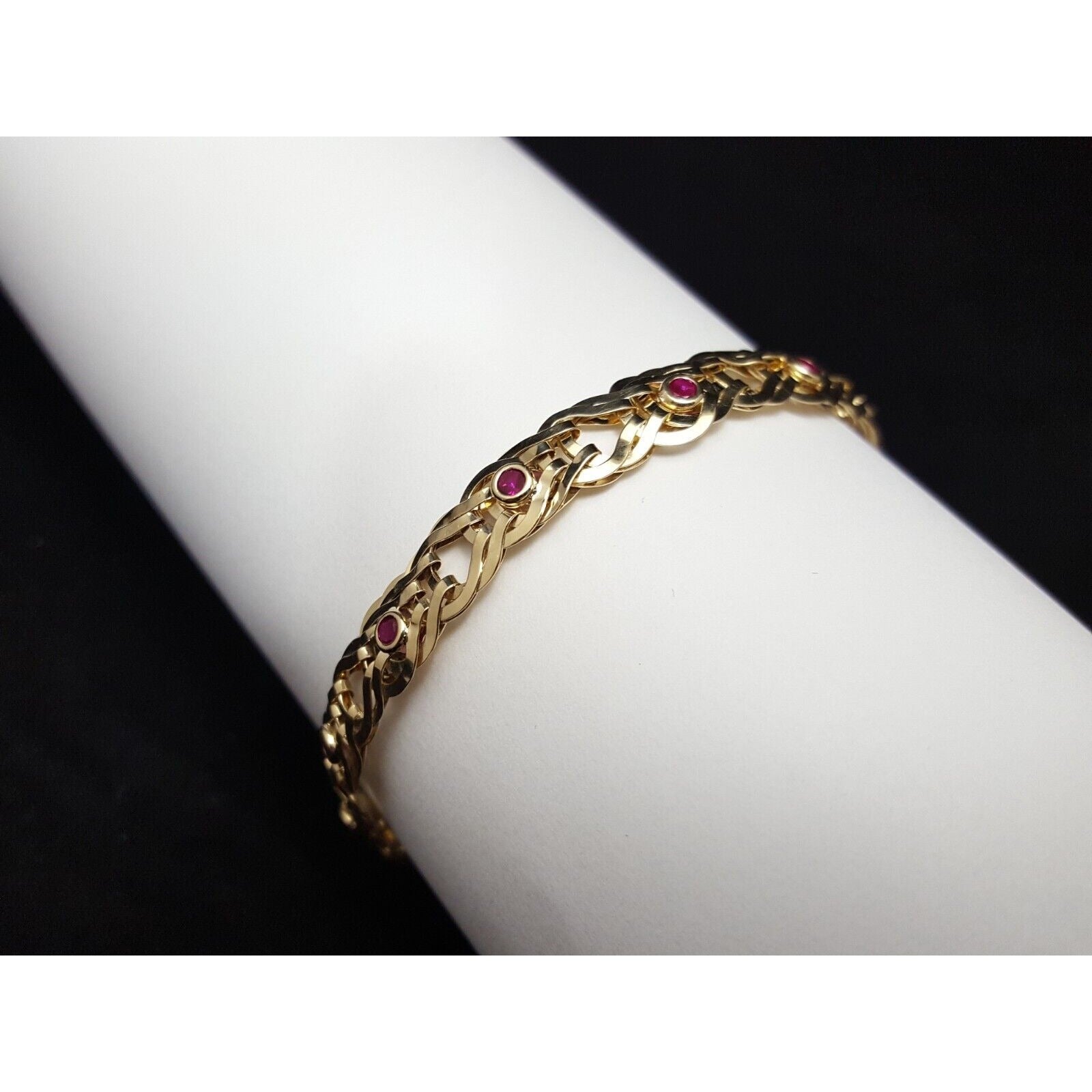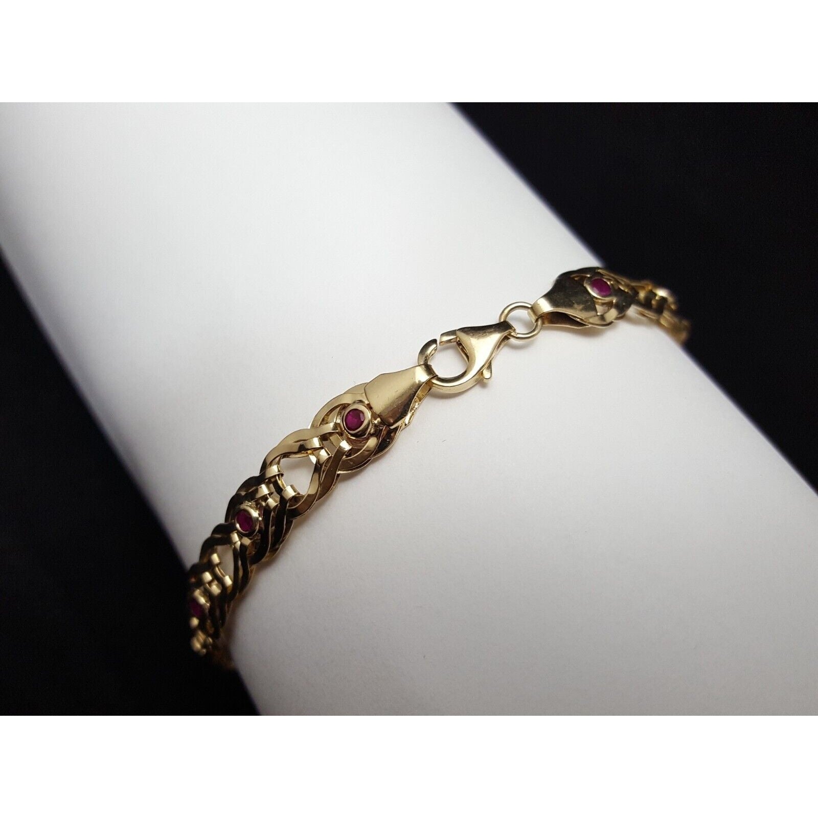10K Solid Yellow Gold Double Sided Cubic Zirconia & Ruby Flat Link Bracelet
