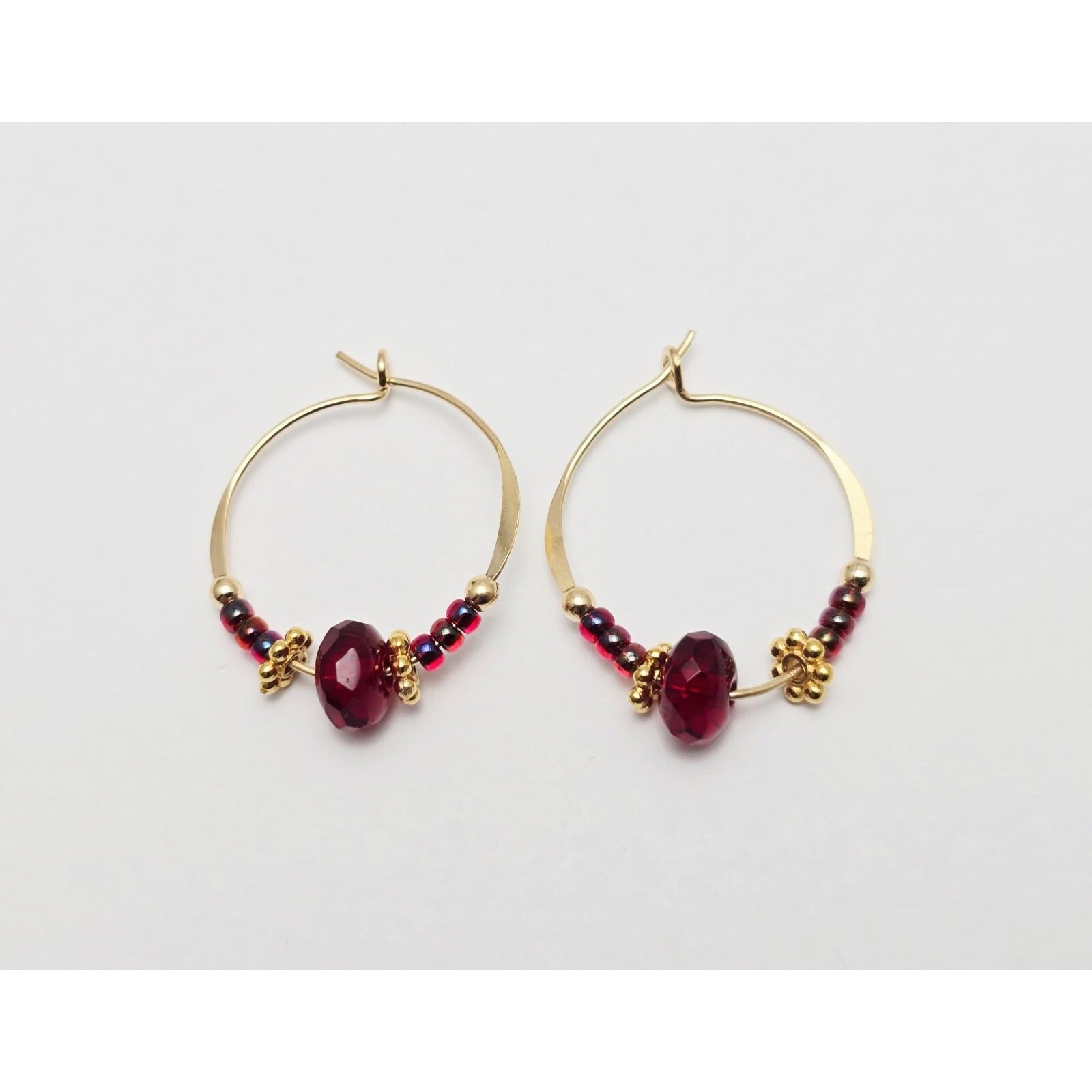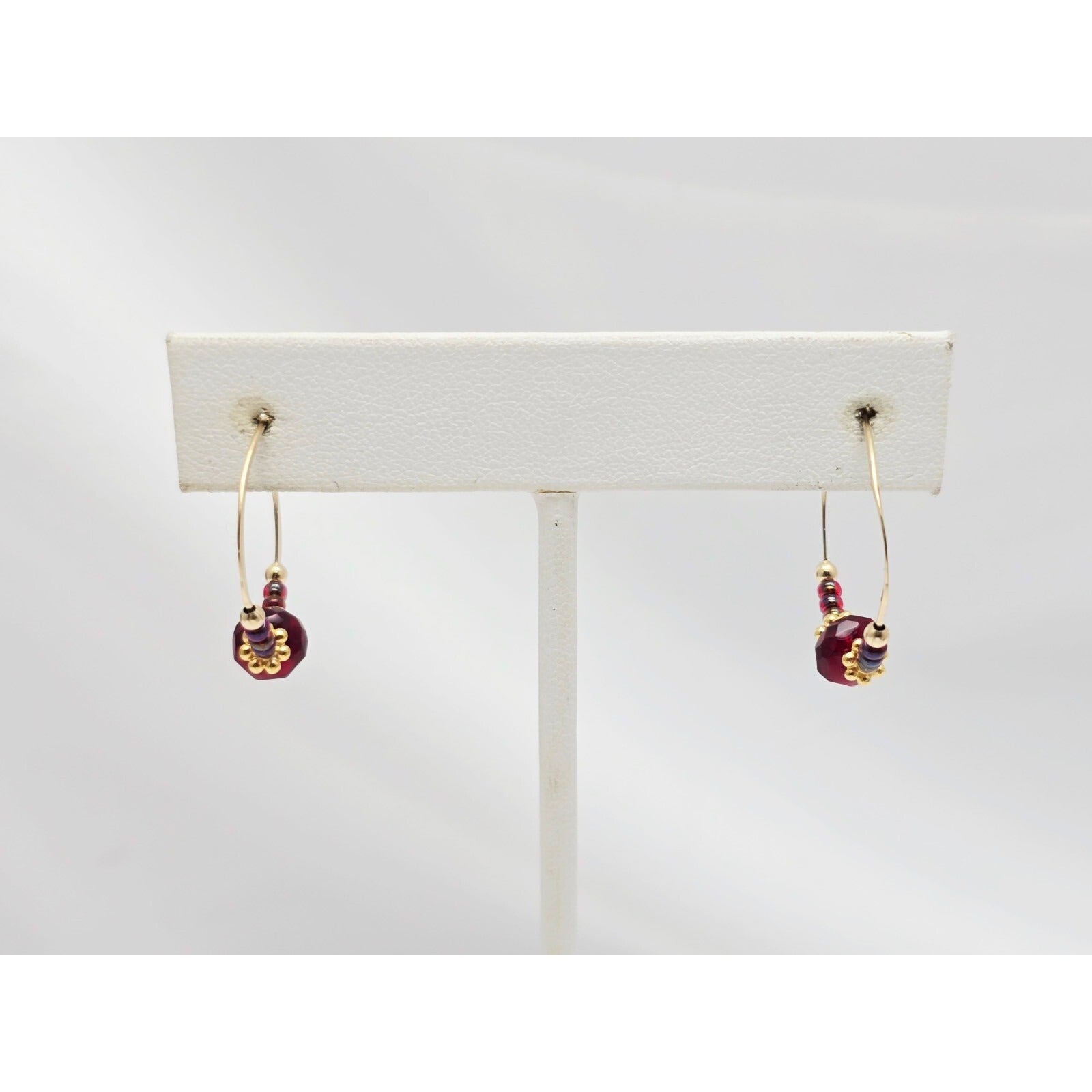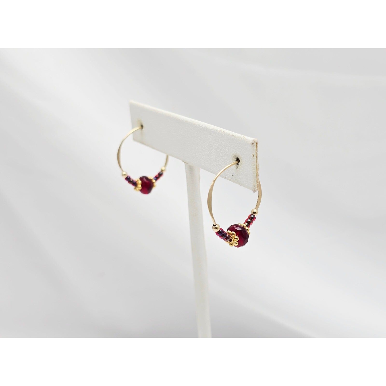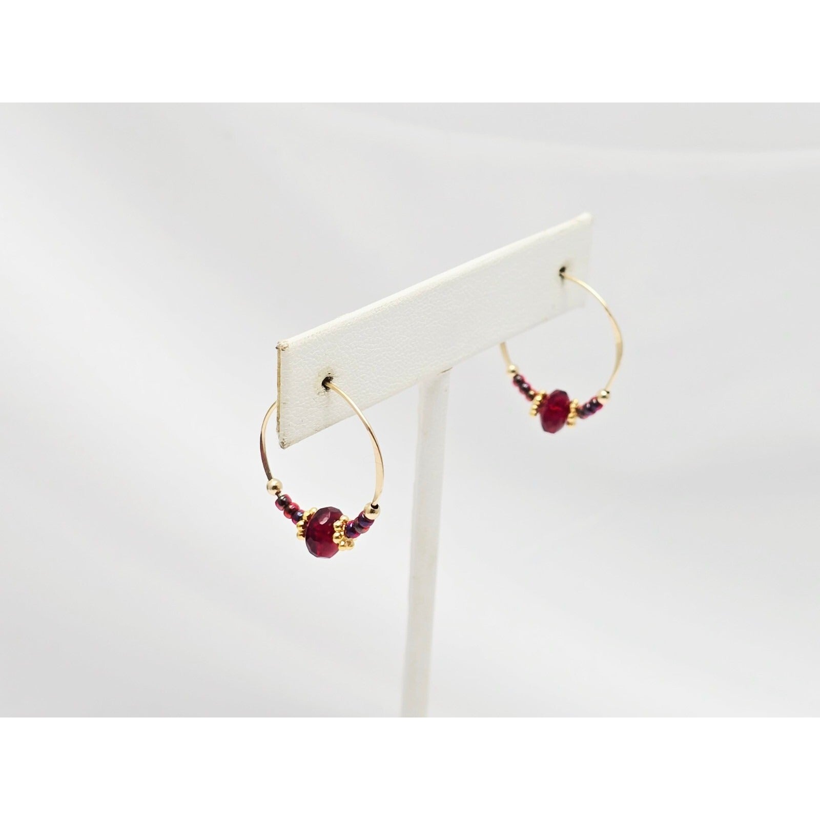 10K Yellow Gold Red Beaded Crystal Hoop Hook Earrings