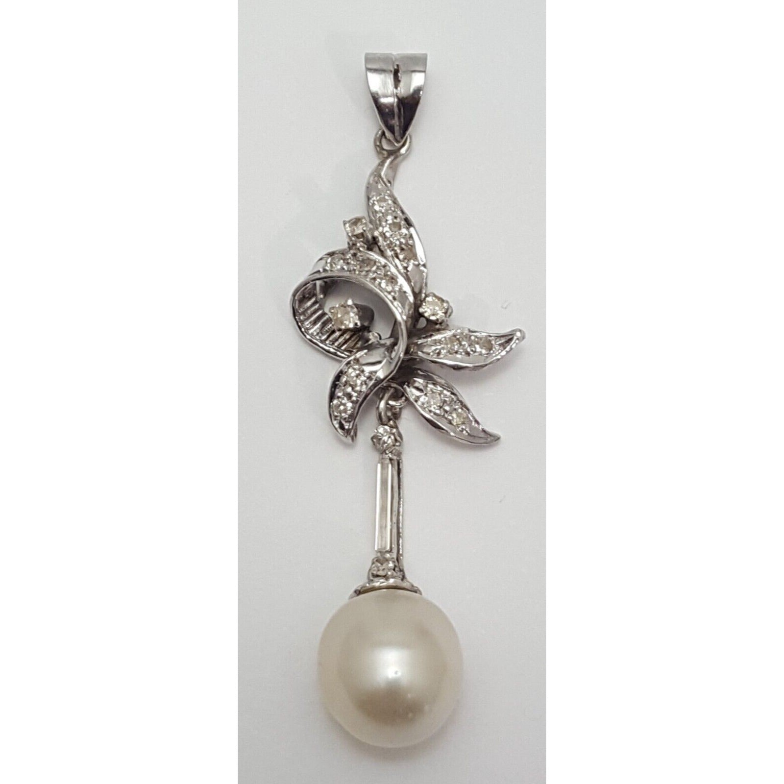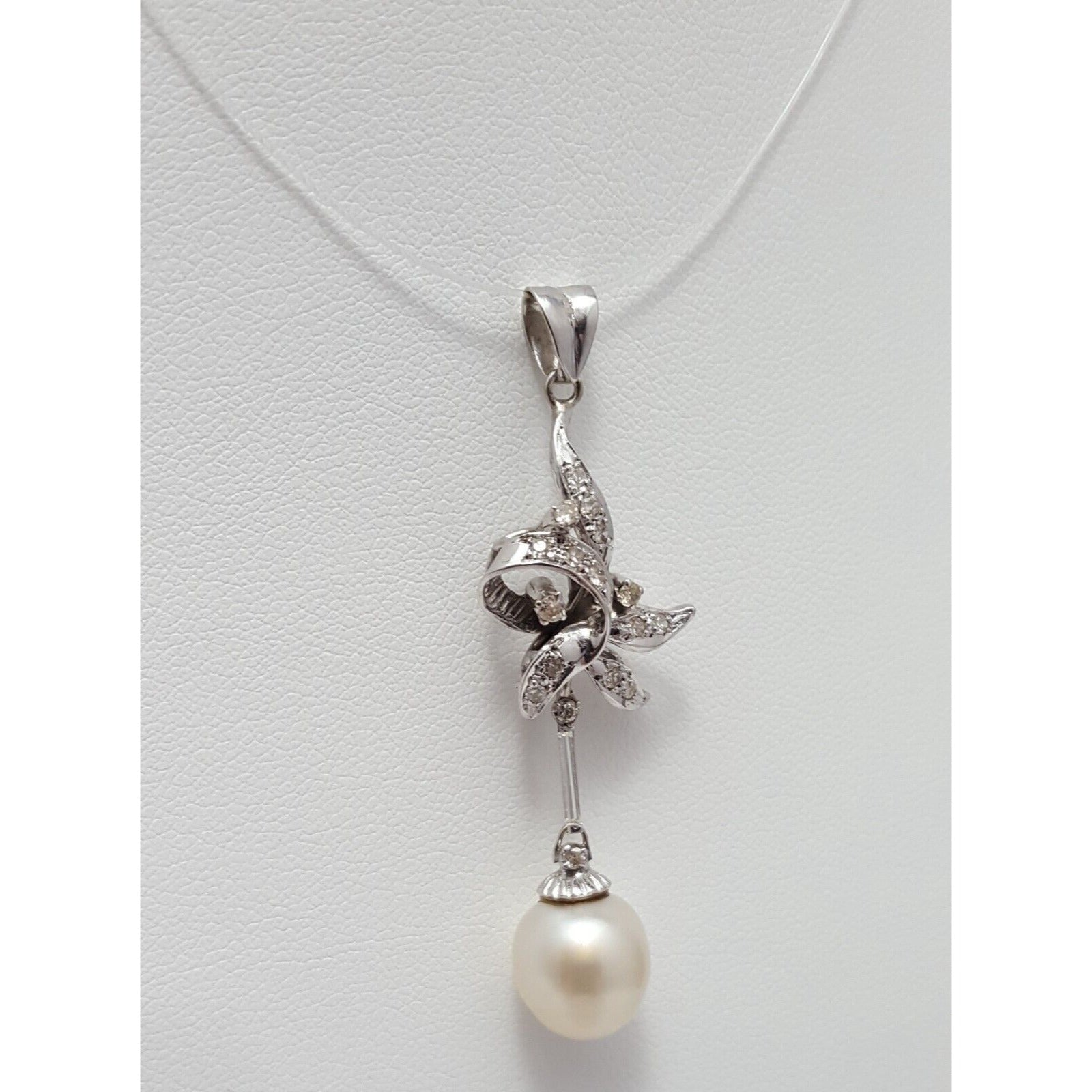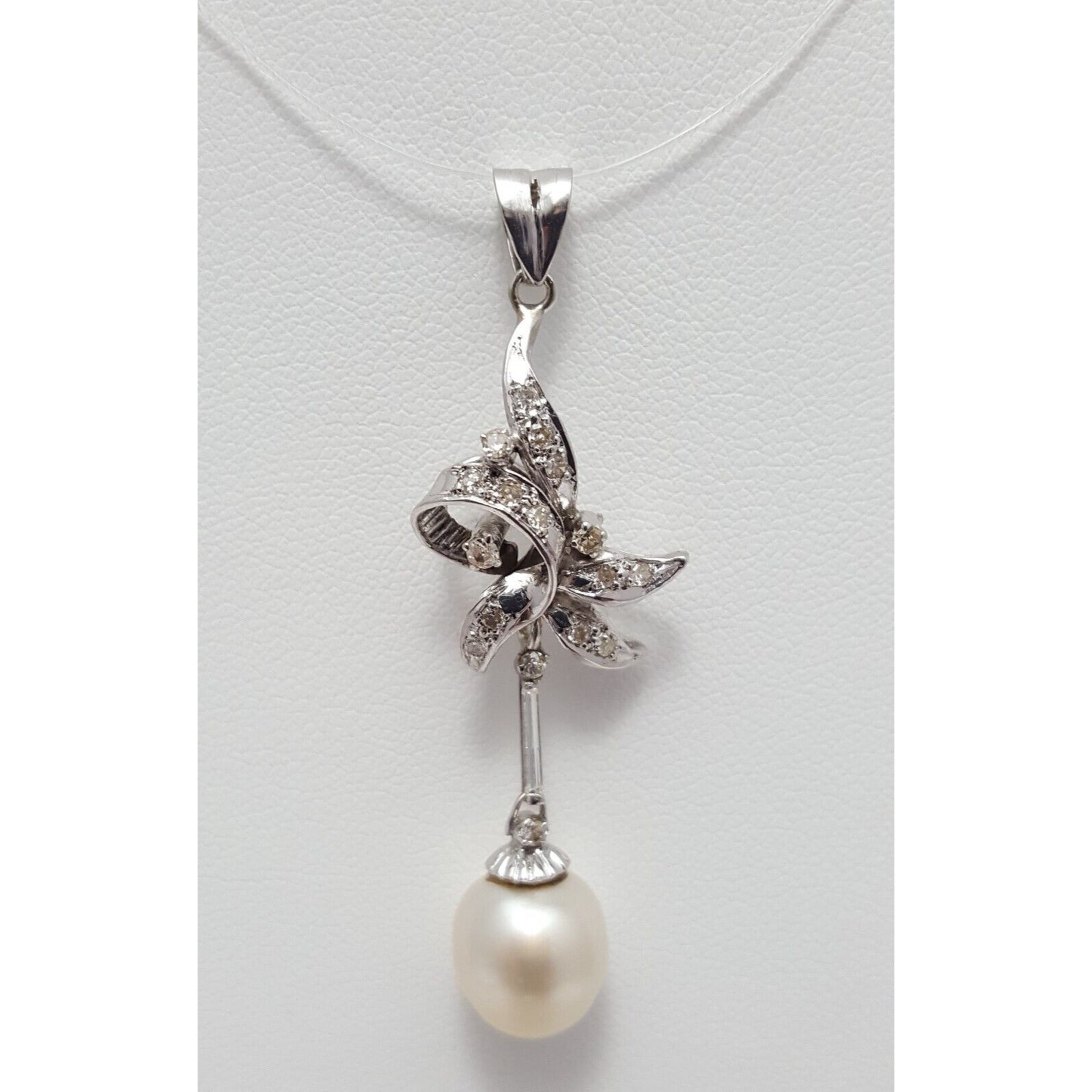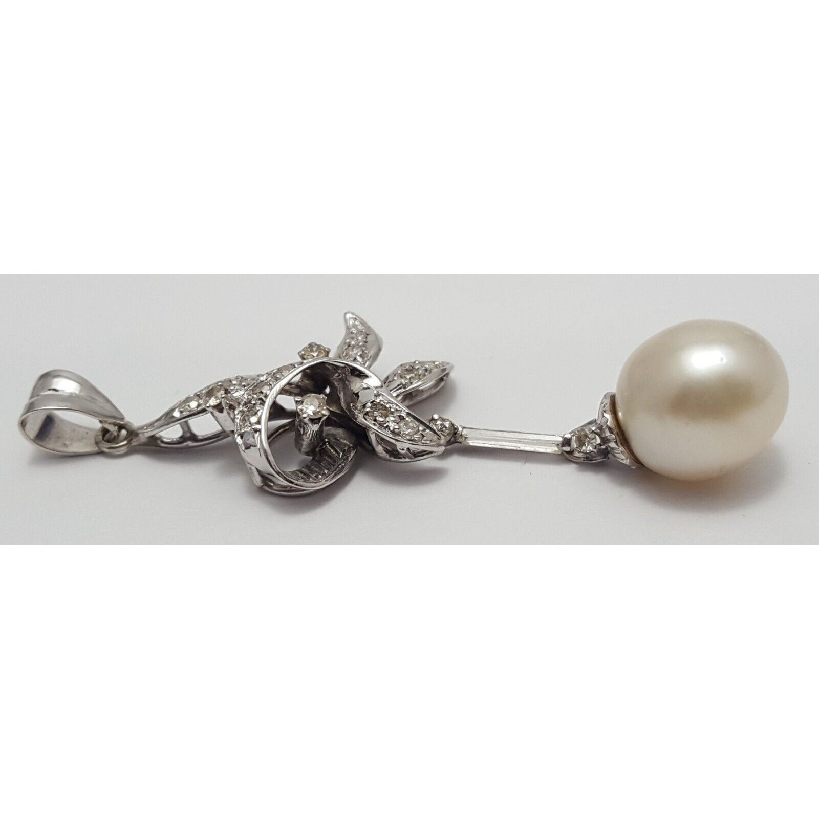 14K Solid White Gold Pearl & Diamond Drop Dangle Charm Pendant