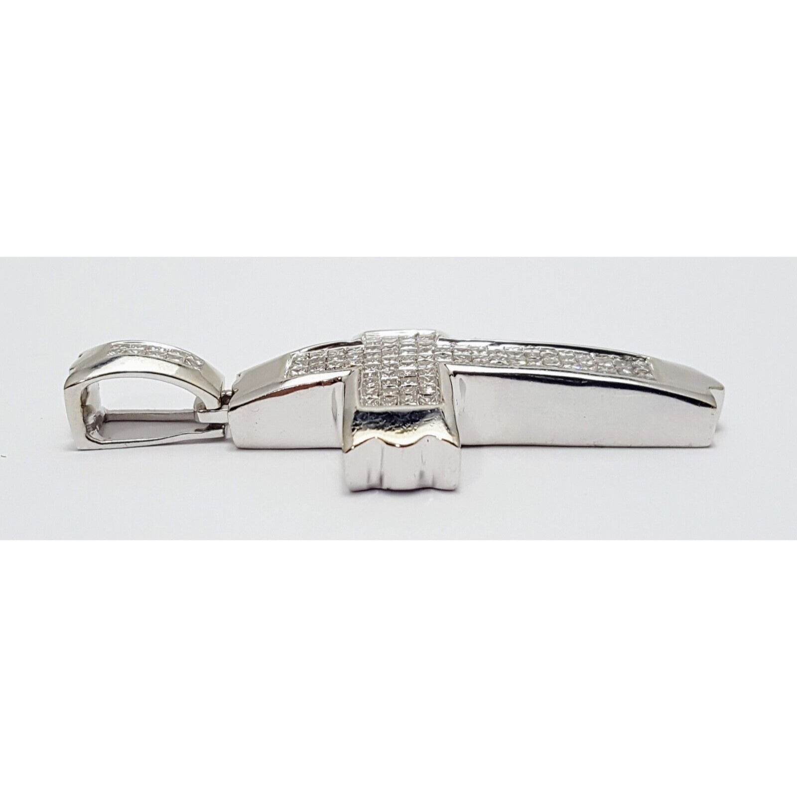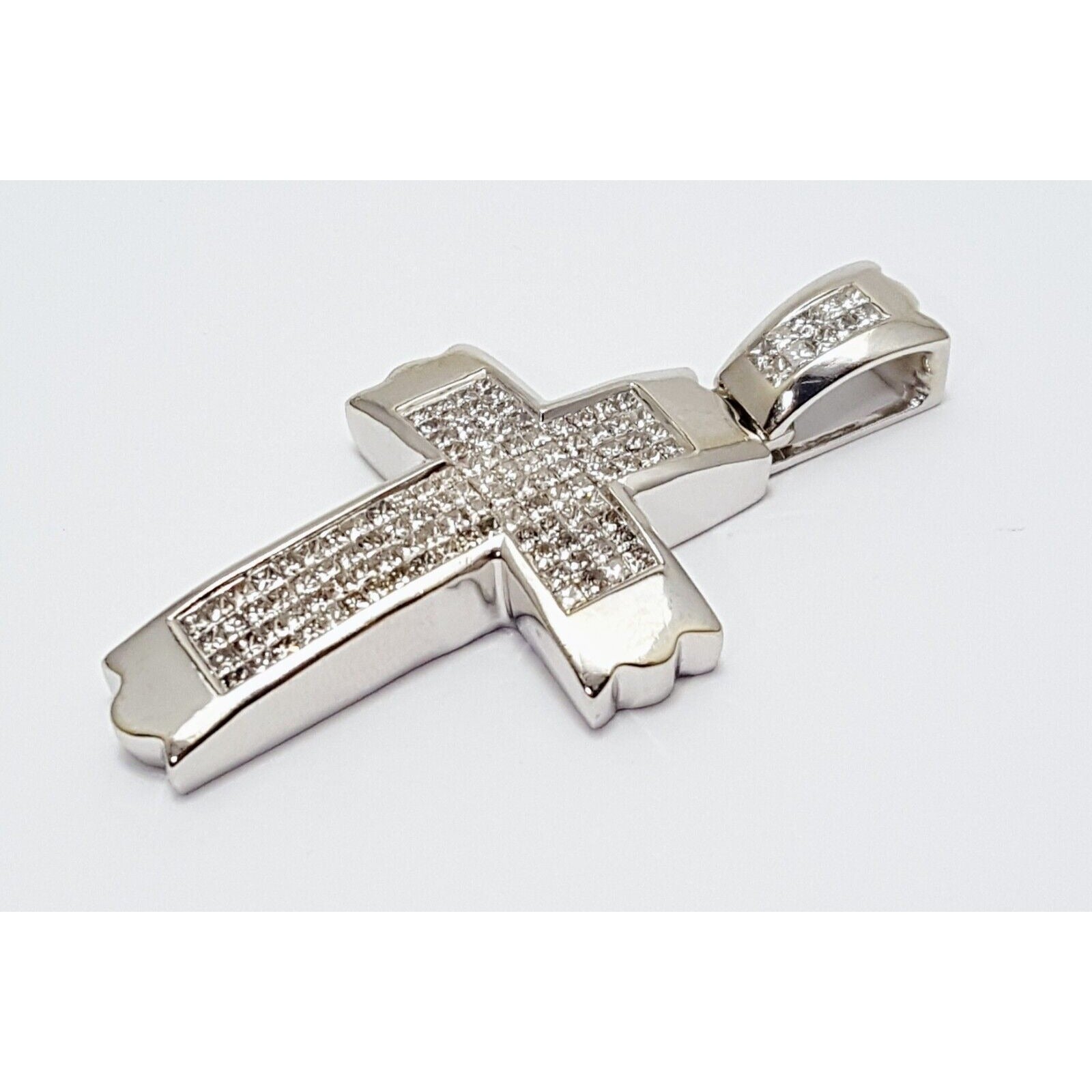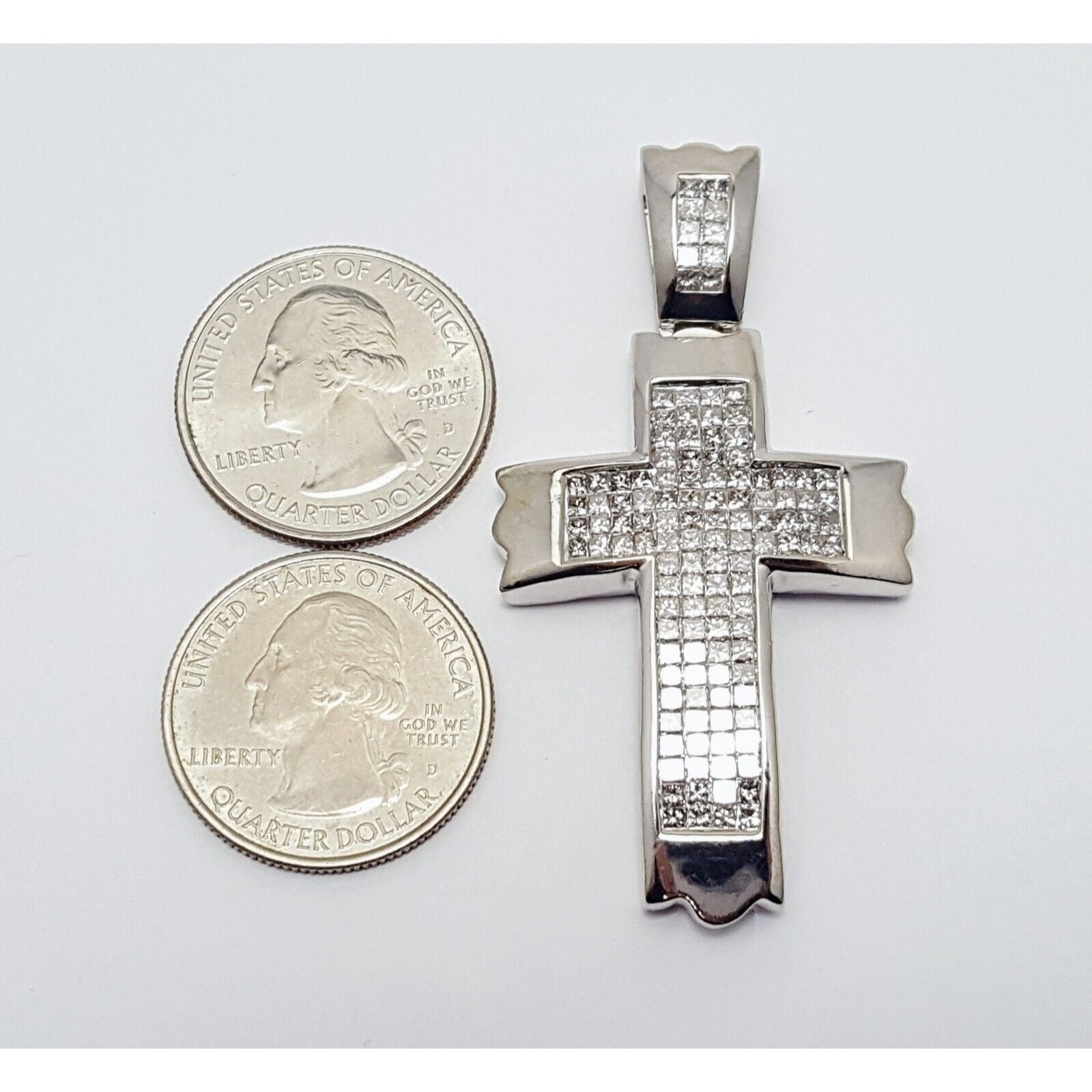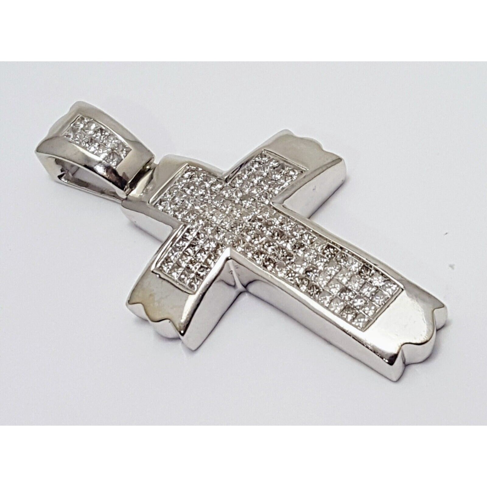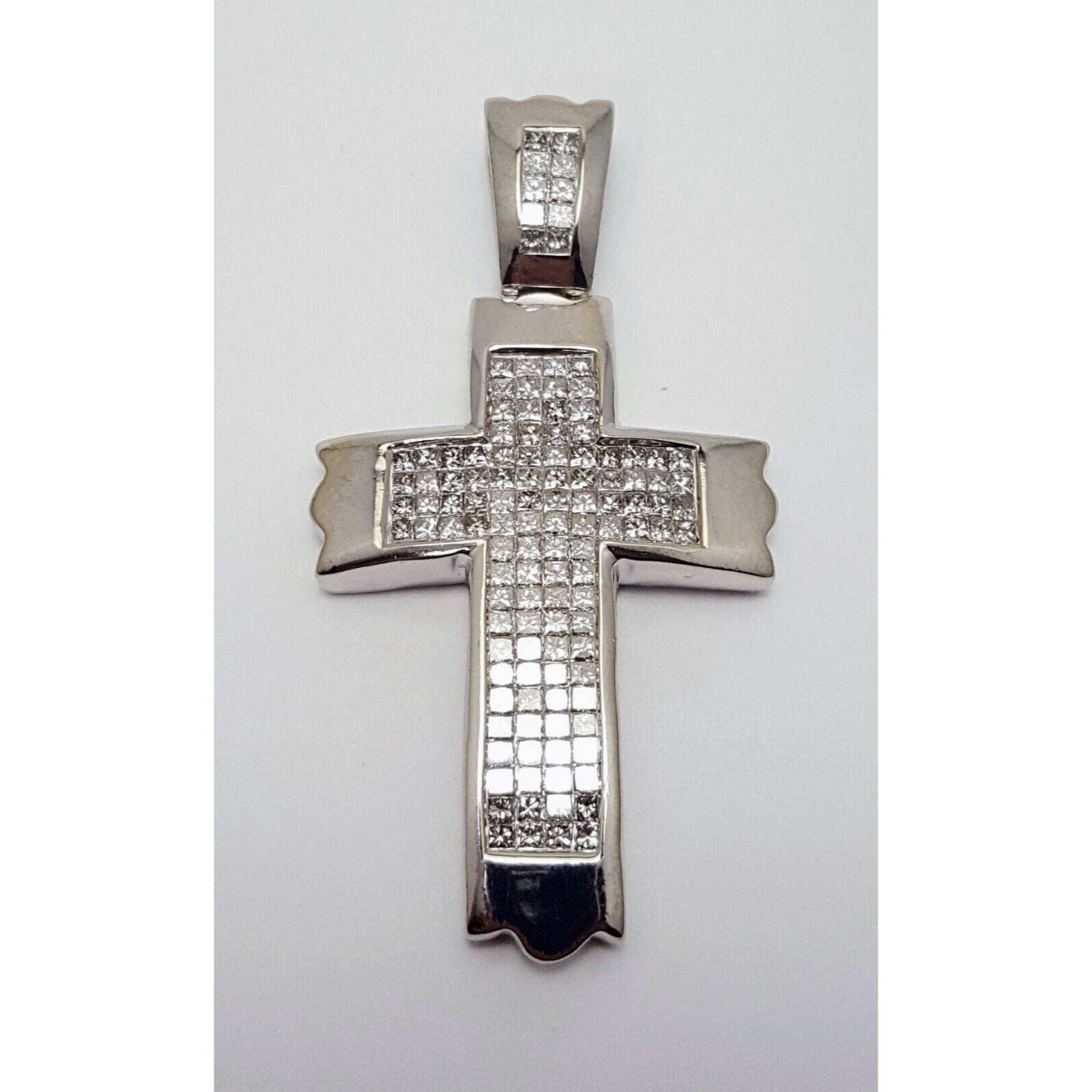 14K Solid White Gold Princess Cut Invisible Setting Diamond Cross Charm Pendant
