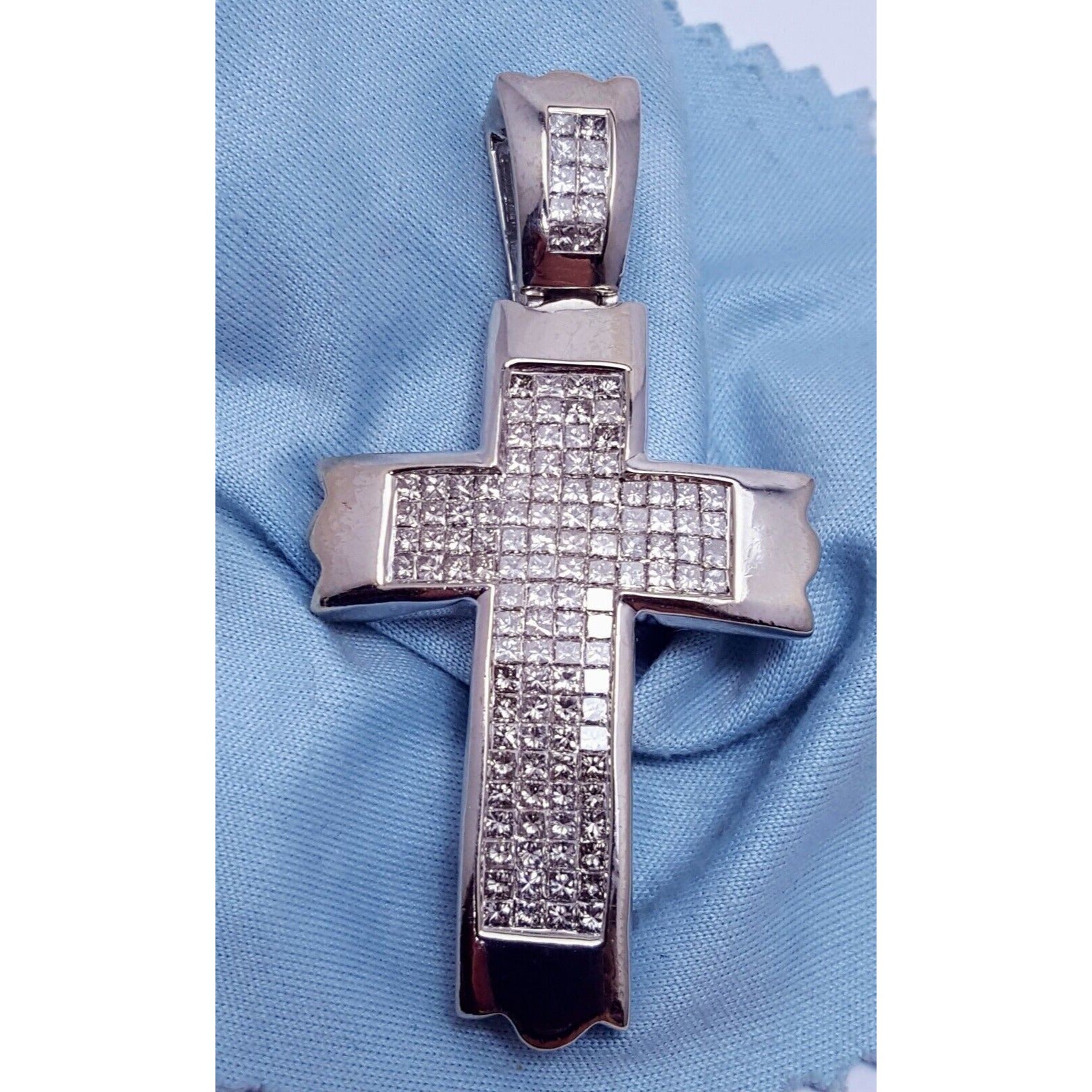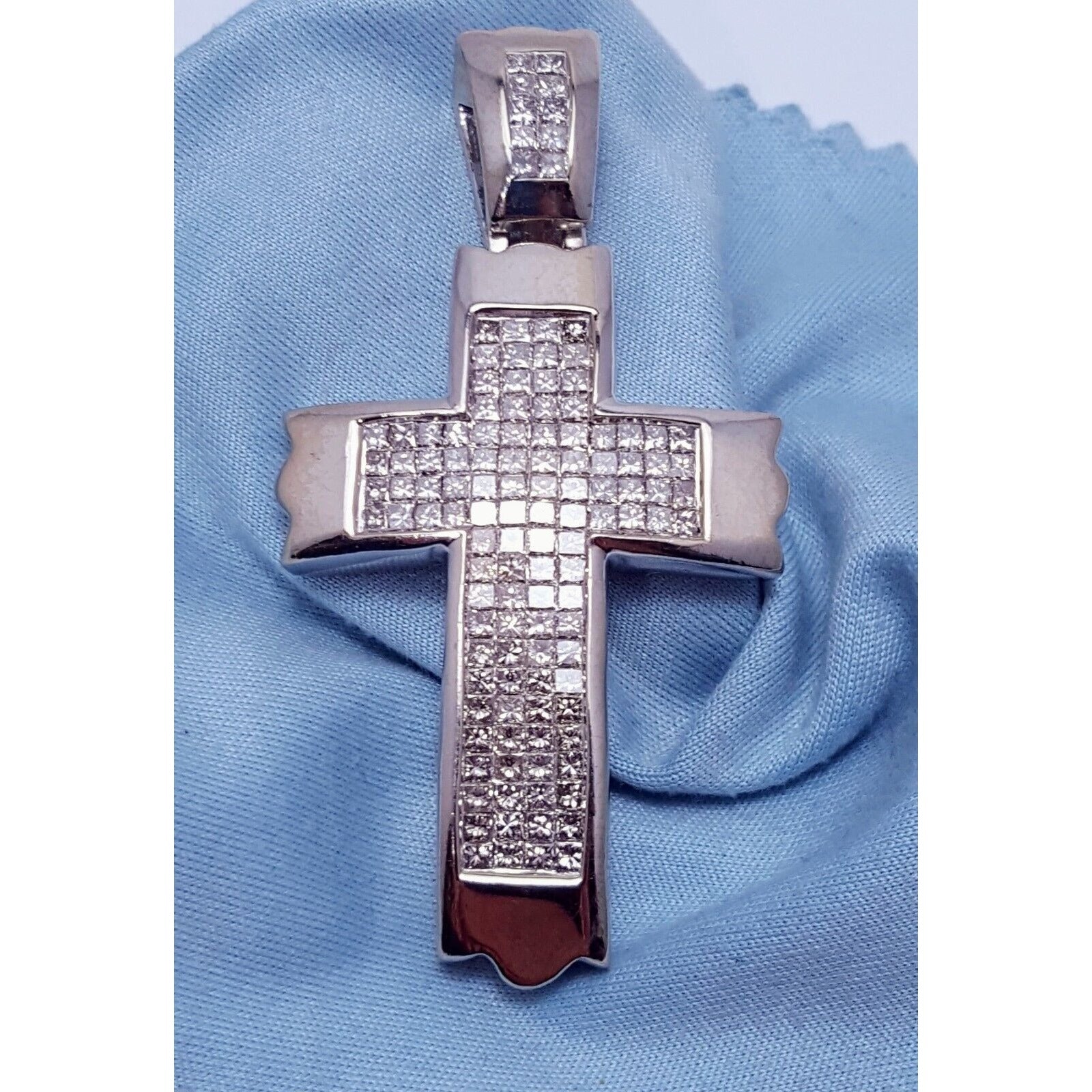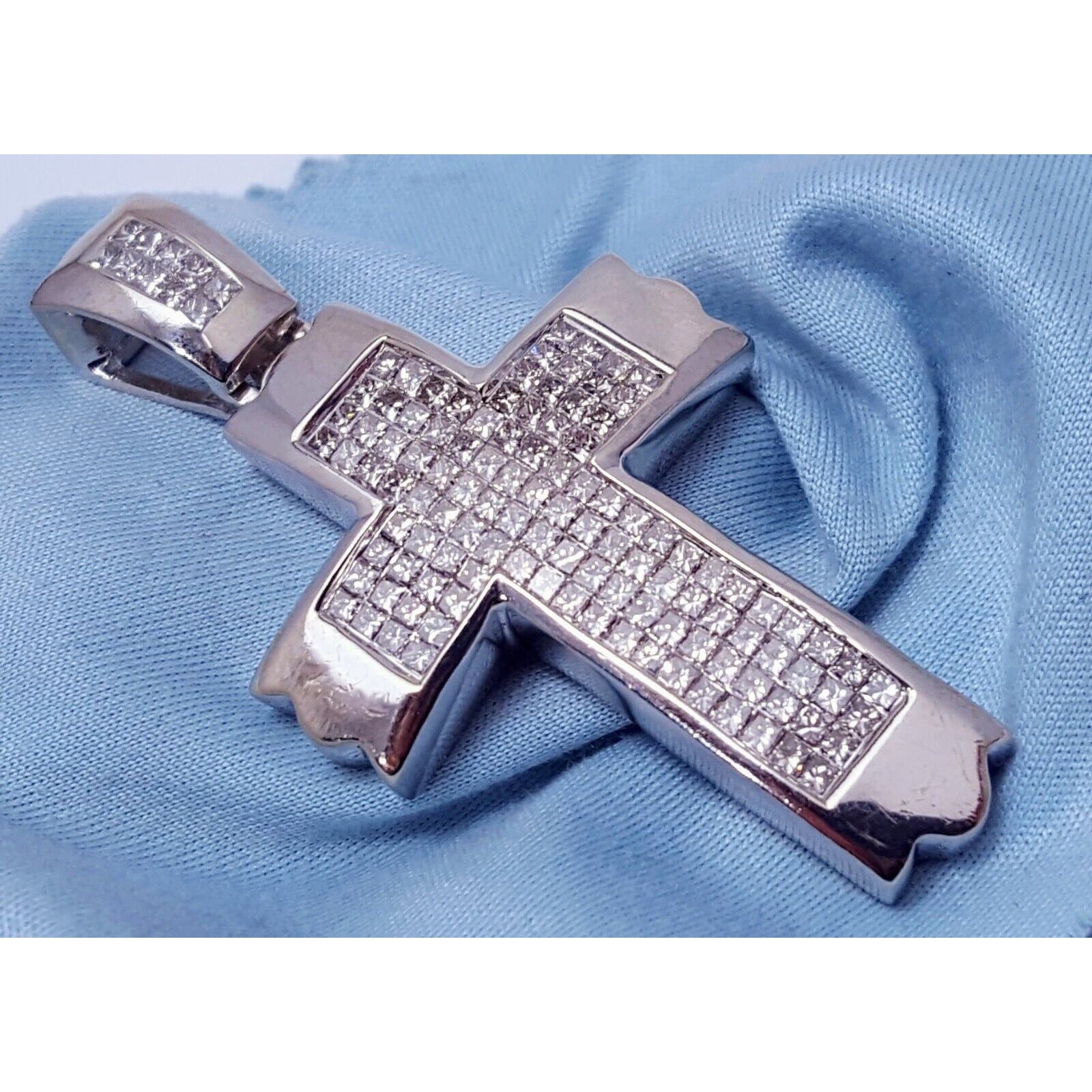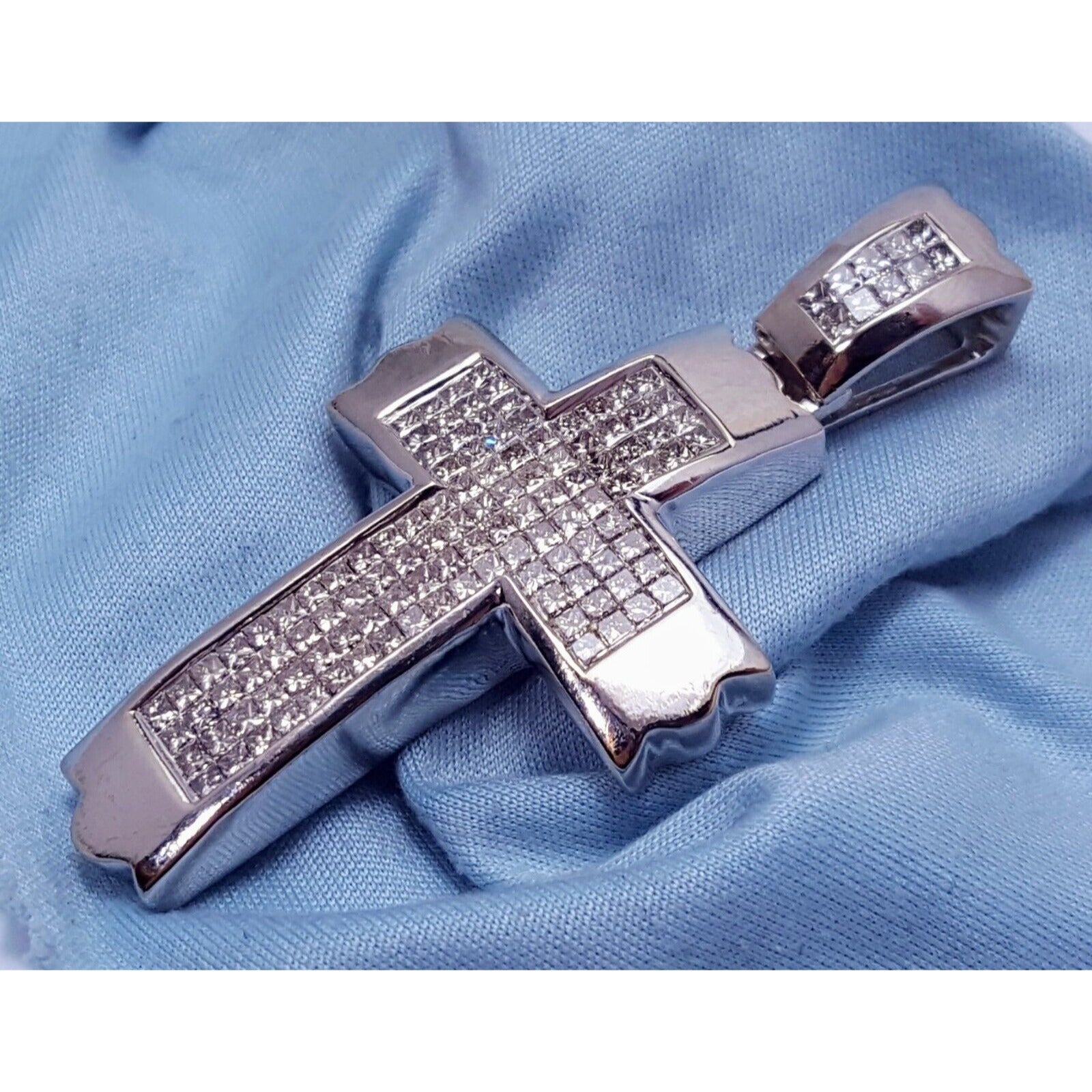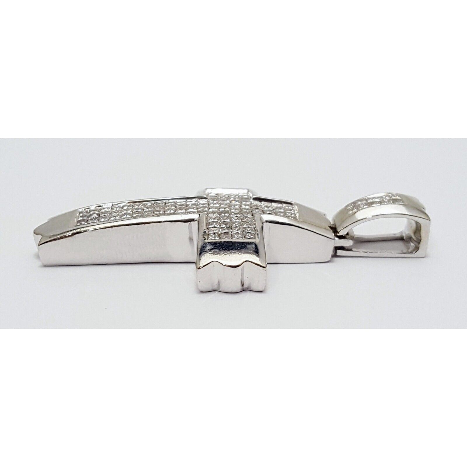 14K Solid White Gold Princess Cut Invisible Setting Diamond Cross Charm Pendant