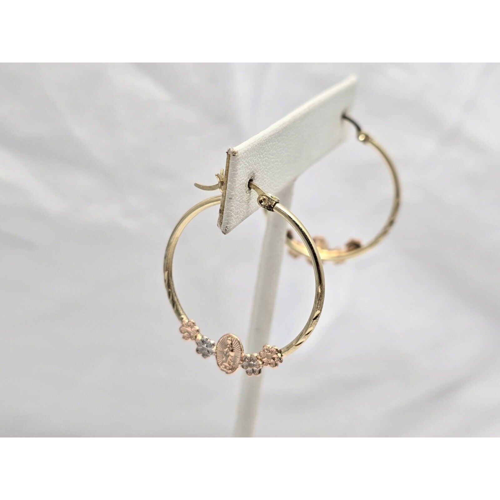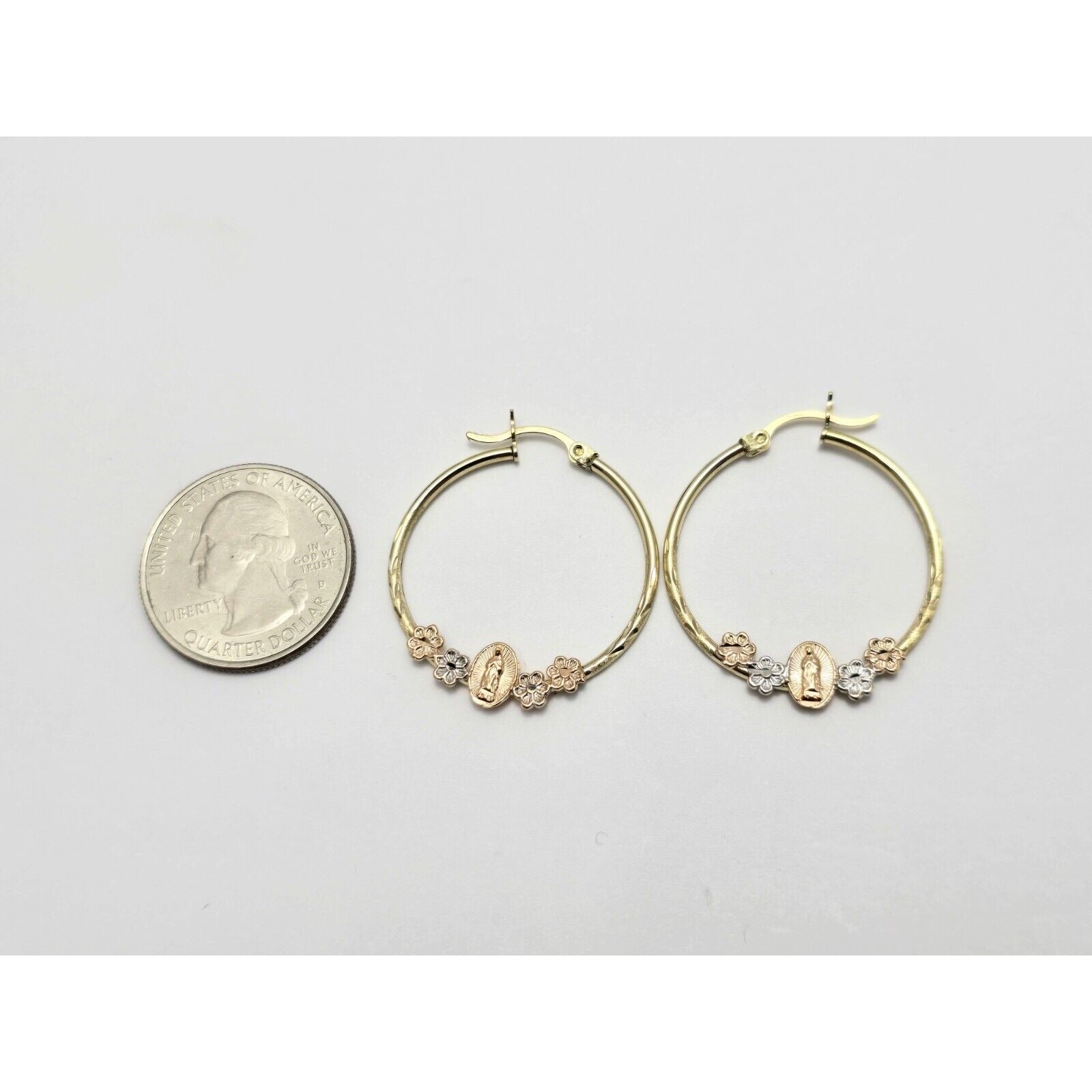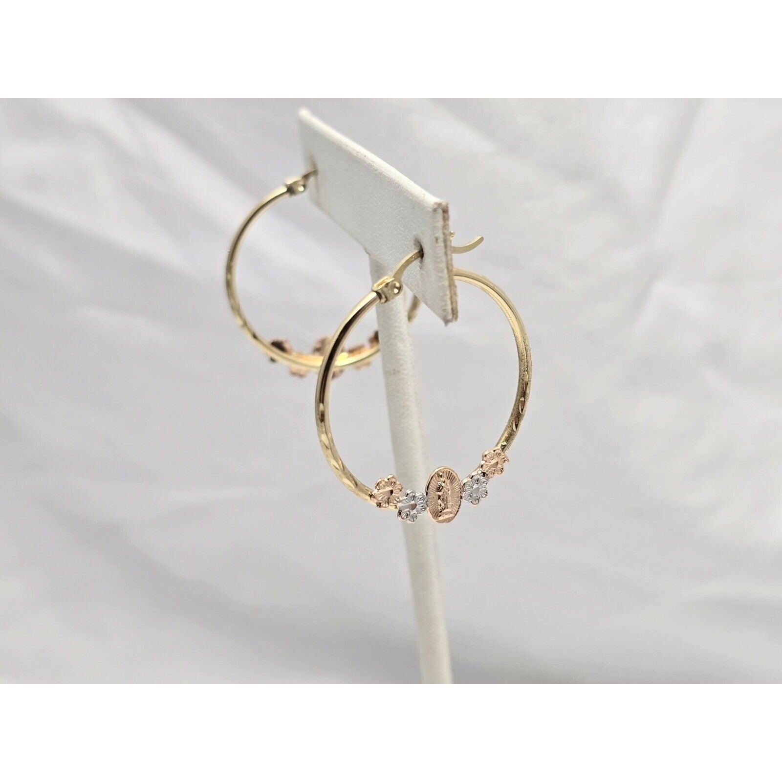 14K Tri Tone Gold Saint Mary Hoop Earrings