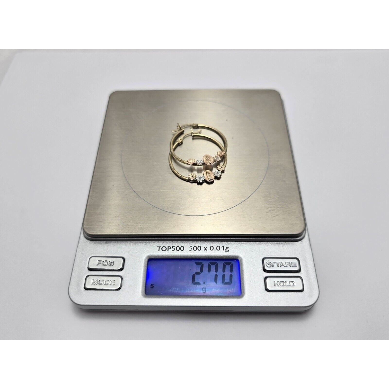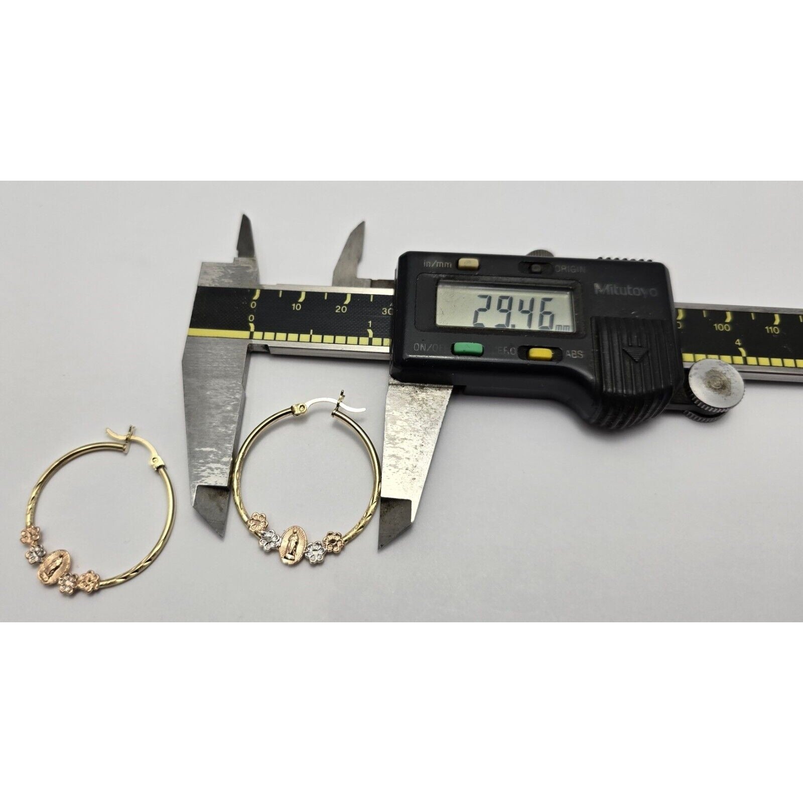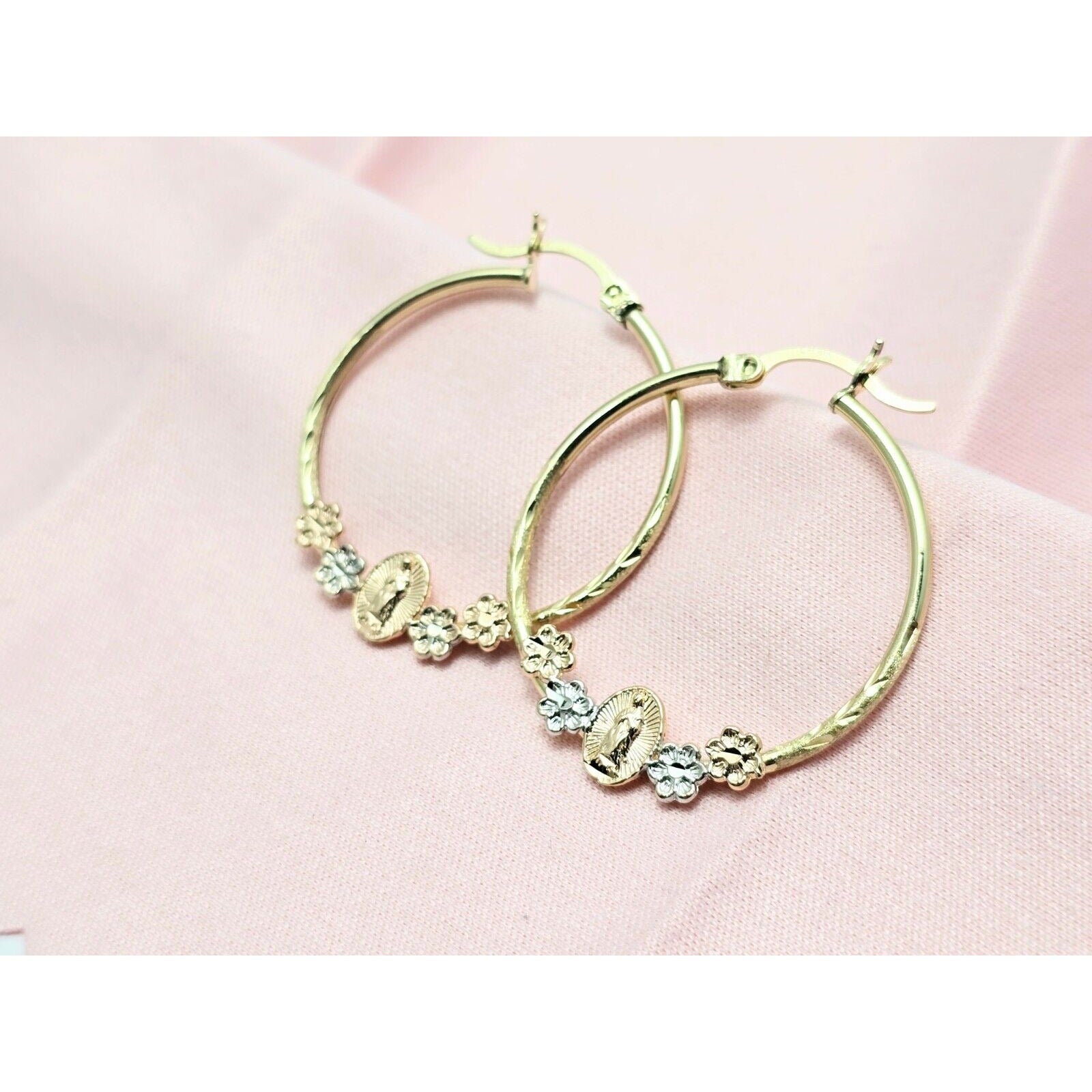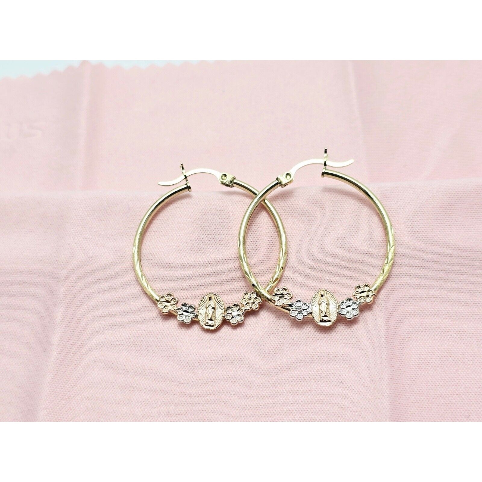 14K Tri Tone Gold Saint Mary Hoop Earrings