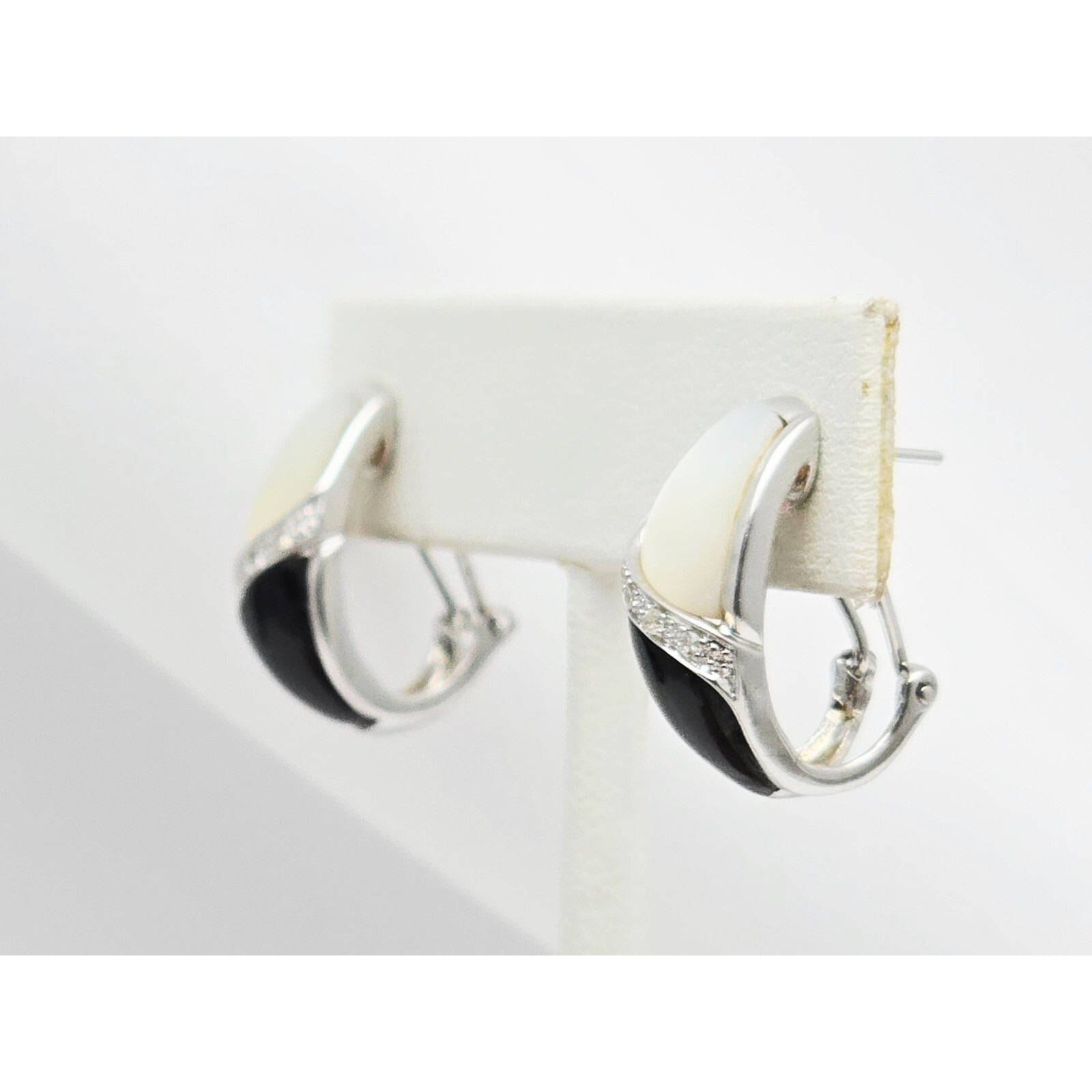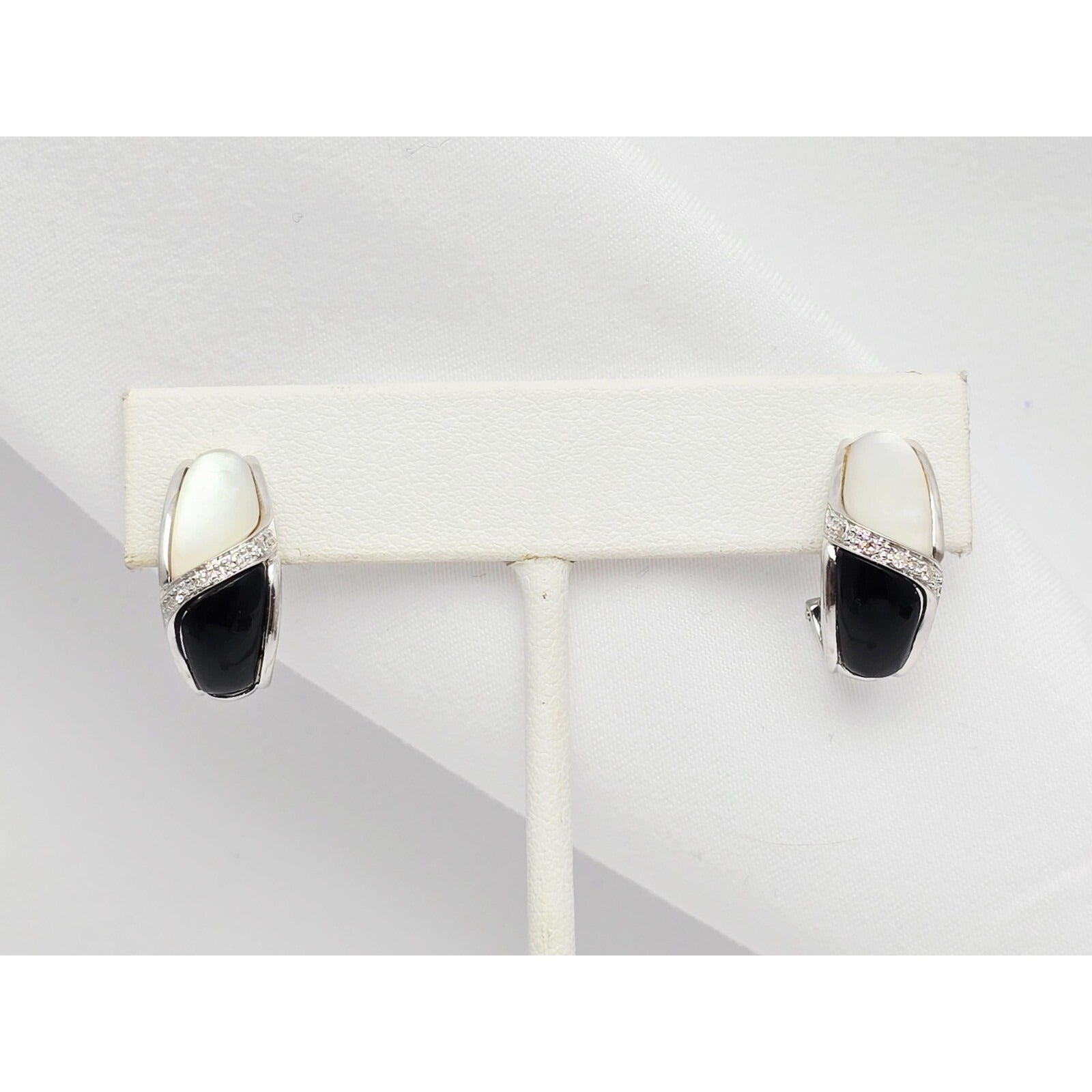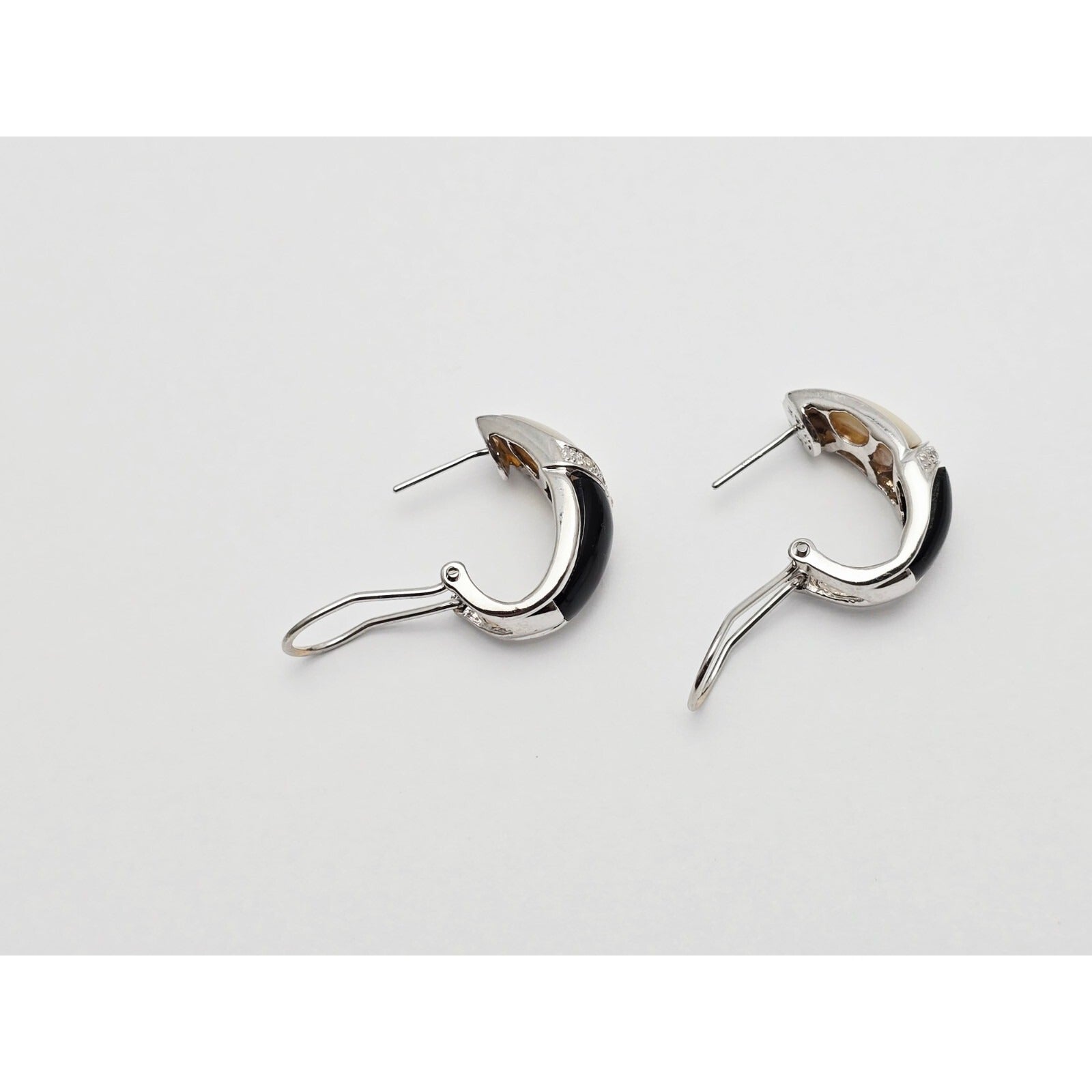 14K White Gold Mother of Pearl, Onyx & Diamond French Clip Earrings