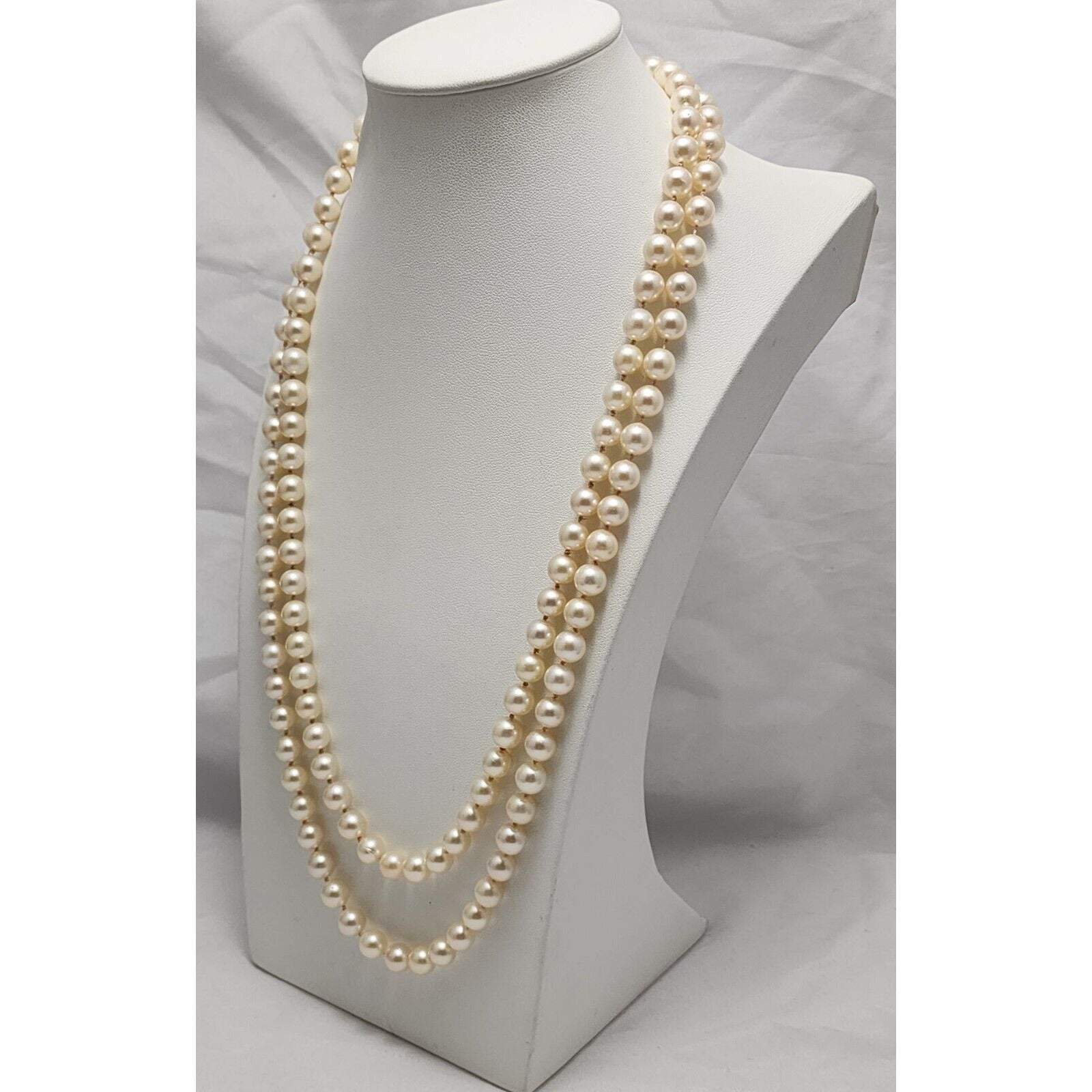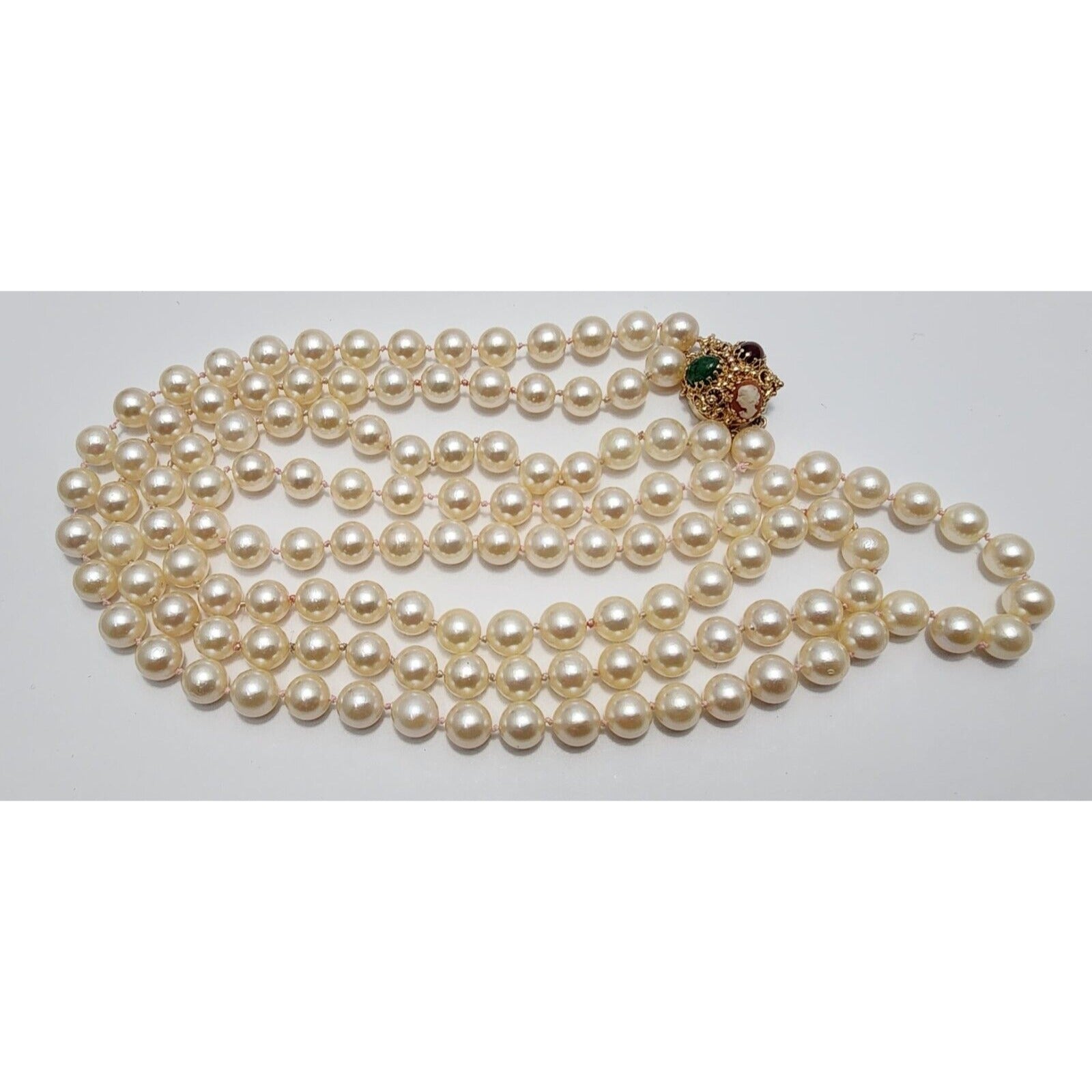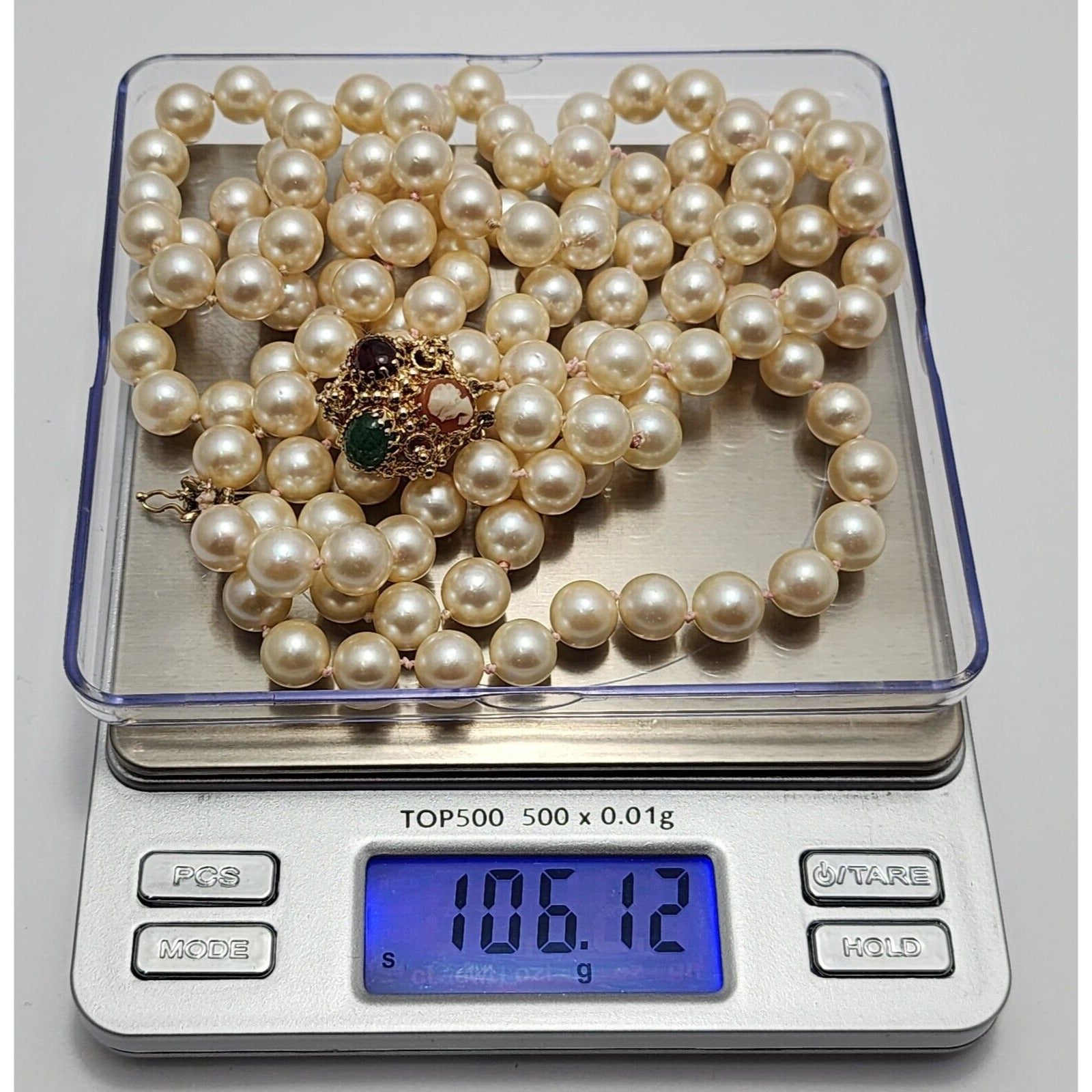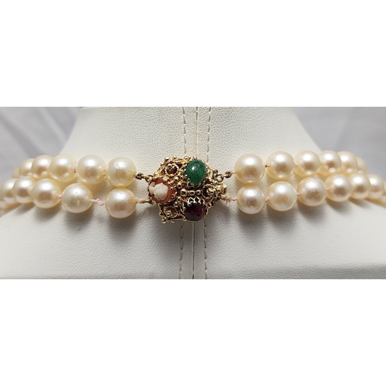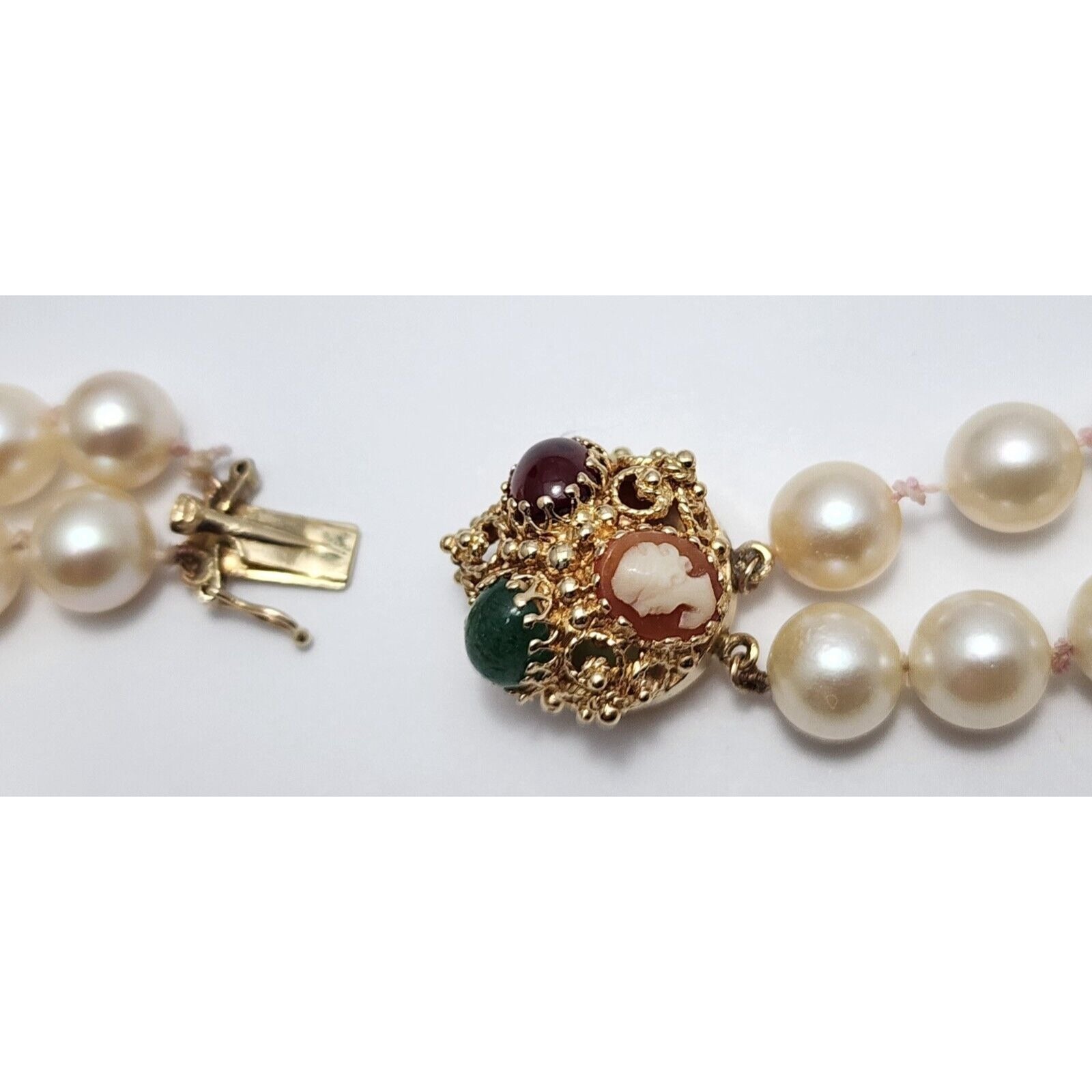 14K Yellow Gold Double Row Pearl, Garnet, Cameo & Jade Chain Necklace