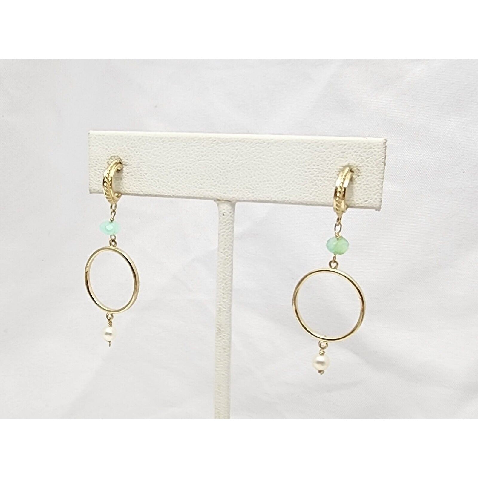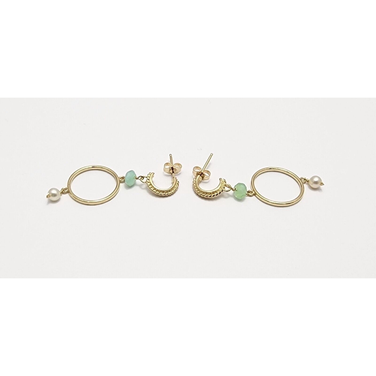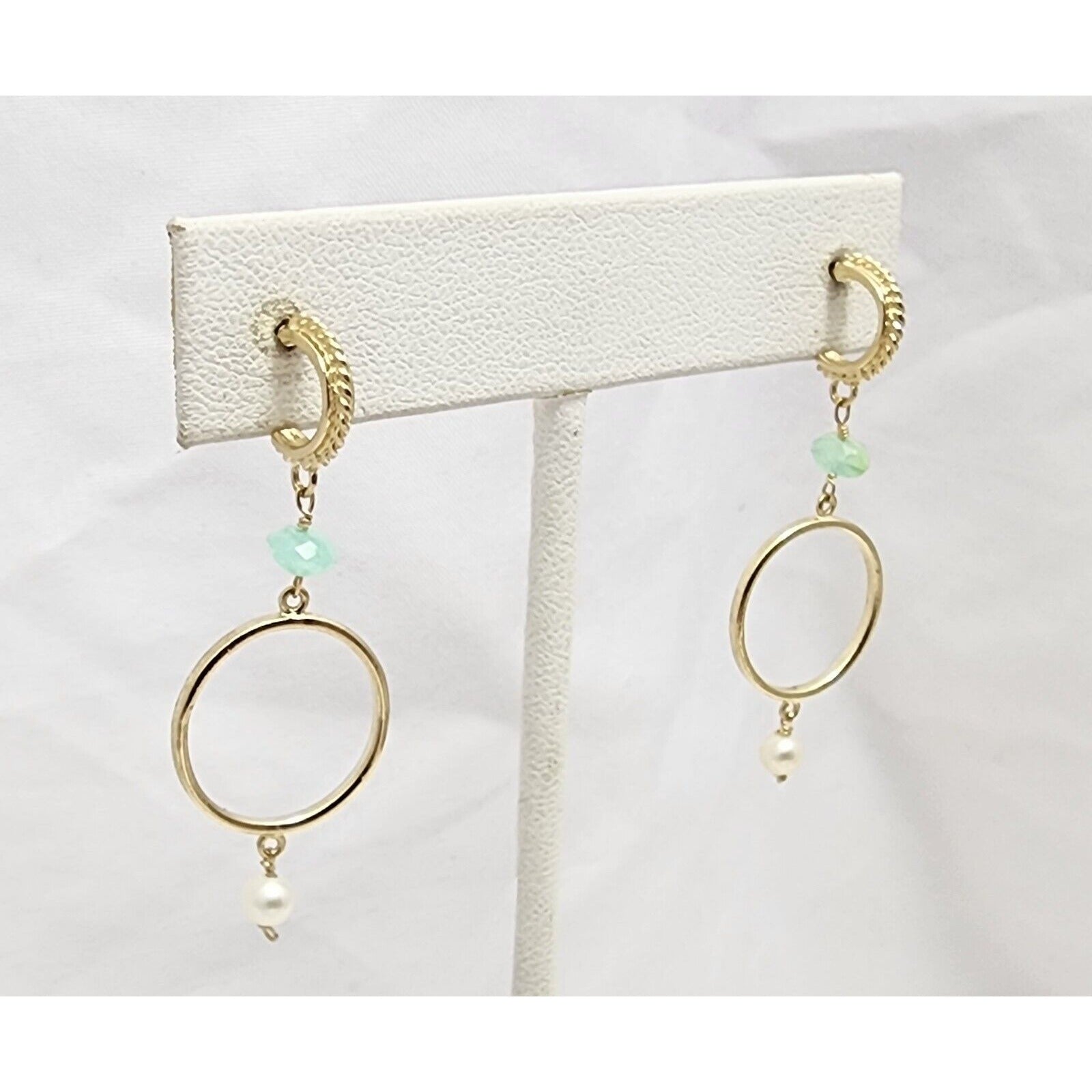 14K Yellow Gold Pearl & Green Crystal Dangle Drop Stud Earrings