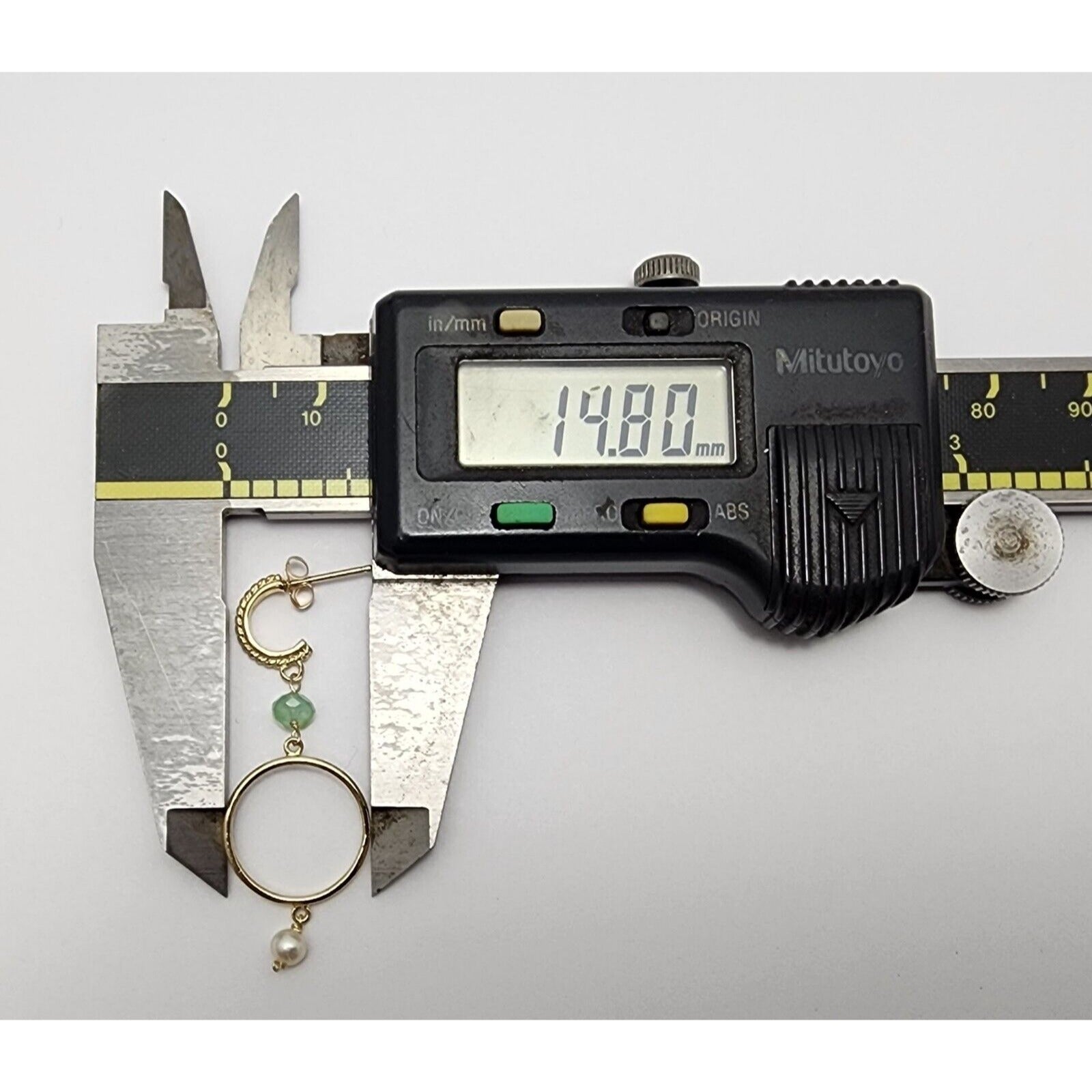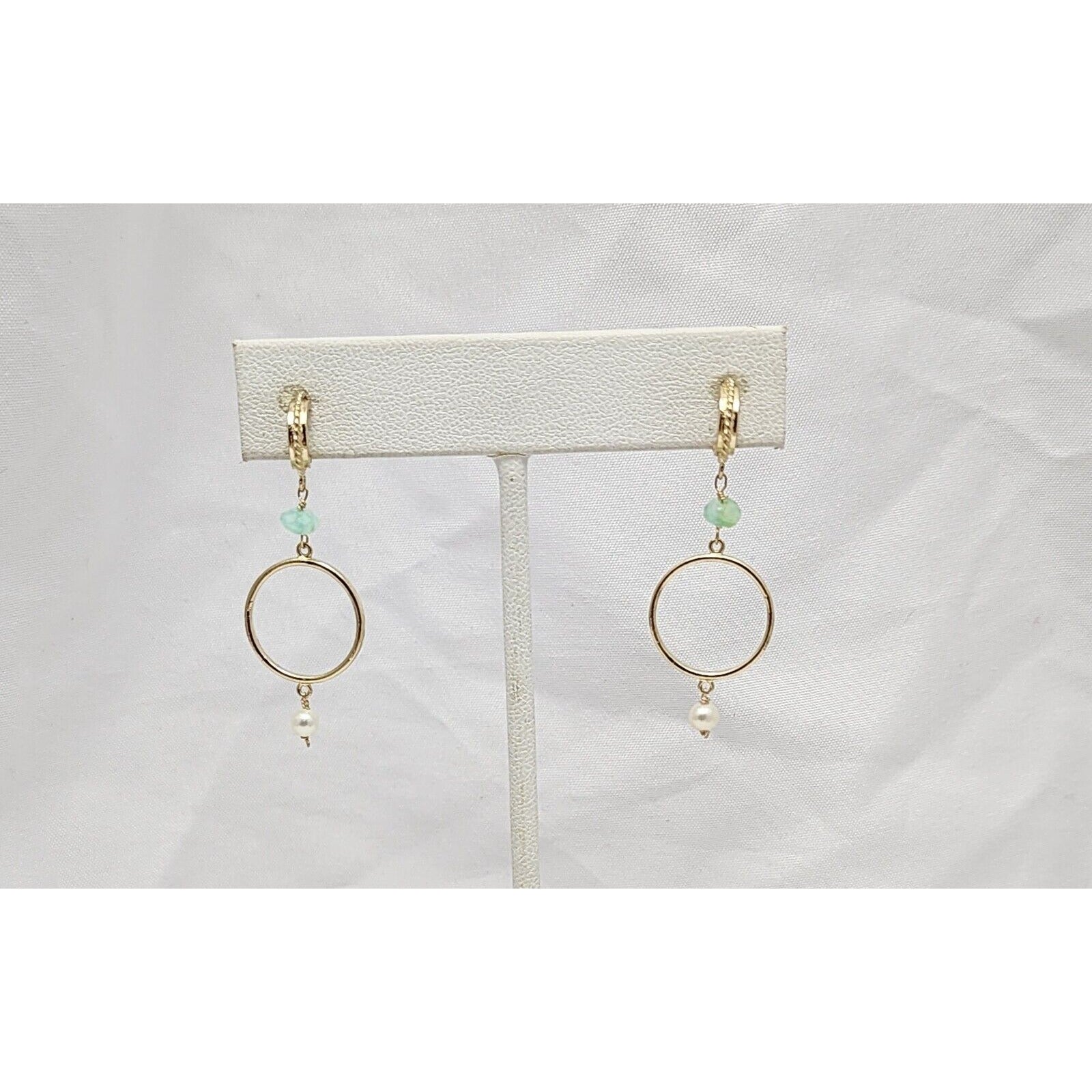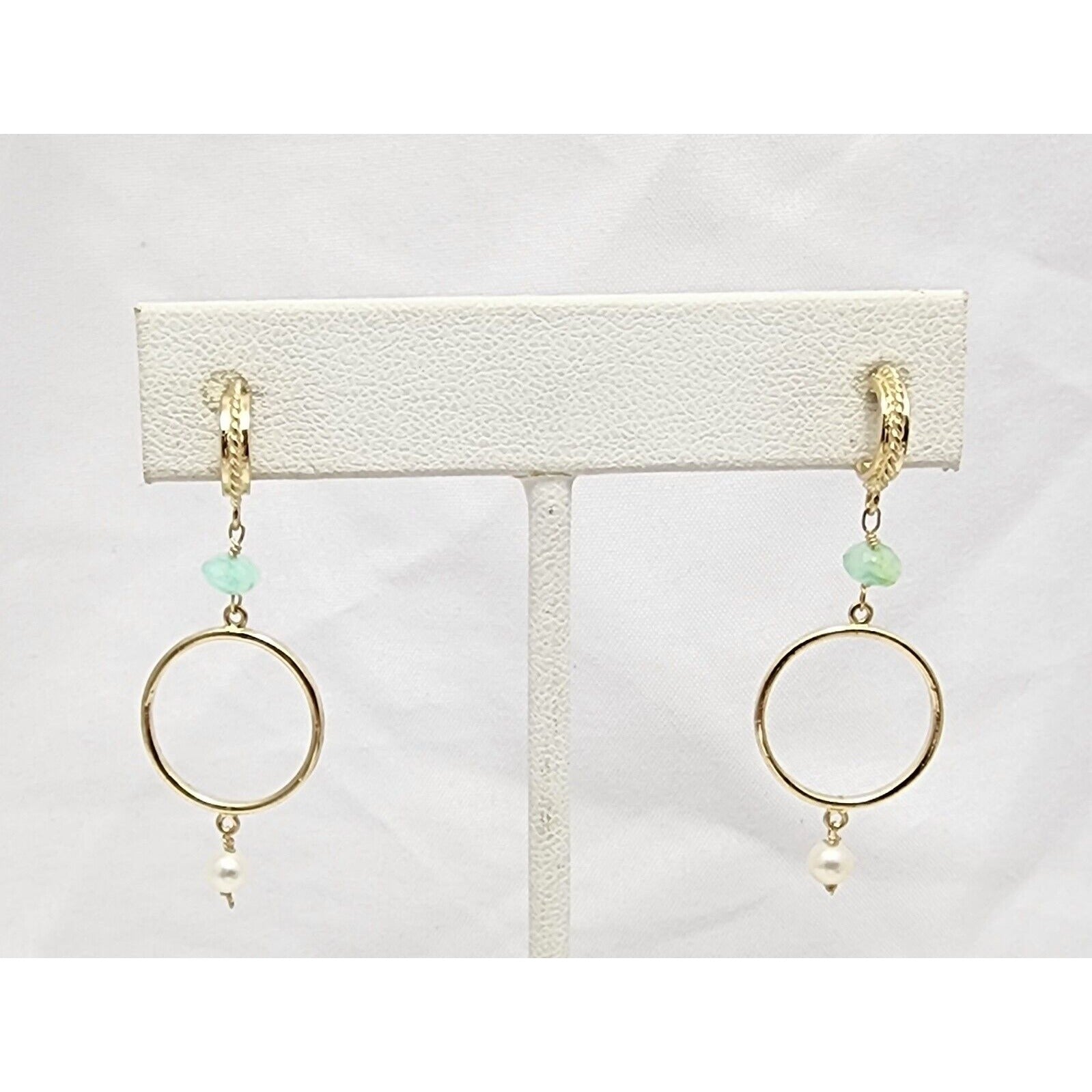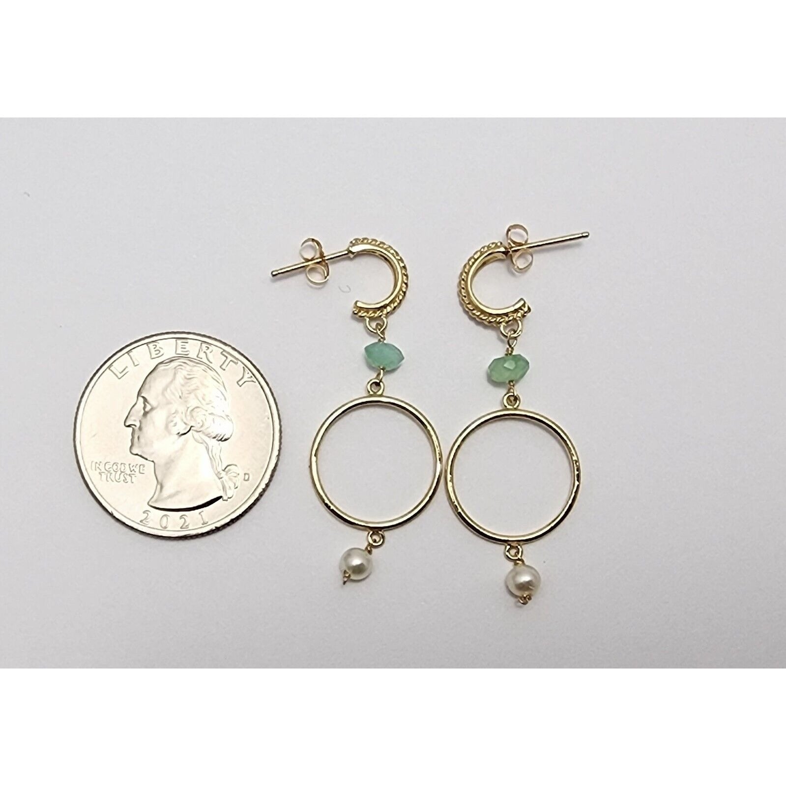 14K Yellow Gold Pearl & Green Crystal Dangle Drop Stud Earrings