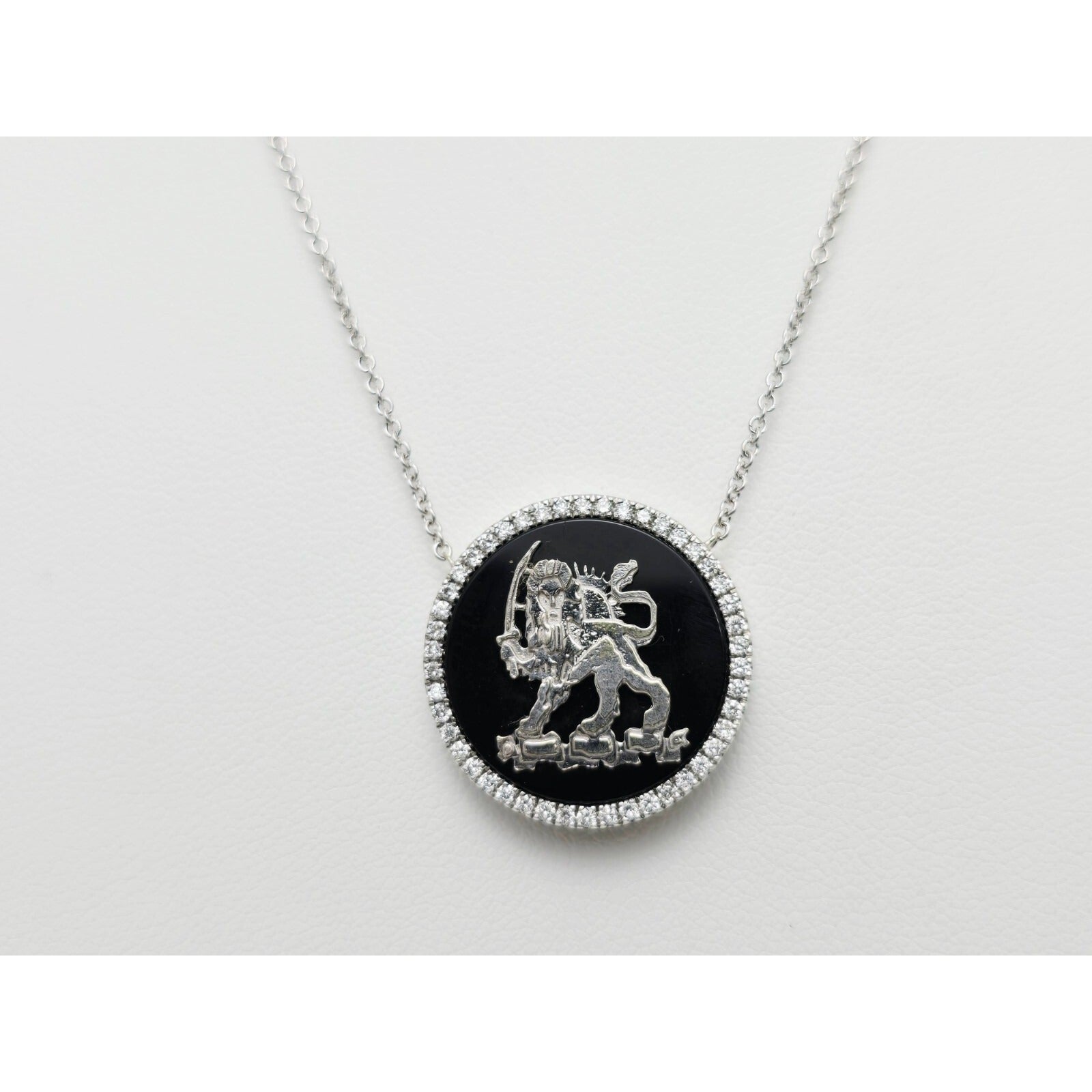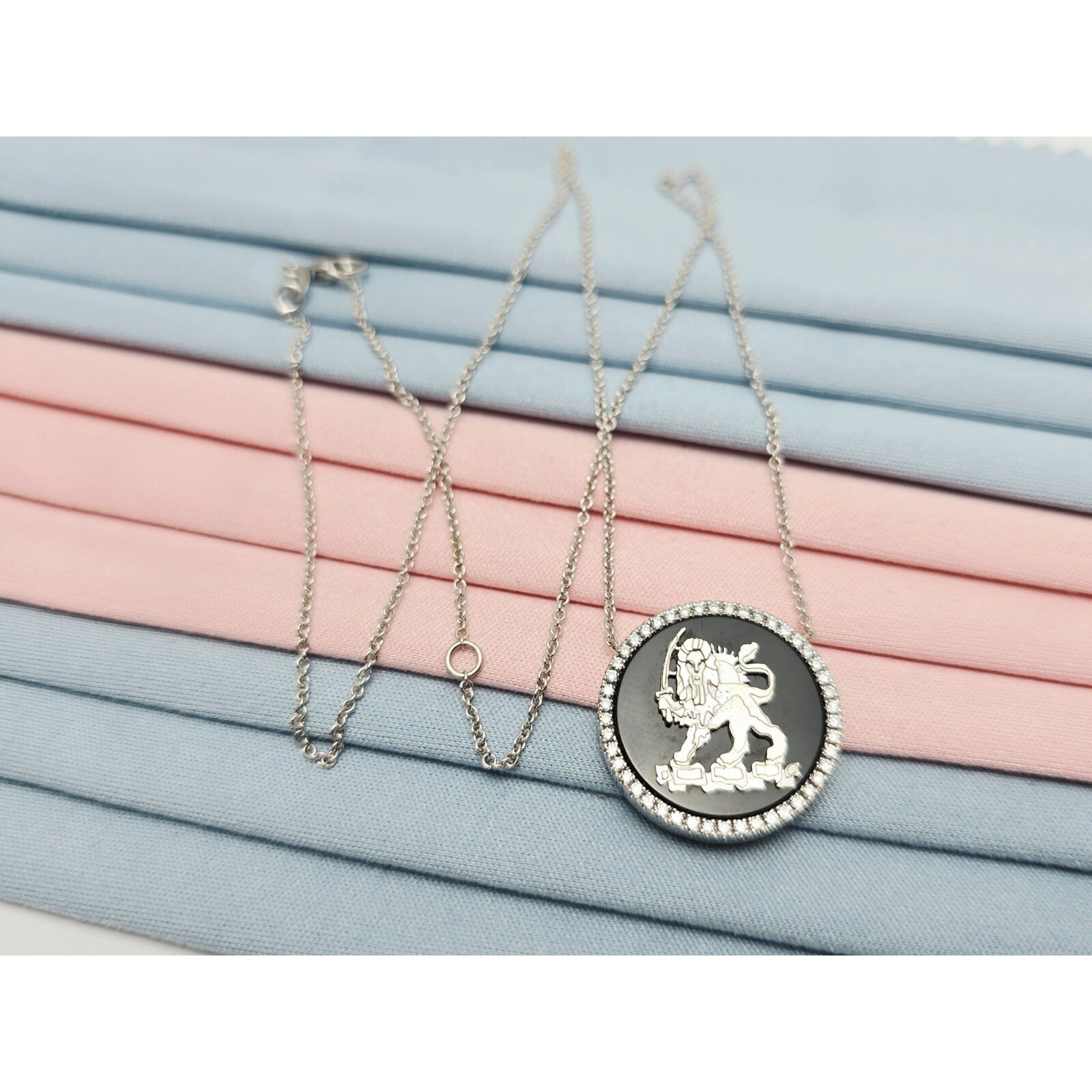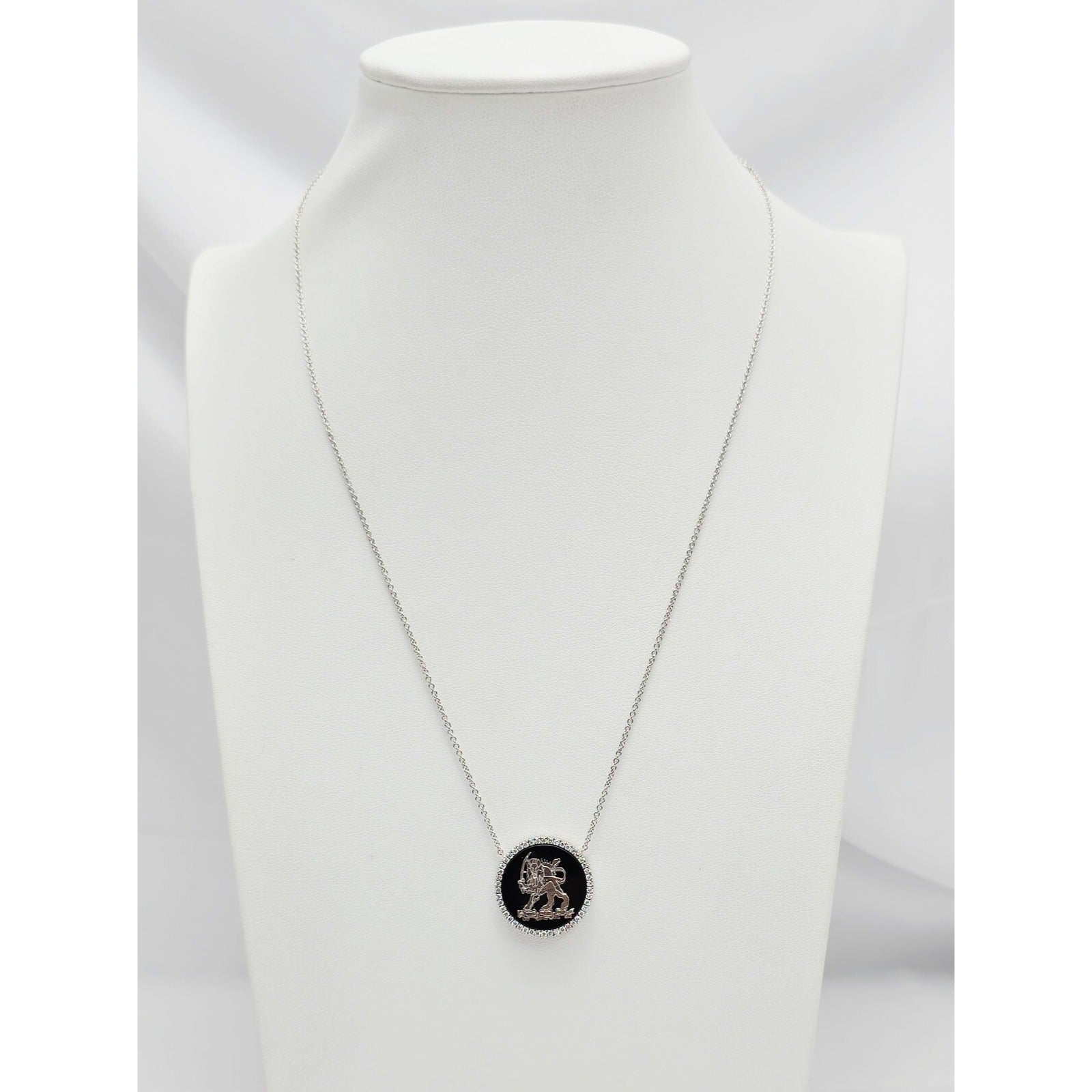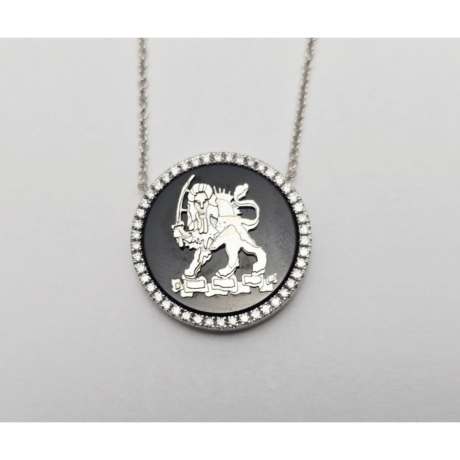 18K White Gold Iran Lion & Sun Onyx & Diamond Pendant Resizable Link Necklace