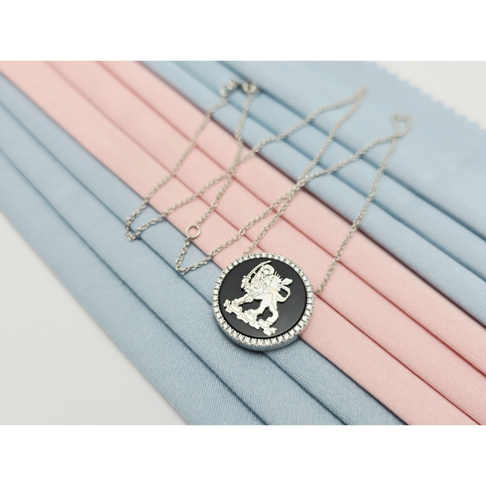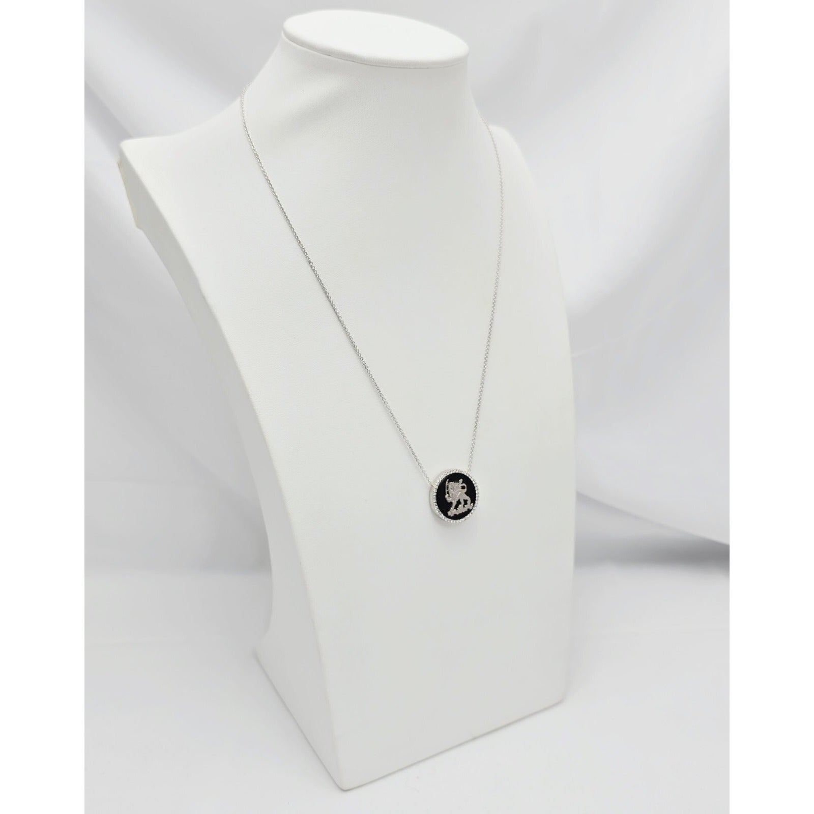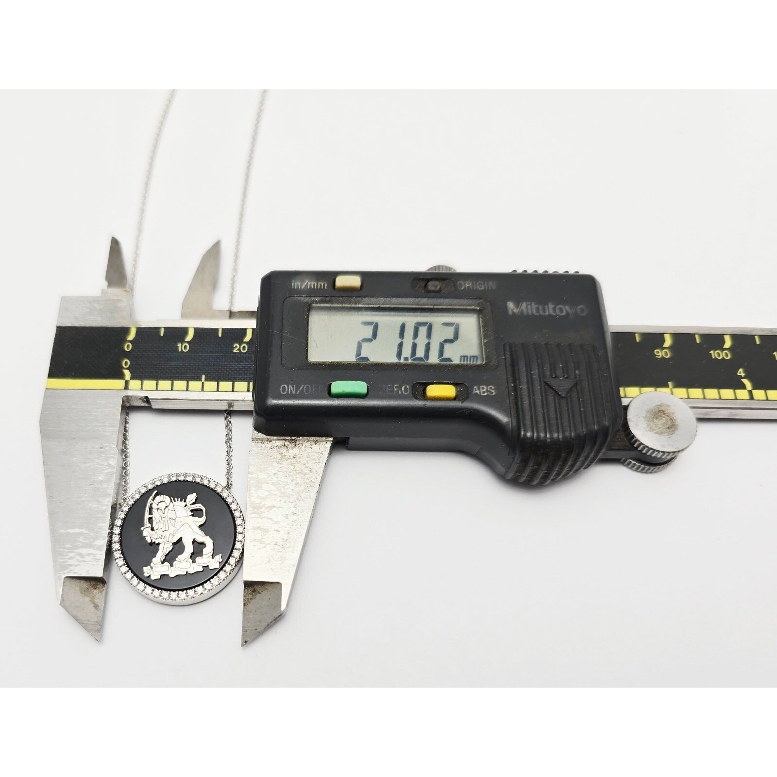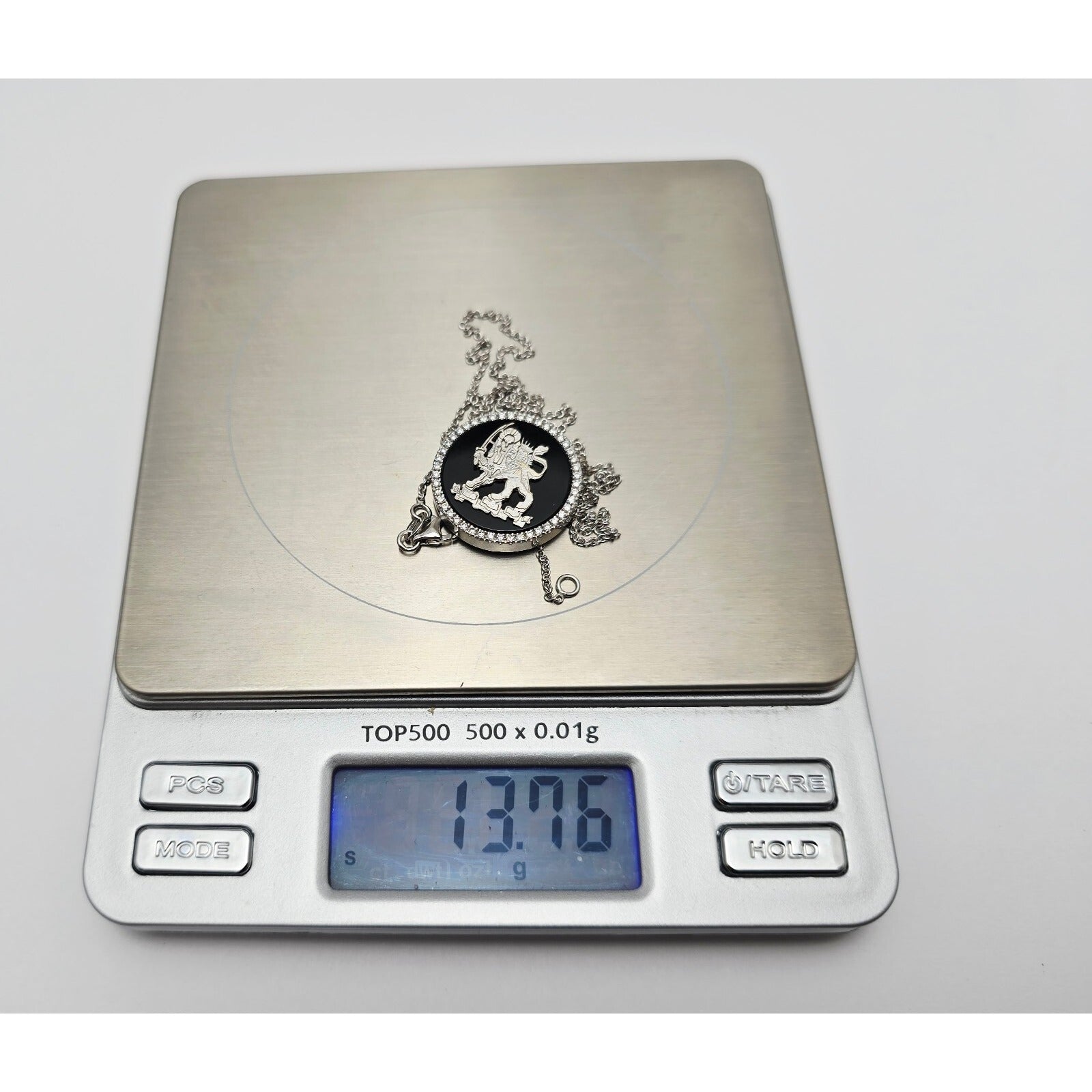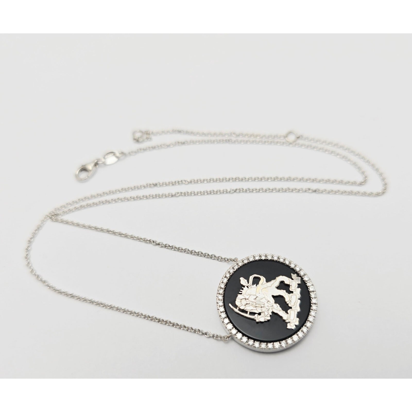 18K White Gold Iran Lion & Sun Onyx & Diamond Pendant Resizable Link Necklace