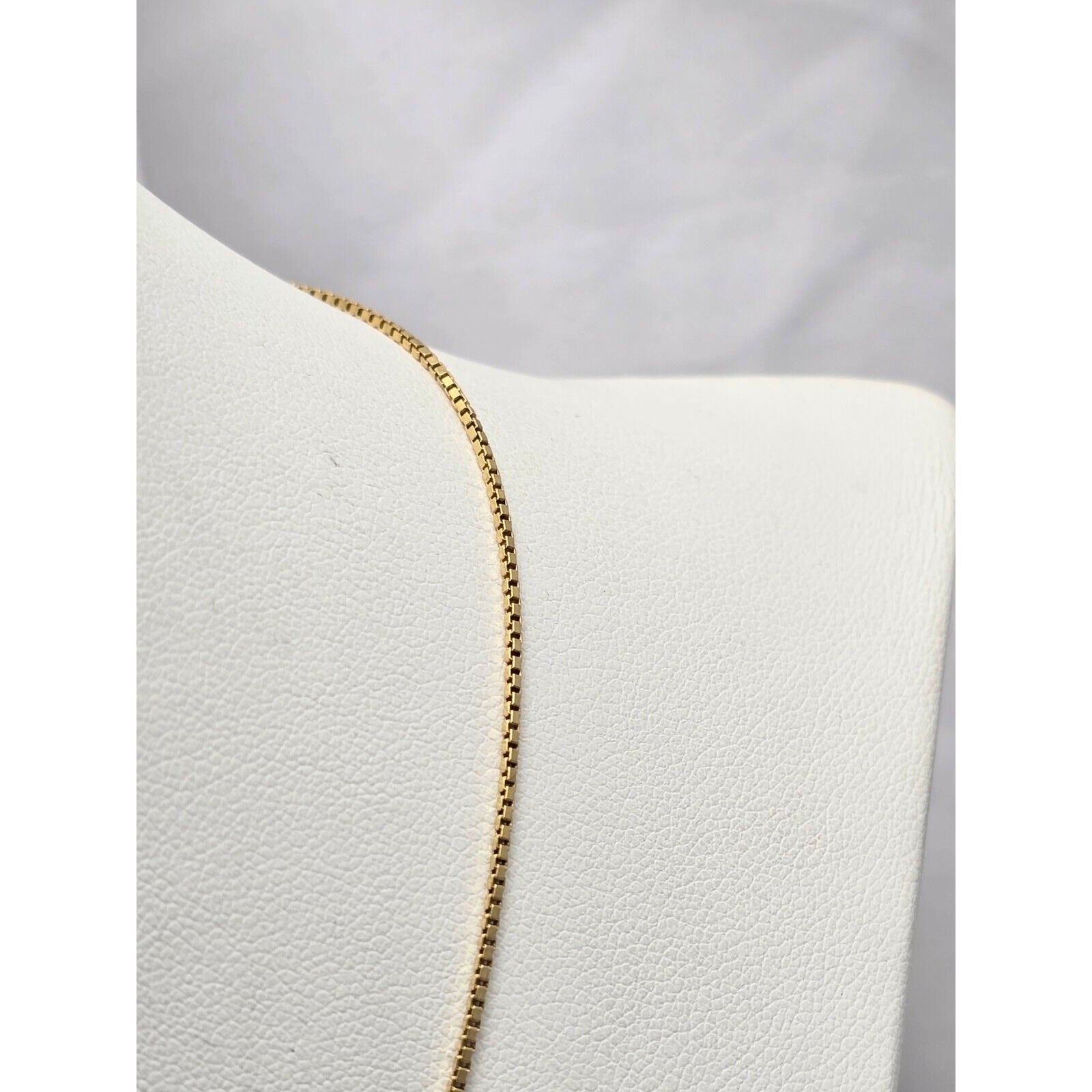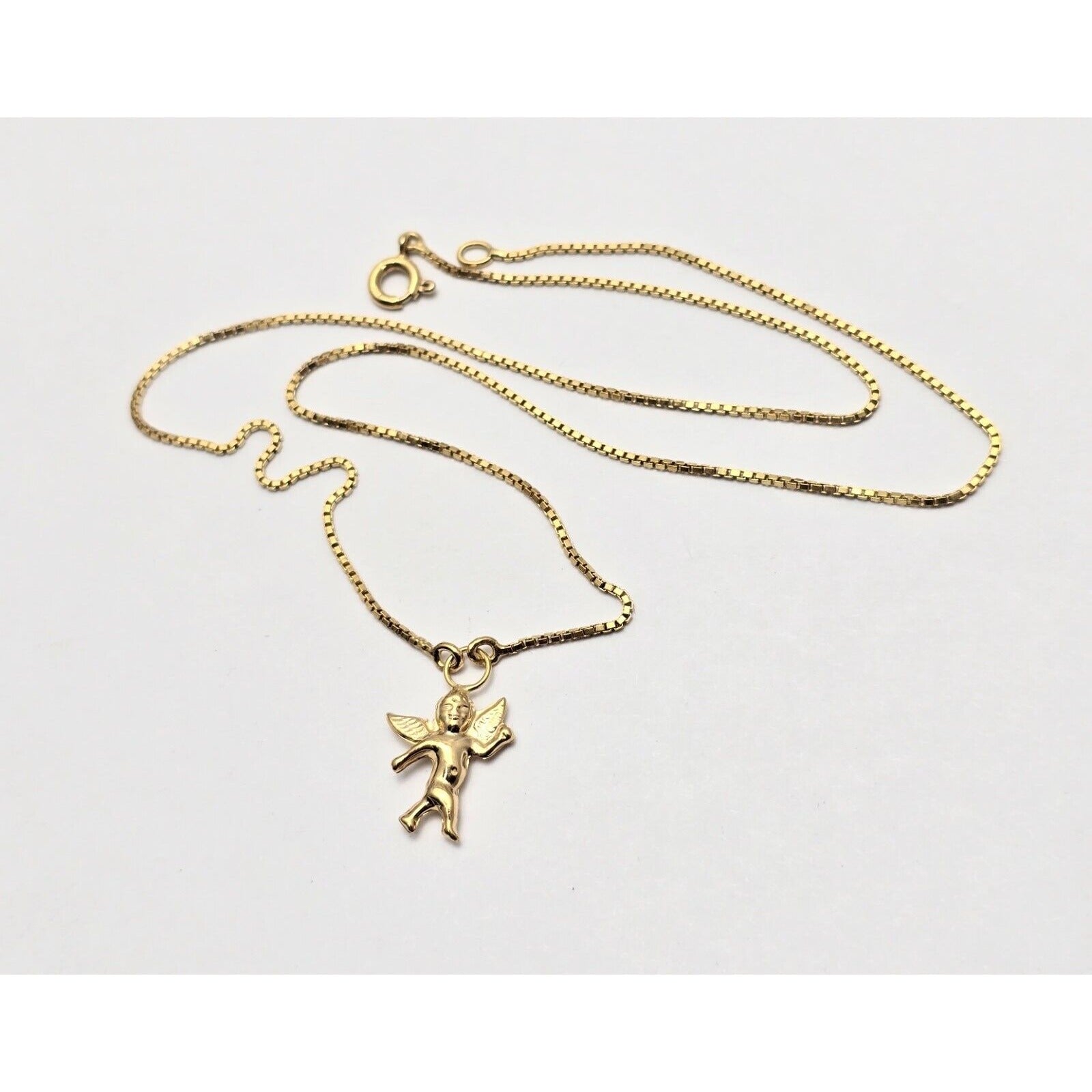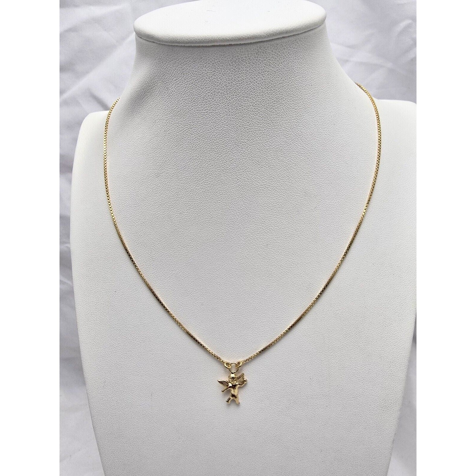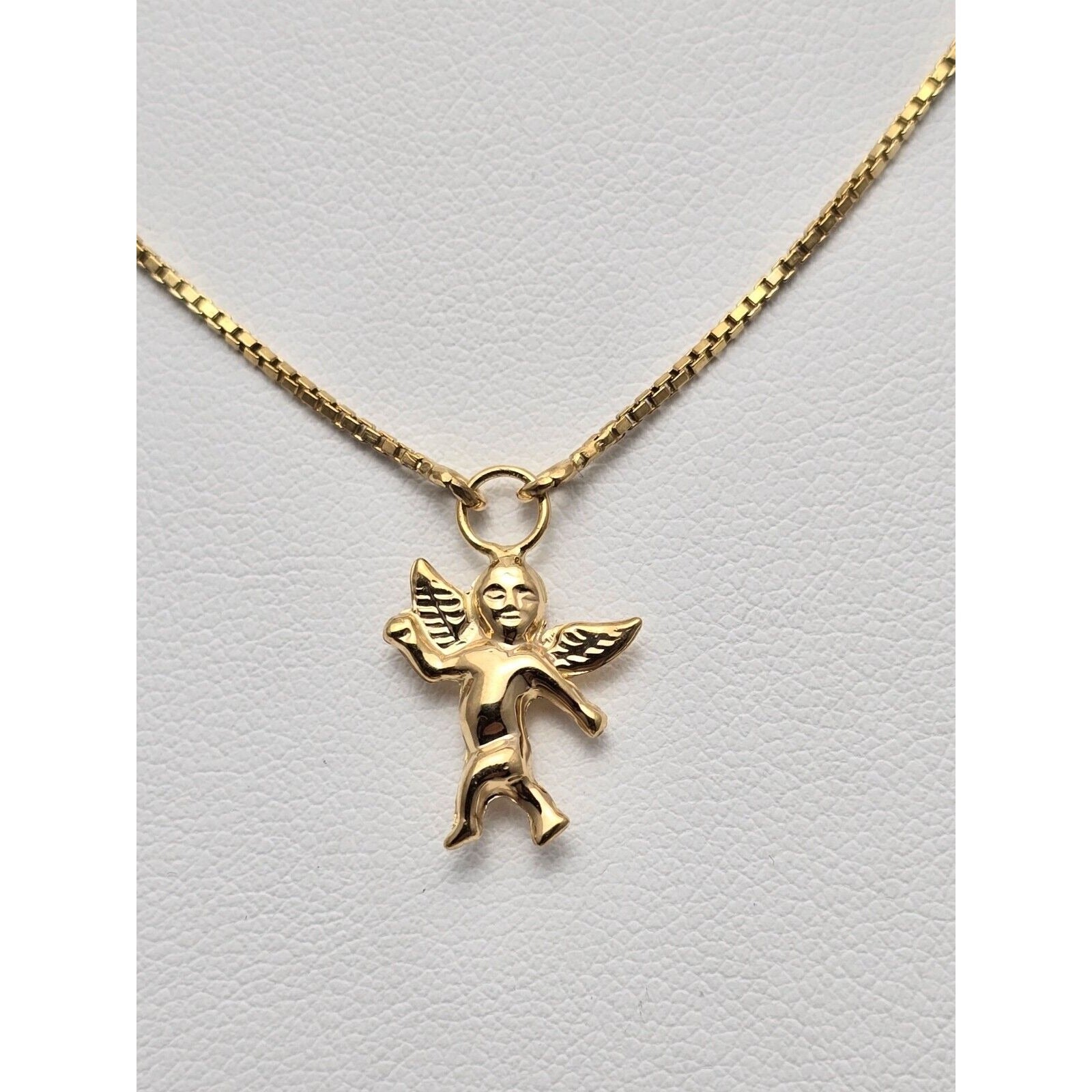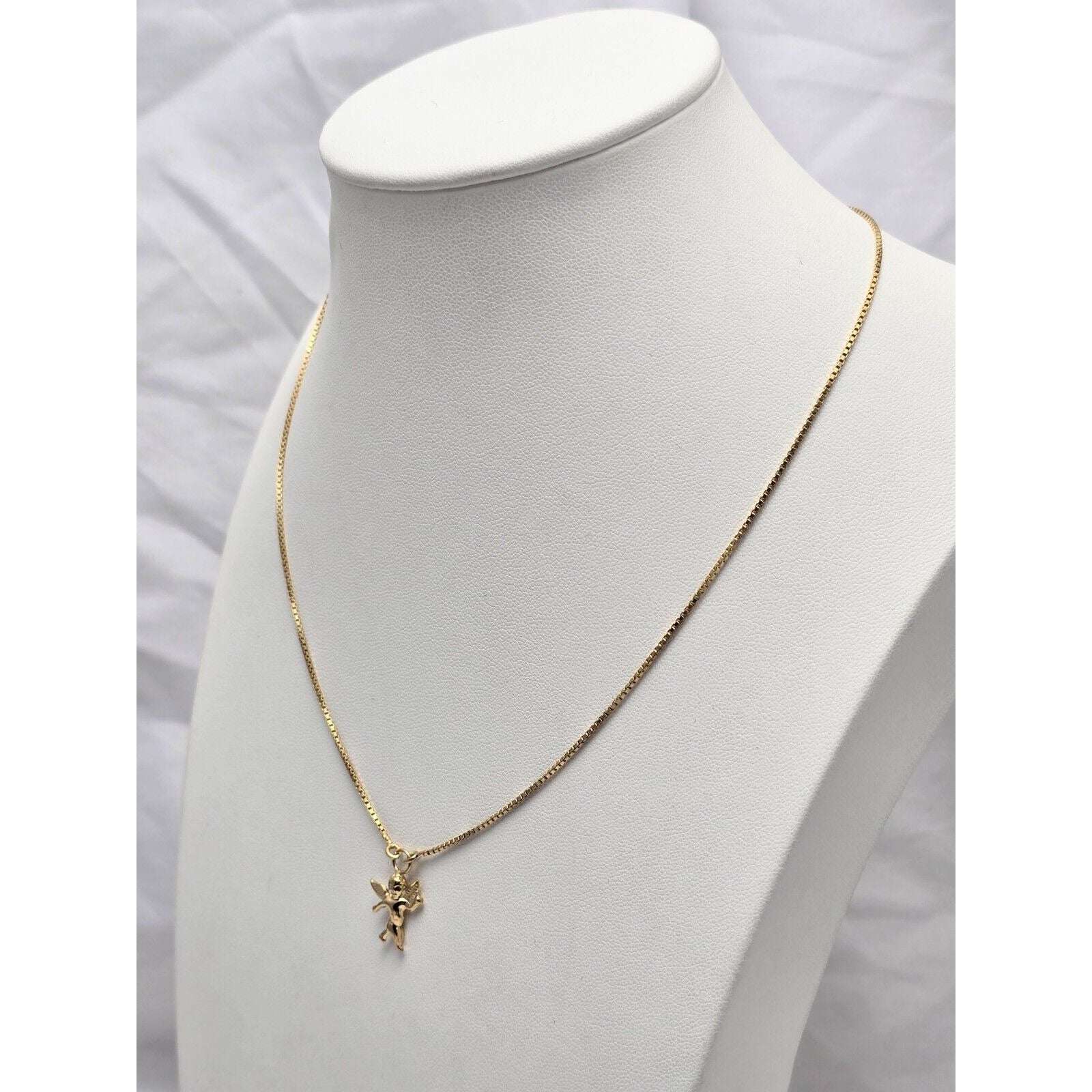 18K Yellow Gold Box Link Chain Necklace & Baby Angel Charm Pendant