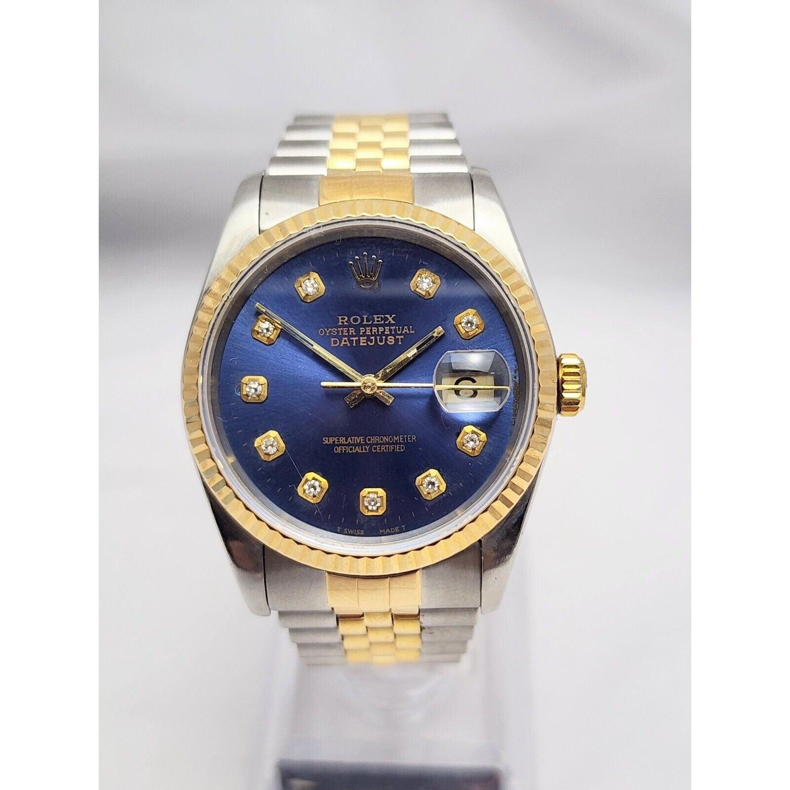 1990 Rolex Datejust 36mm 16233 Navy Blue Diamond Dial Two Tone Jubilee Watch