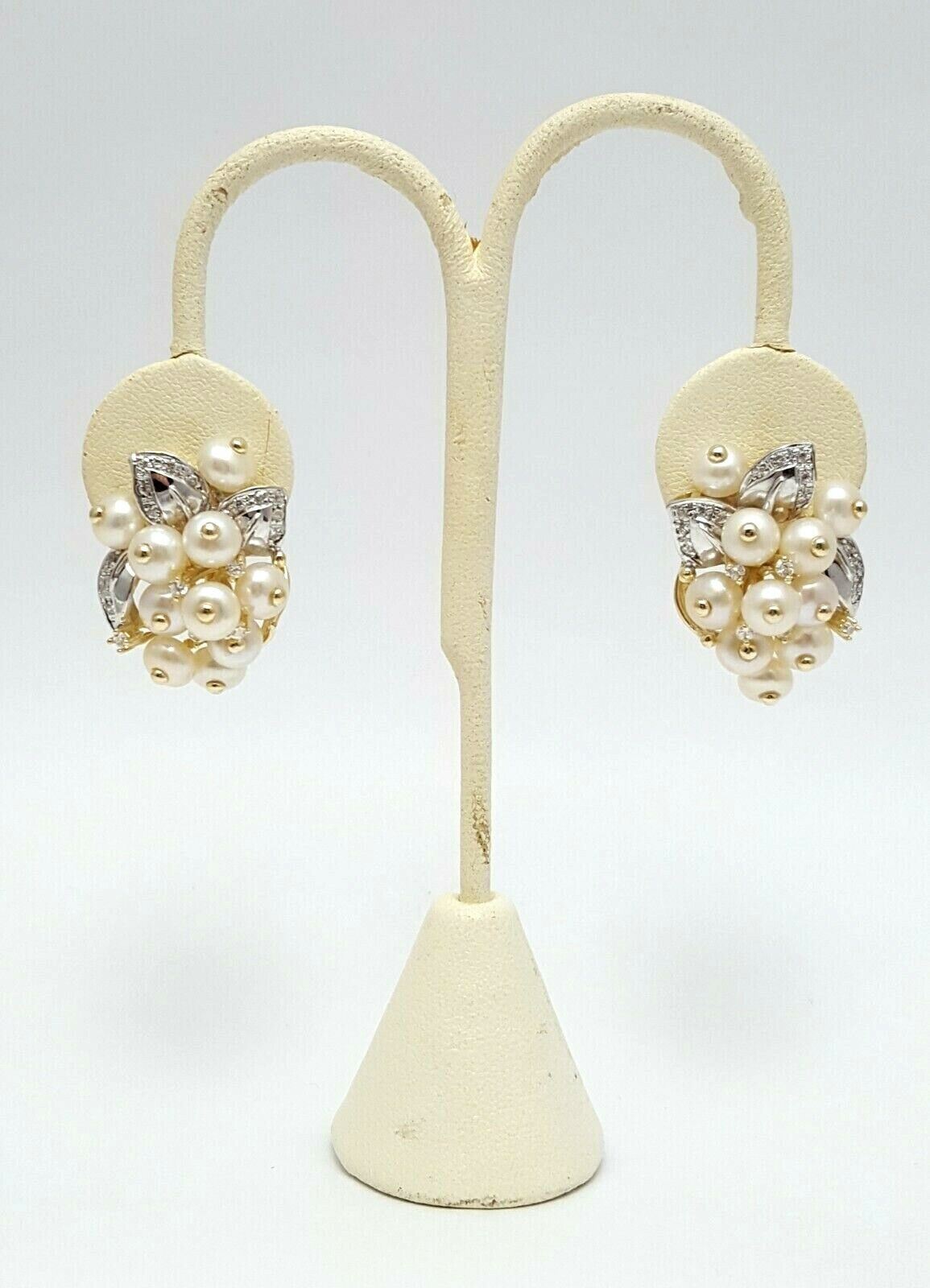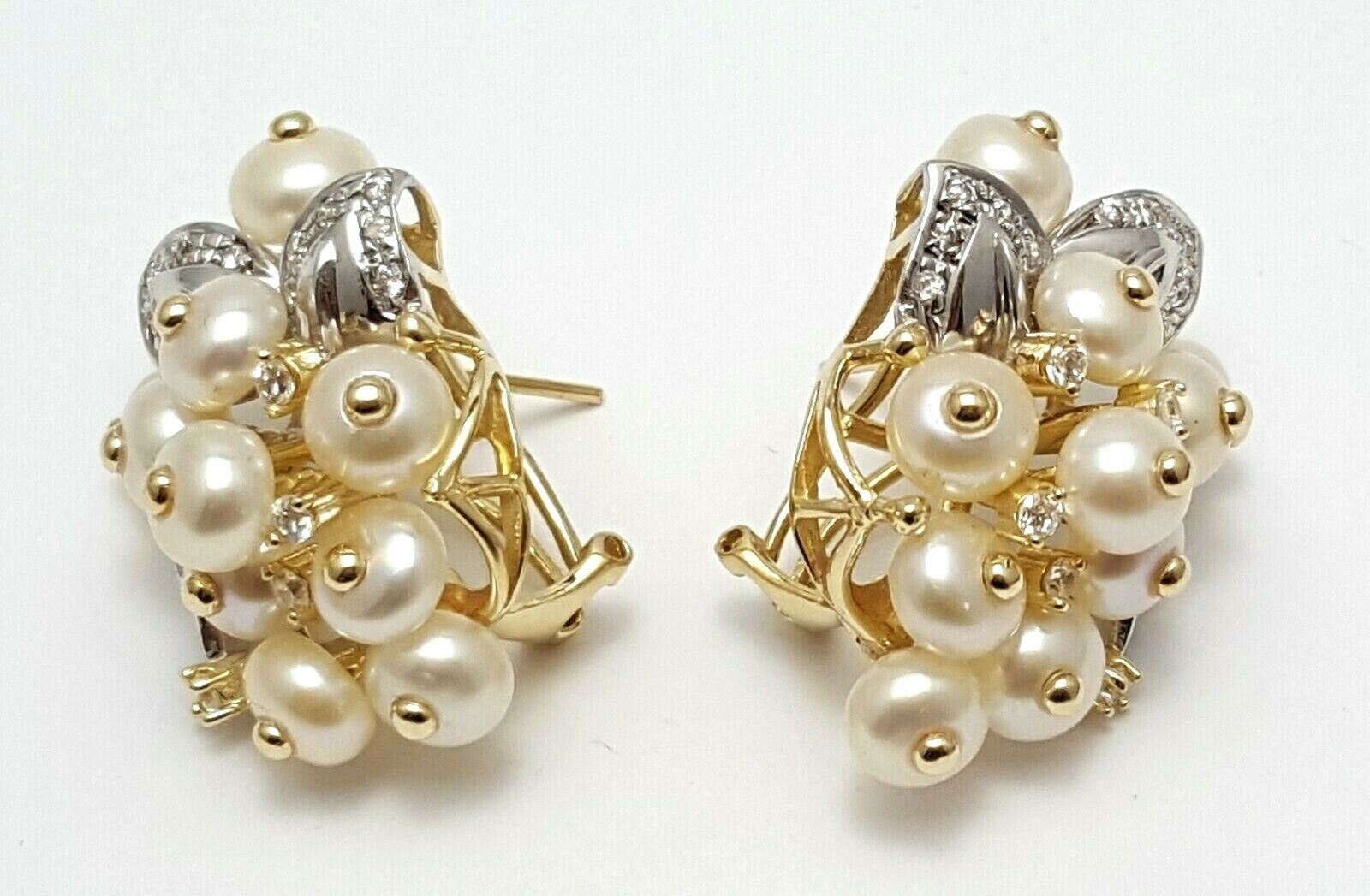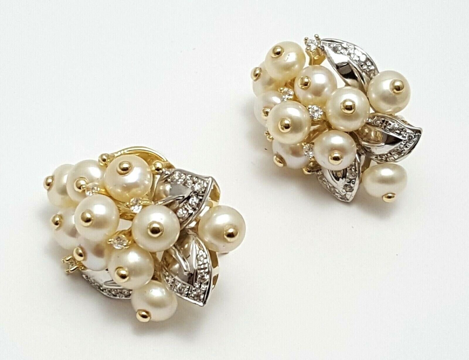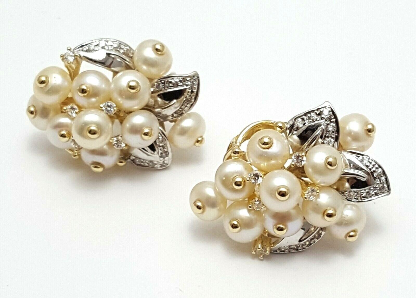 14K Two Tone Gold Ladies Cubic Zirconia & Pearls Earrings