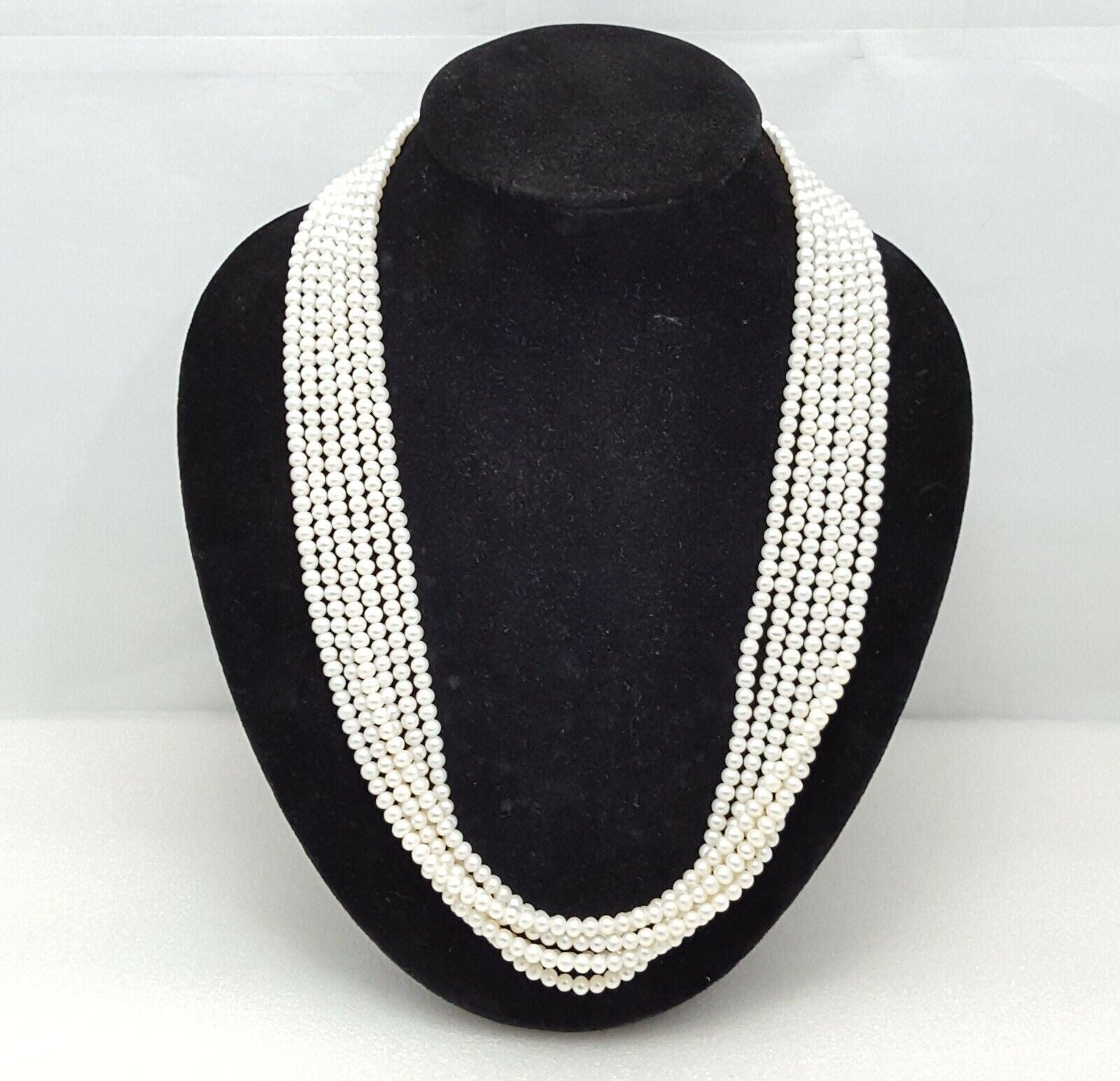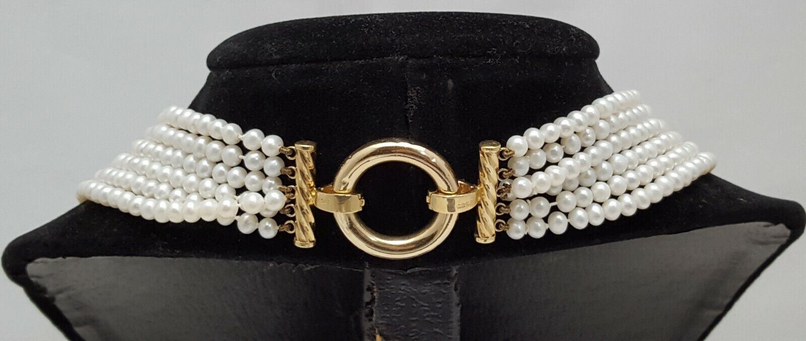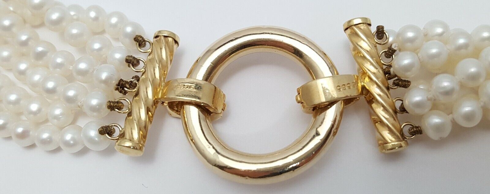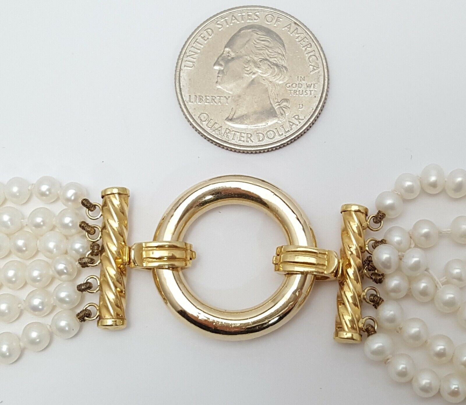 14K Yellow Gold Graduated 6 Six Strand Row Pearl Necklace