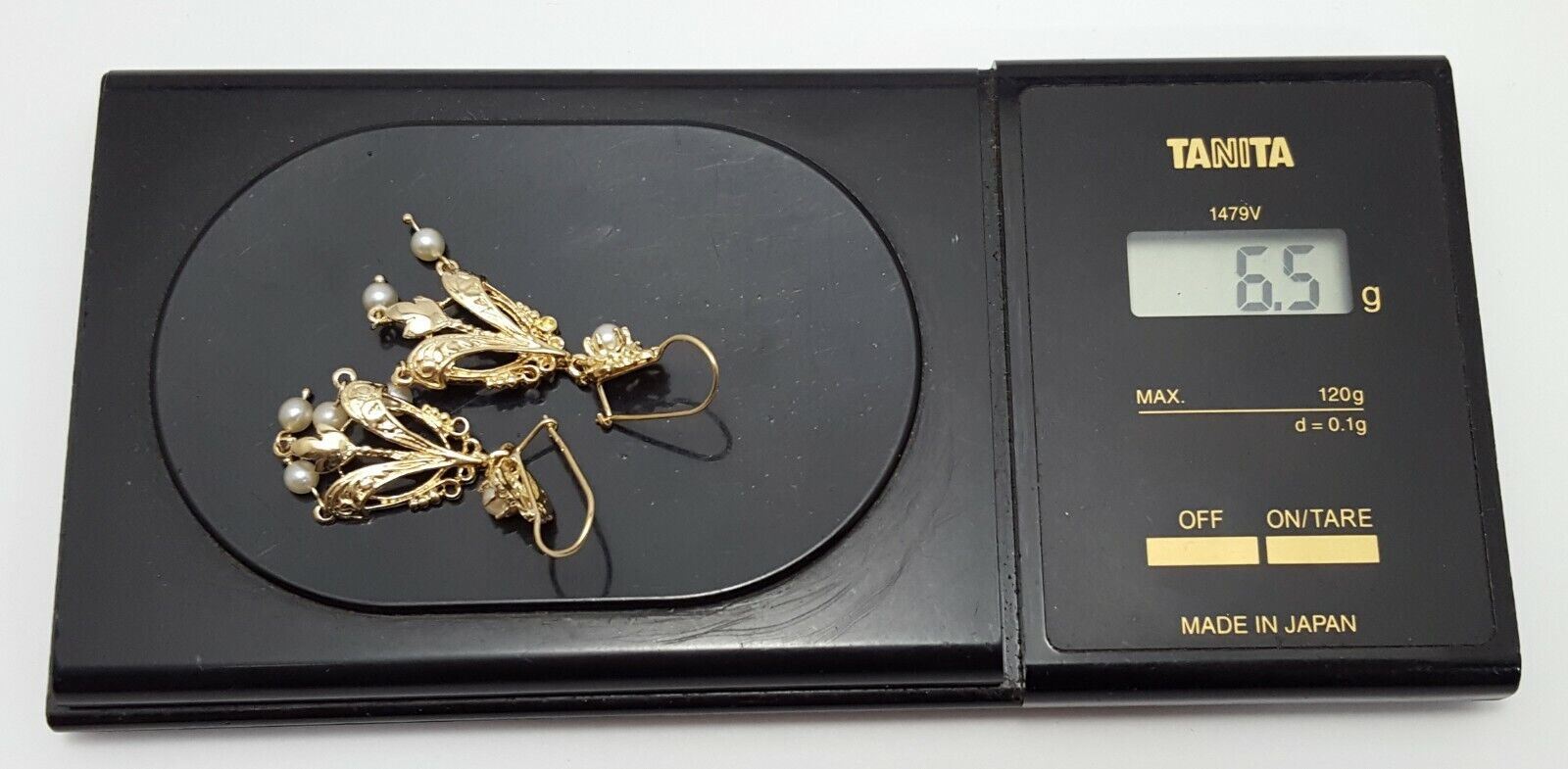 14K Yellow Gold Designer Dangle Hanging Pearl Earrings