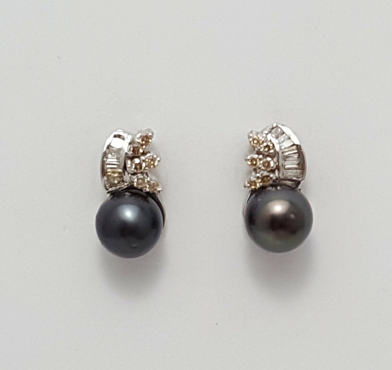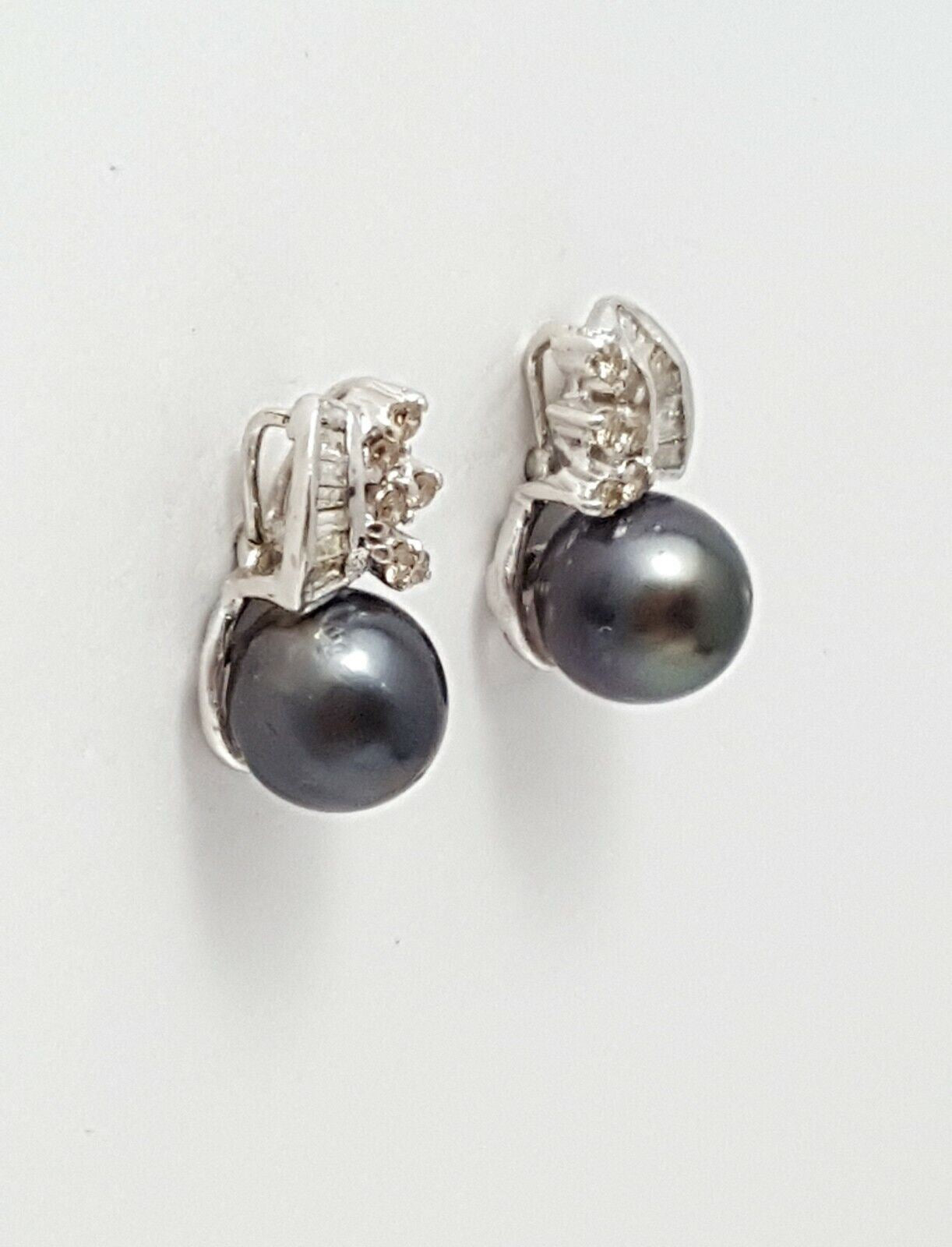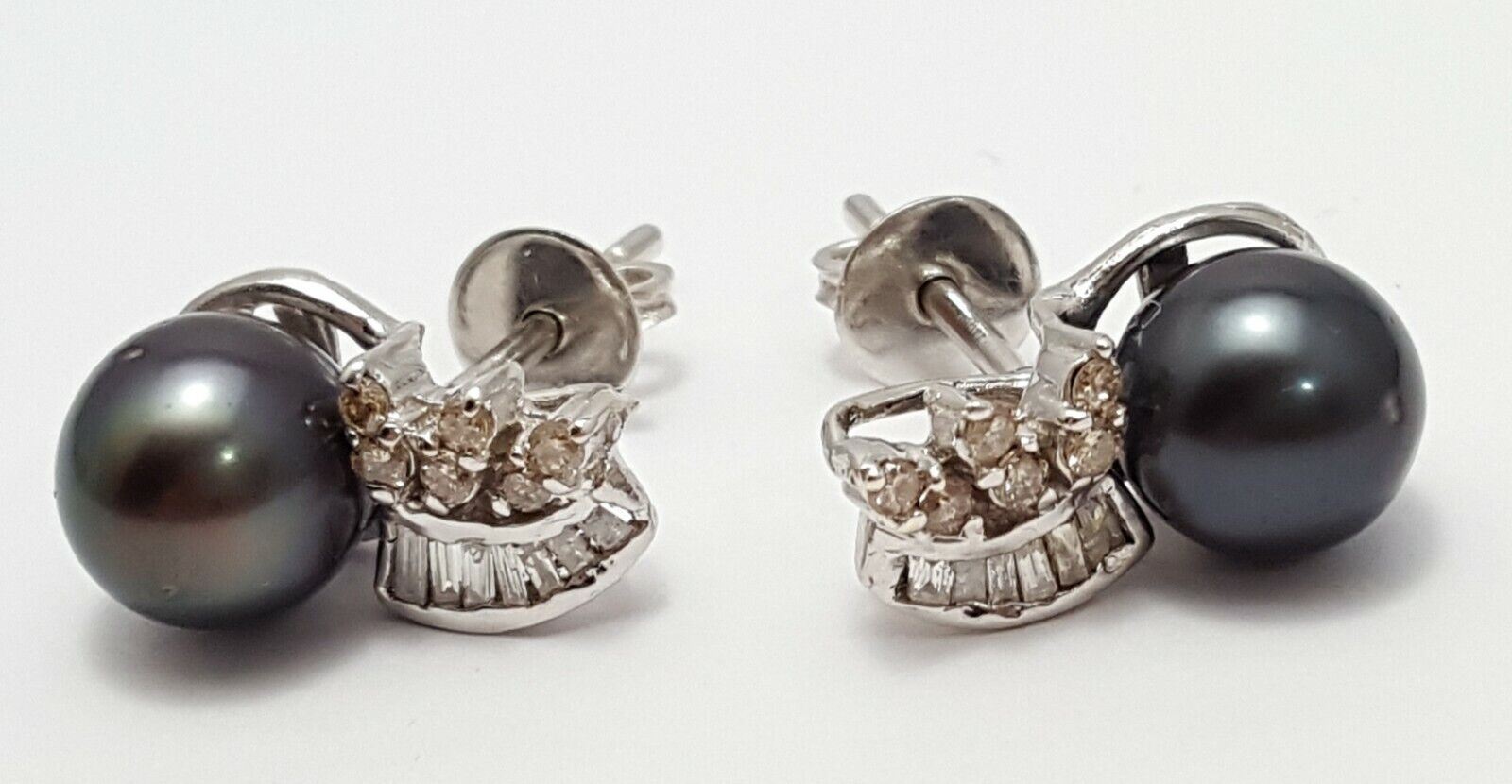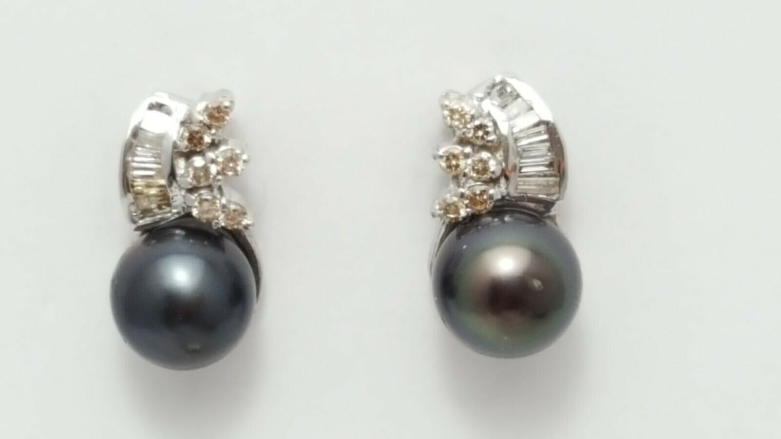 14K White Gold Designer Stud Tahitian Pearl & Diamonds Earrings