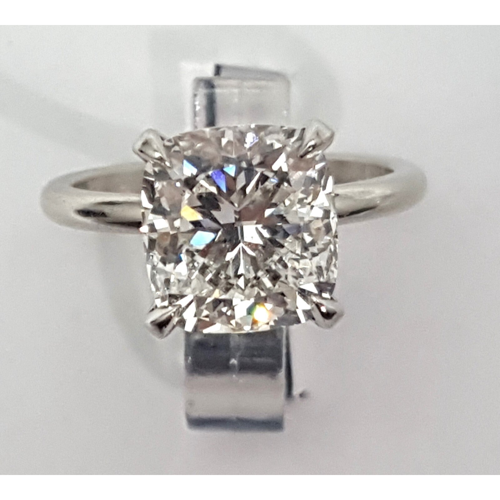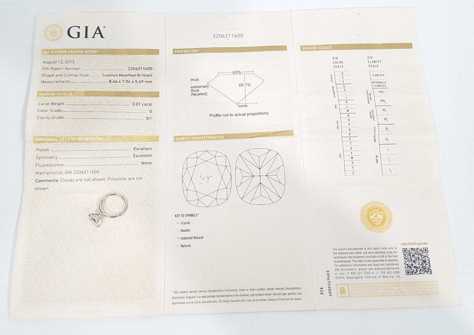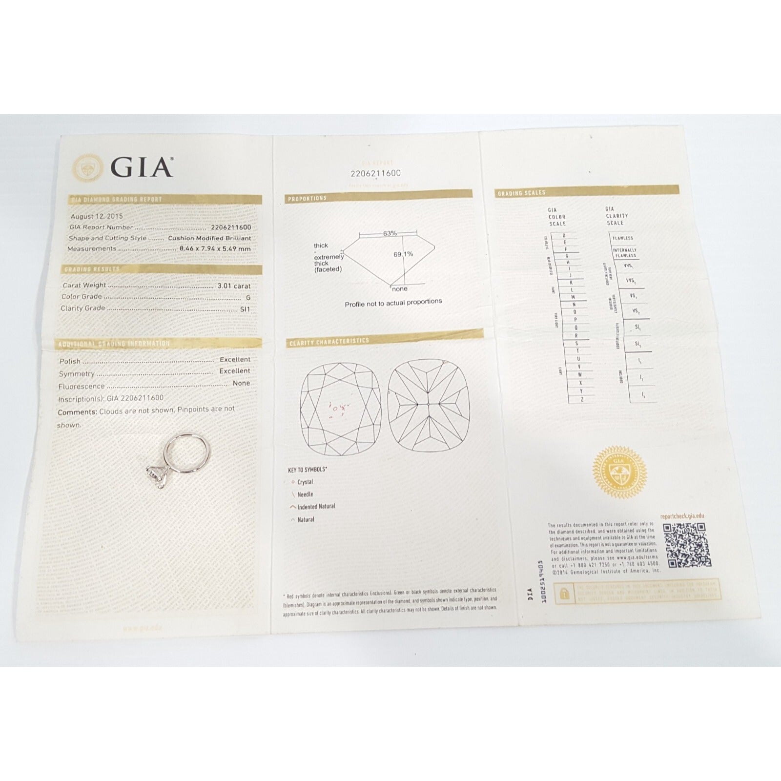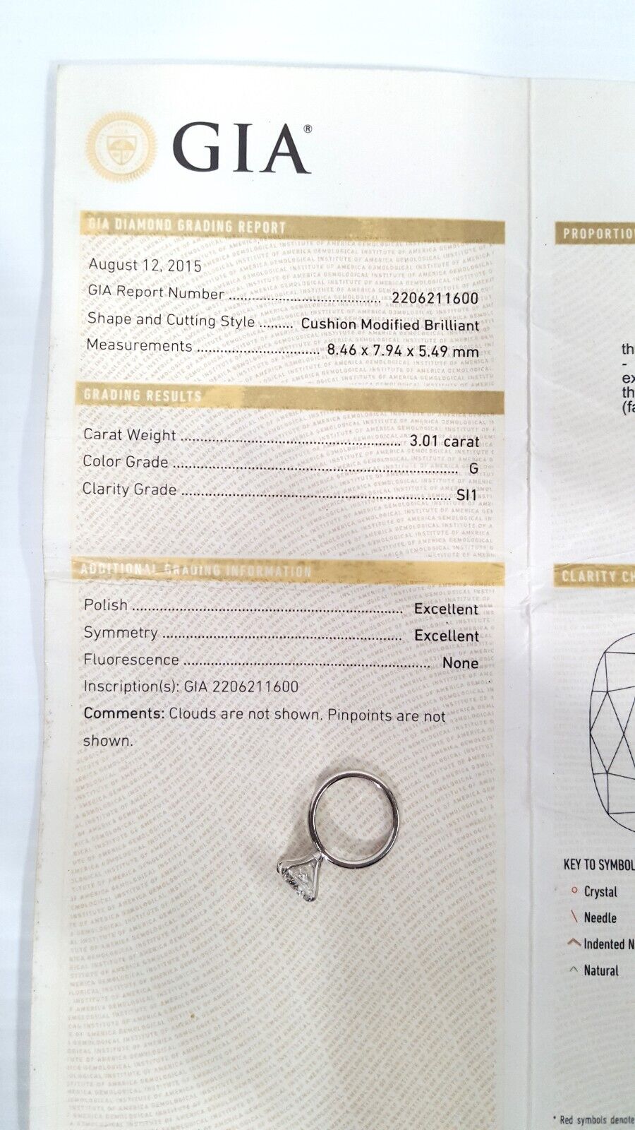 Platinum 3.01ct Natural Cushion Cut Solitaire Diamond Engagement Ring GIA Cert