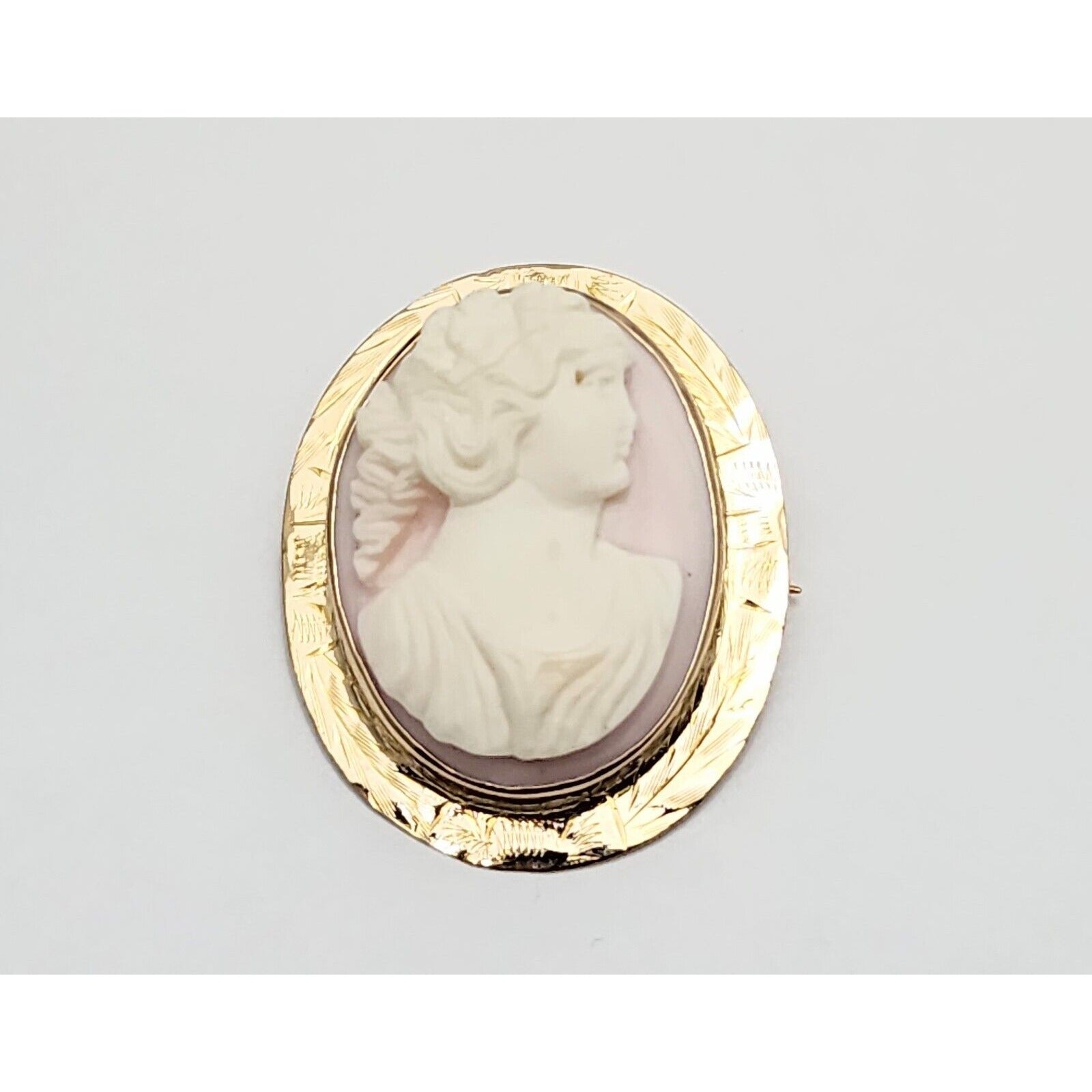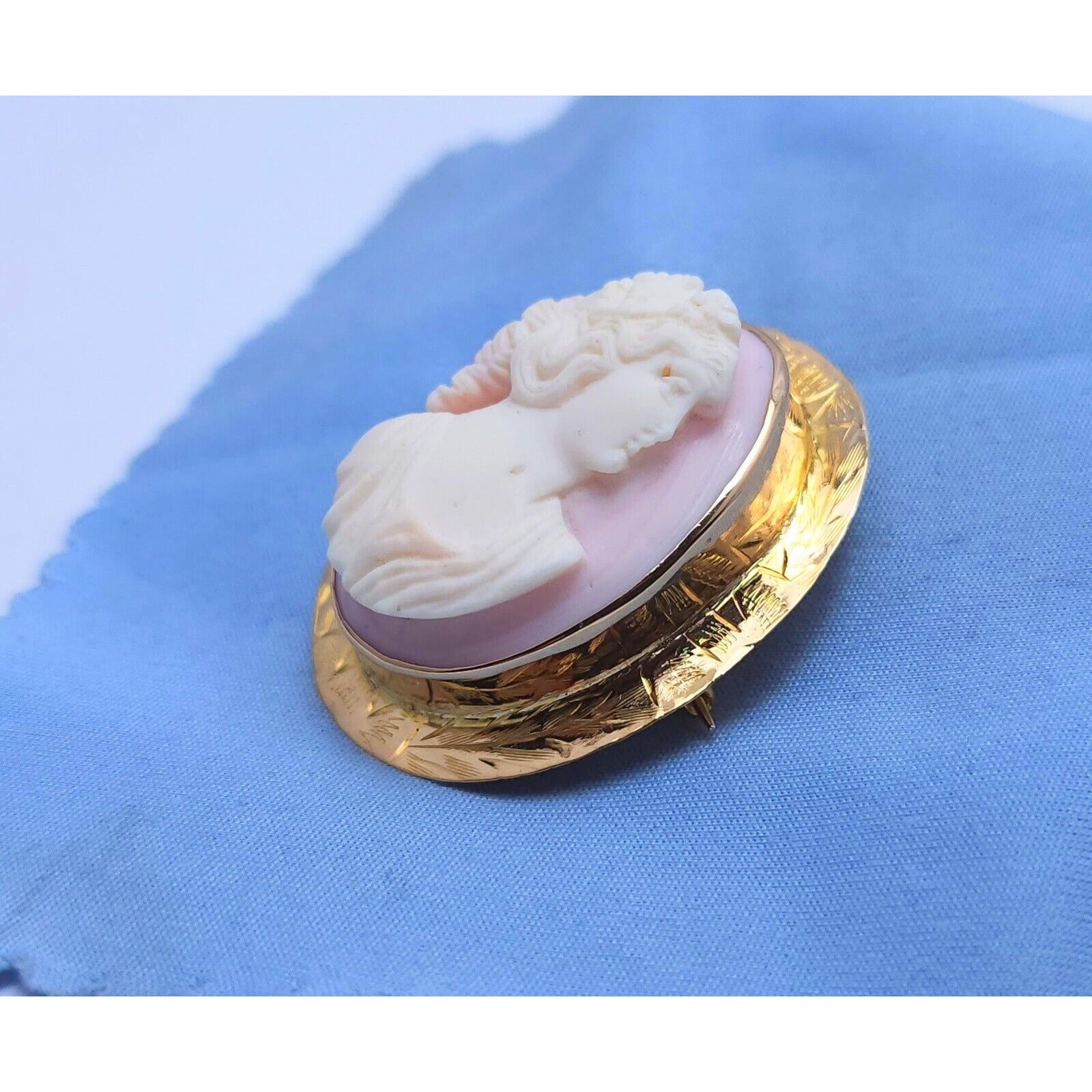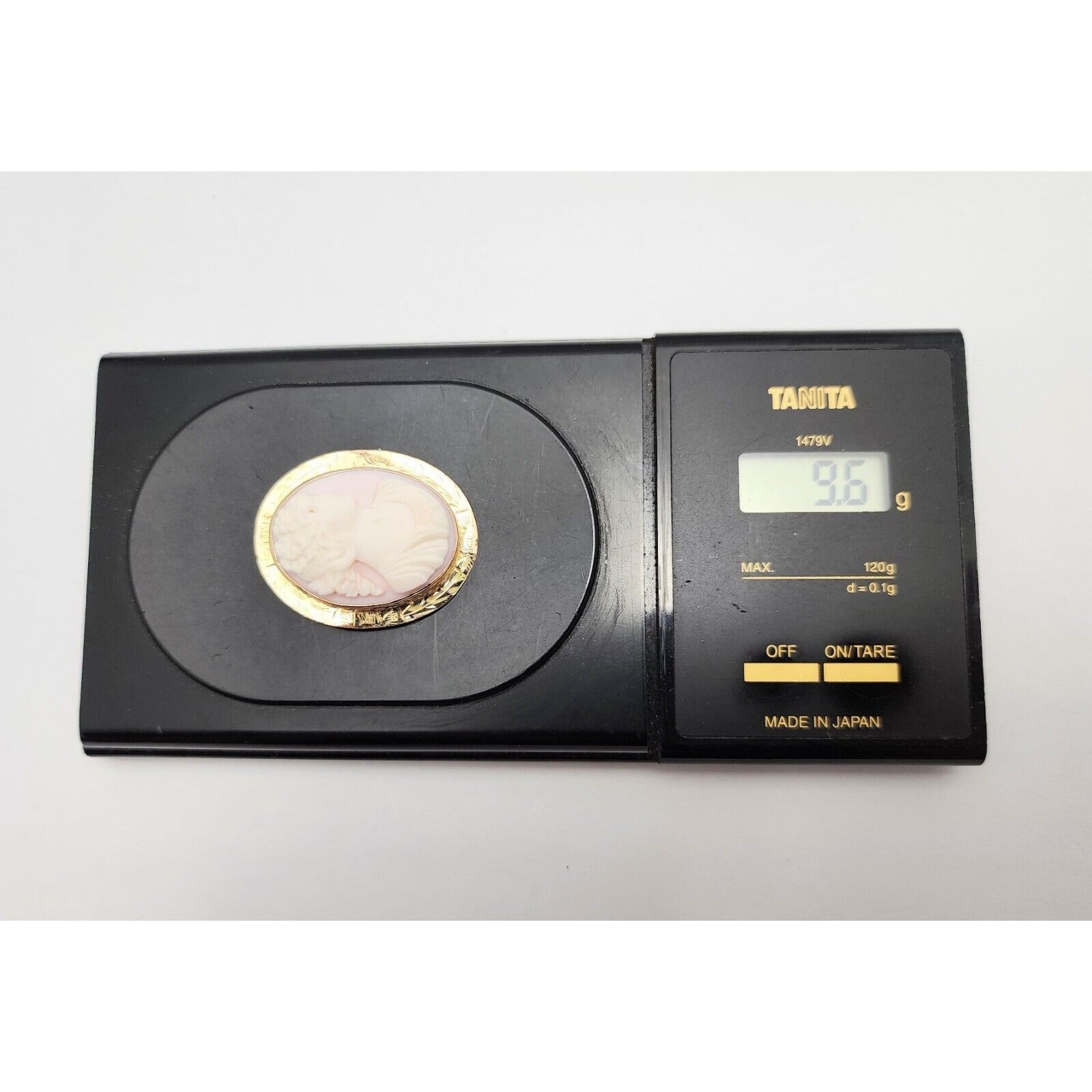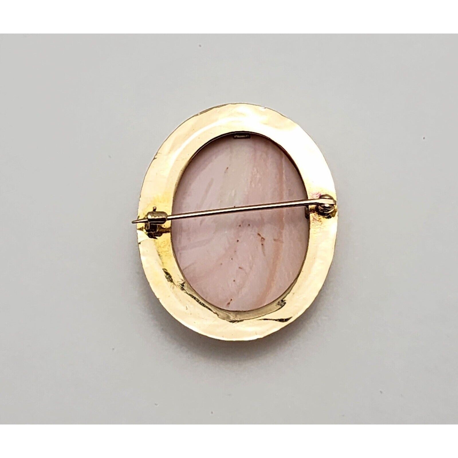 Vintage 10K Yellow Gold Floral Pink Cameo Oval Brooch Pin