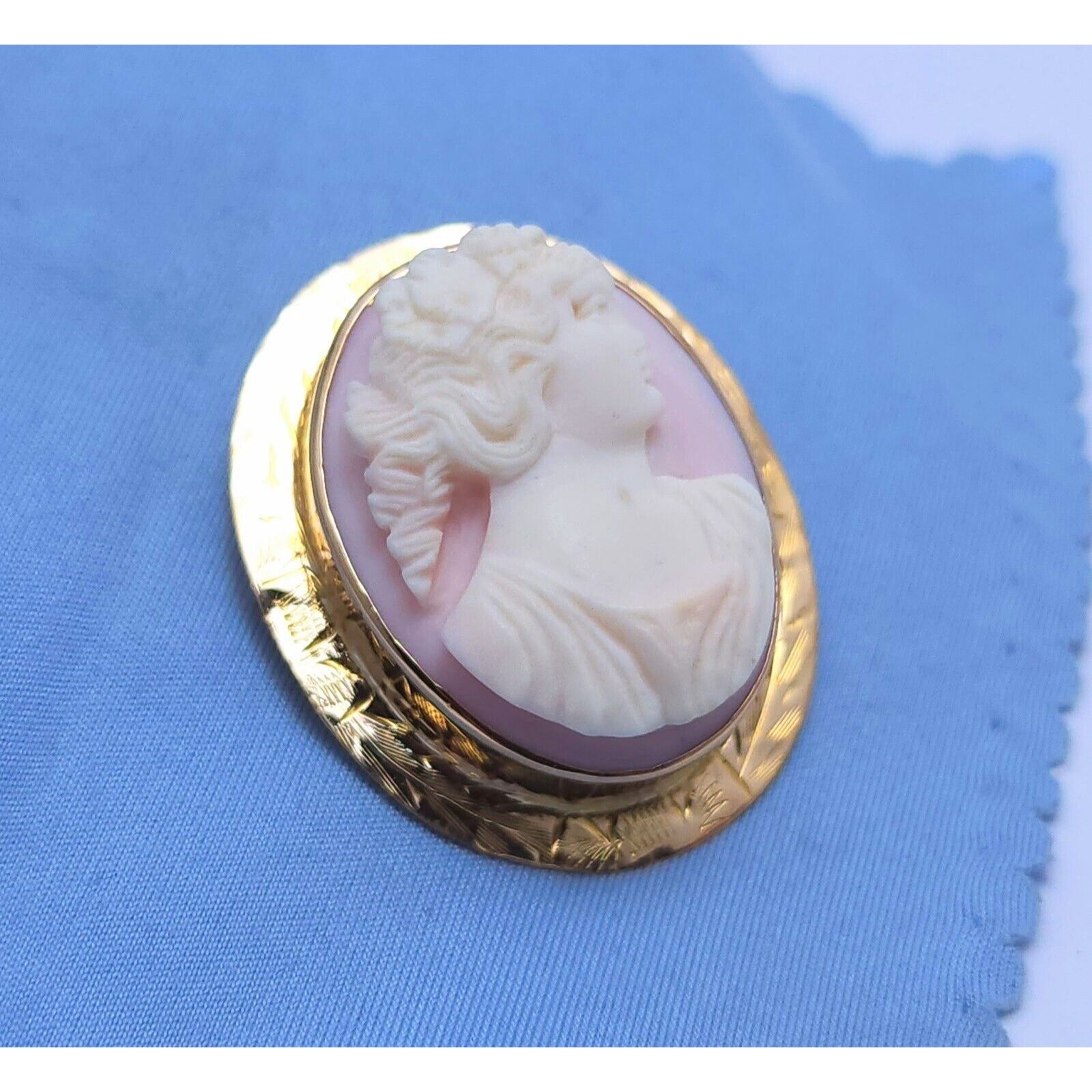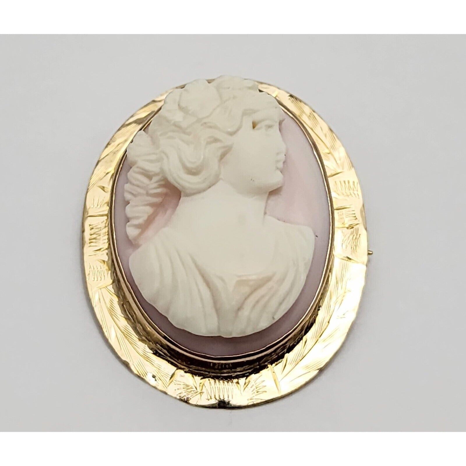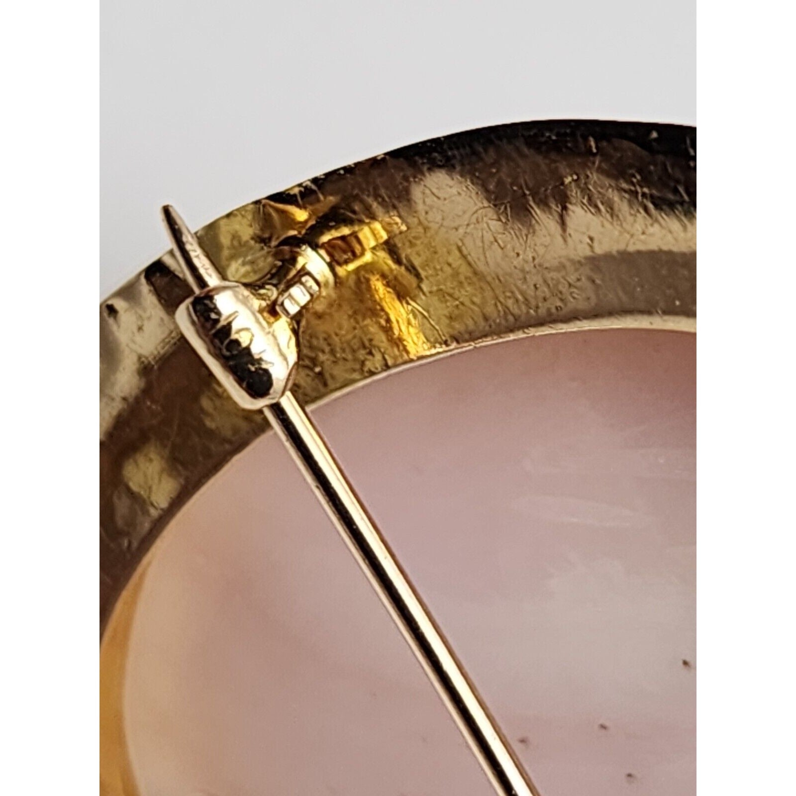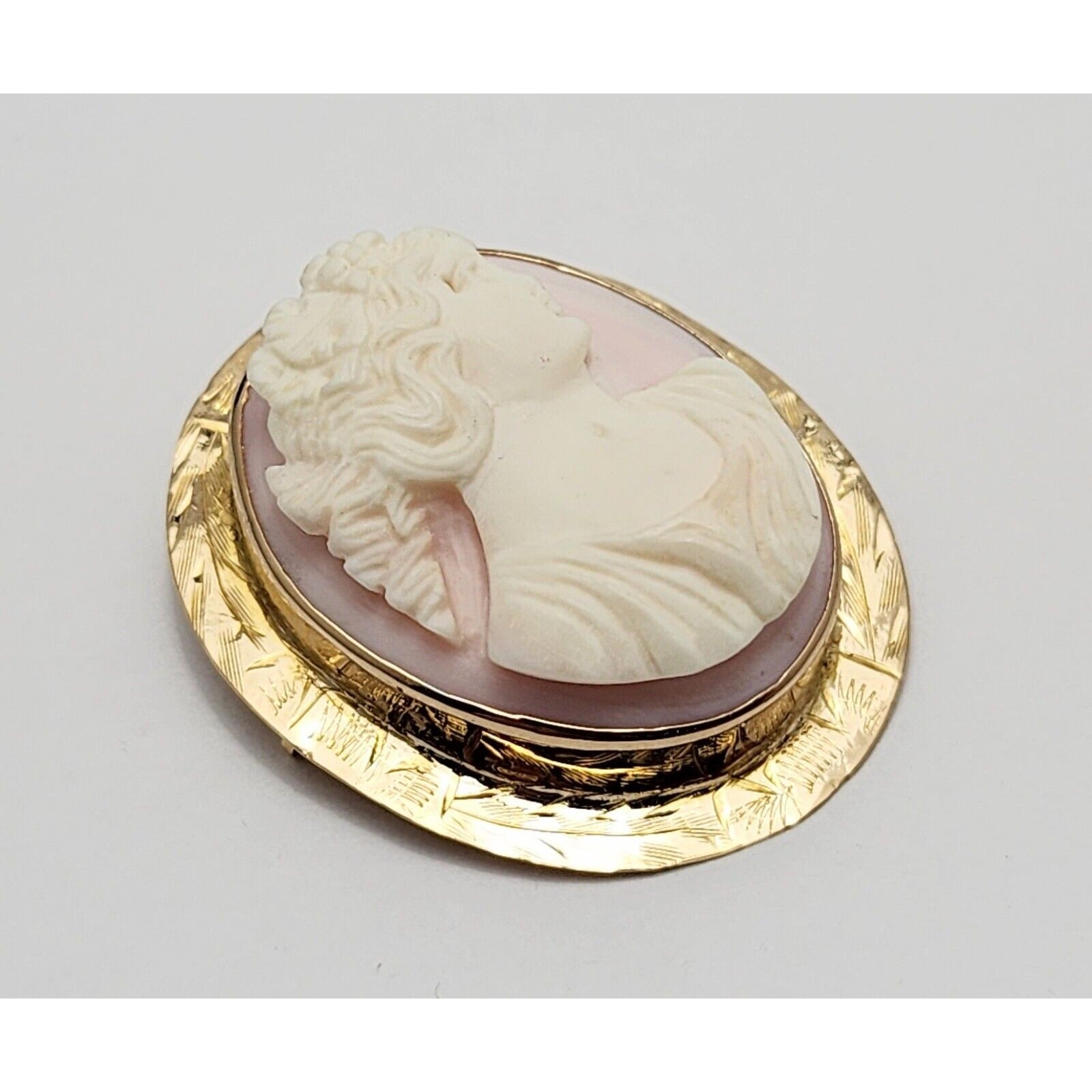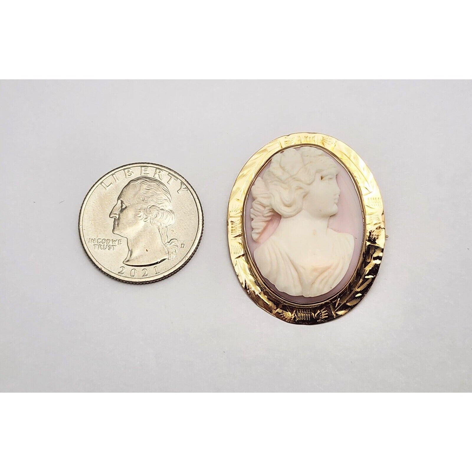 Vintage 10K Yellow Gold Floral Pink Cameo Oval Brooch Pin