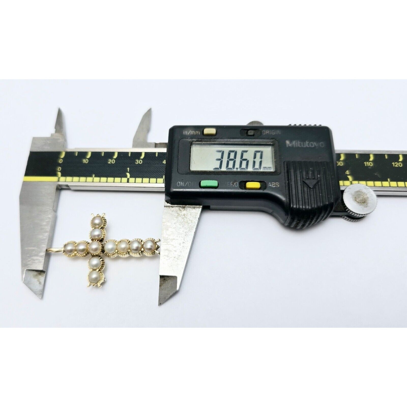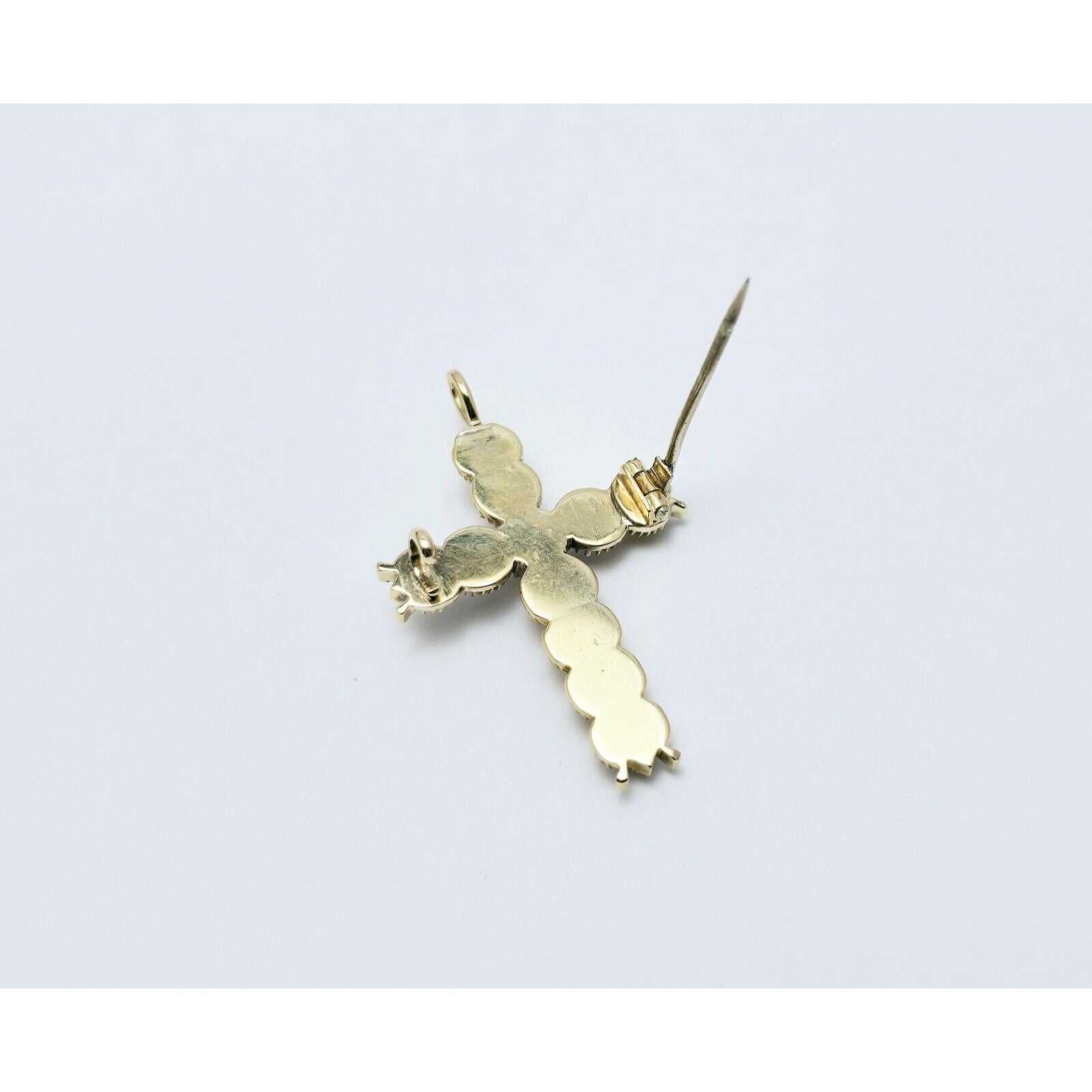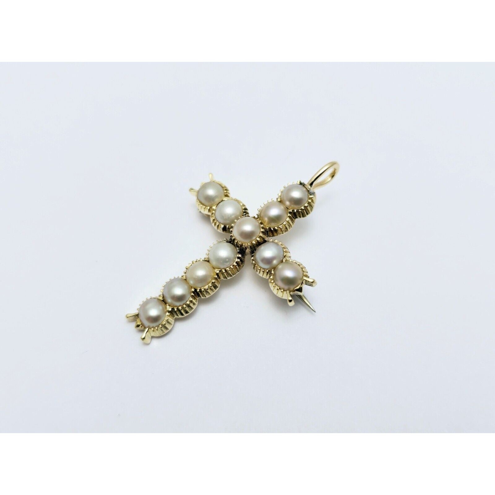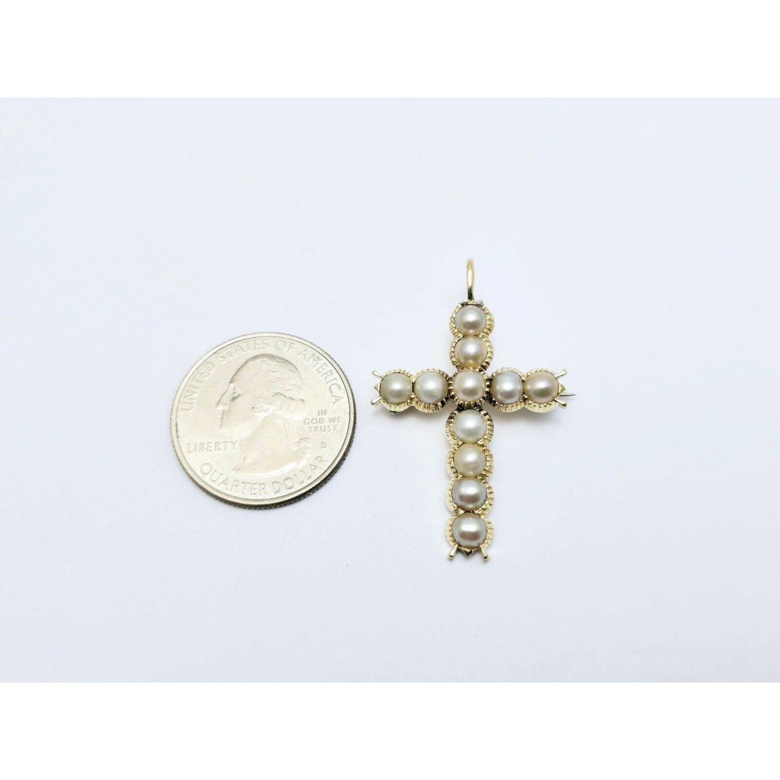Vintage 14K Yellow Gold Pearl Cross Charm Pendant Brooch Pin