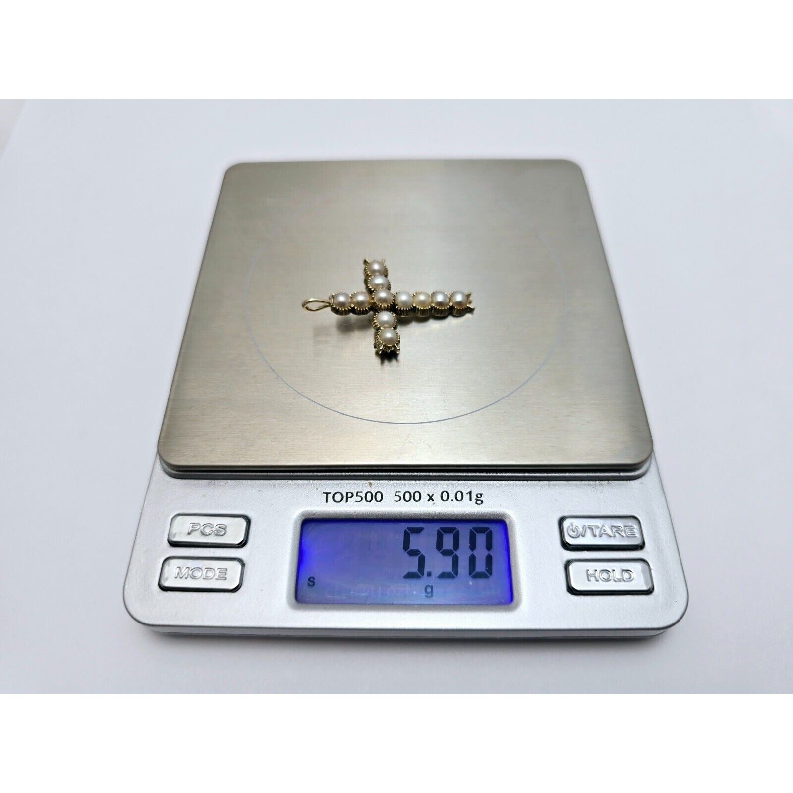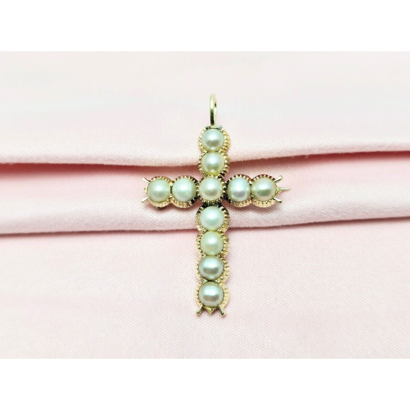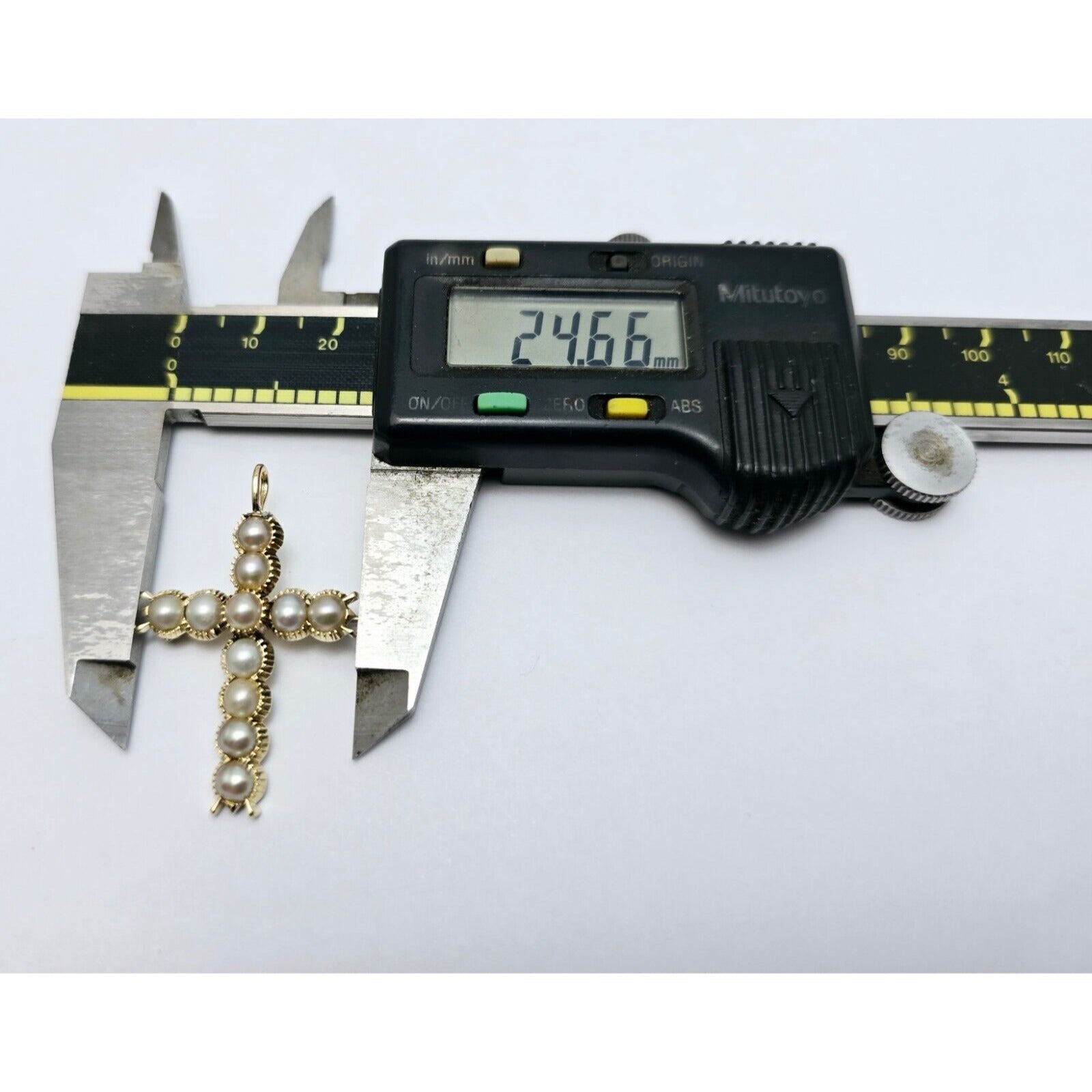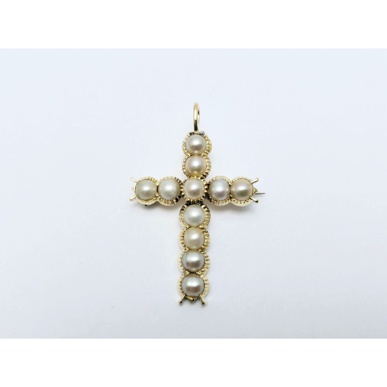 Vintage 14K Yellow Gold Pearl Cross Charm Pendant Brooch Pin