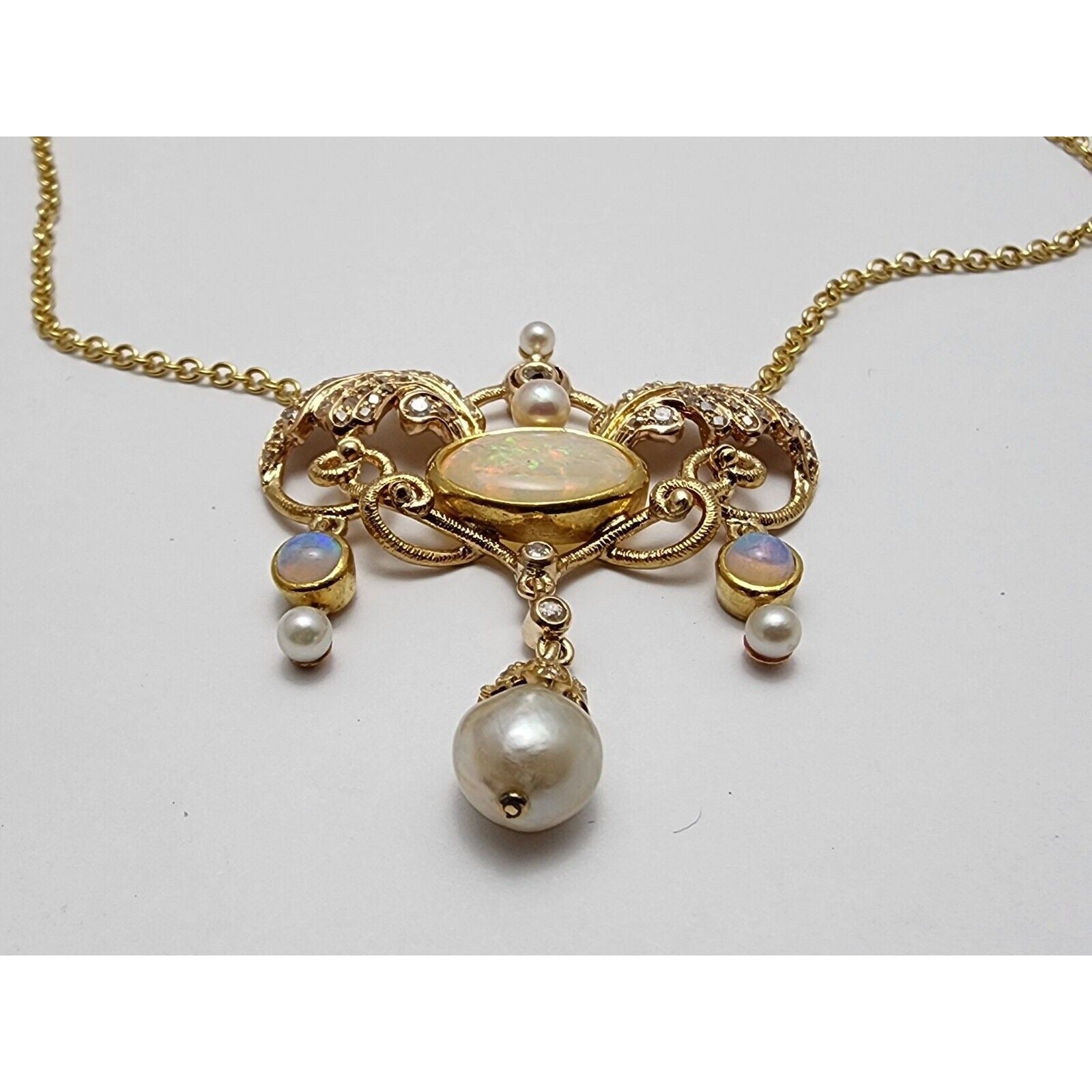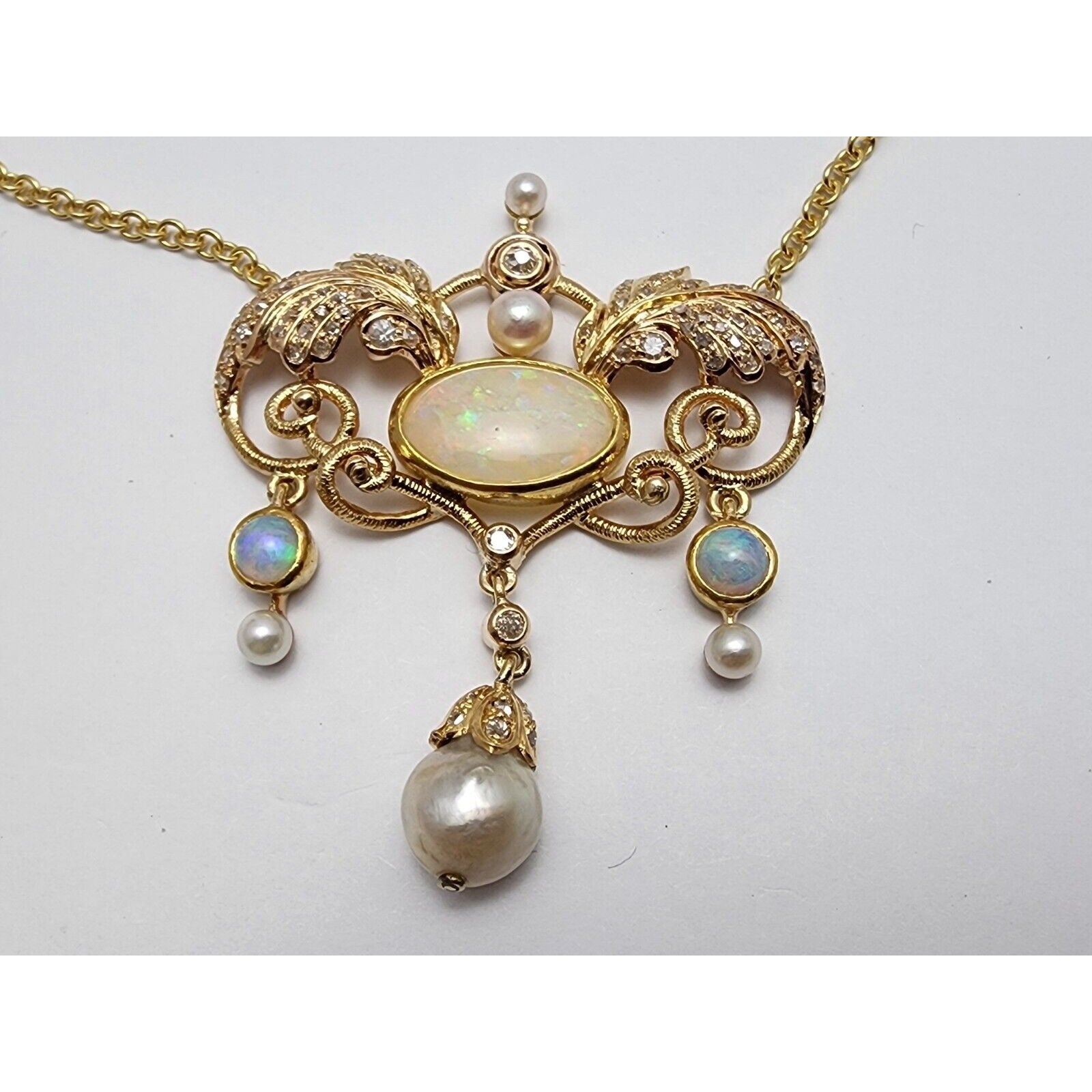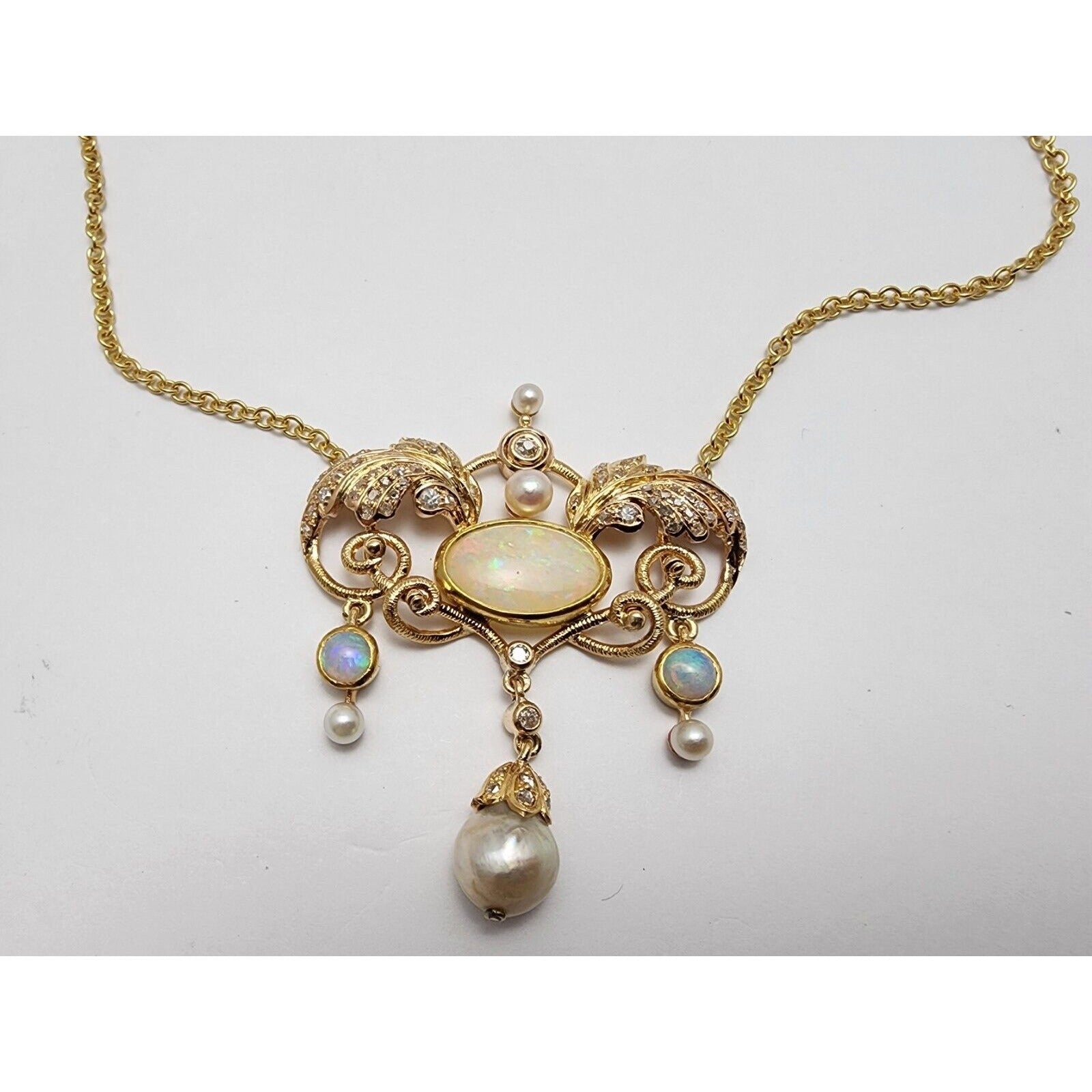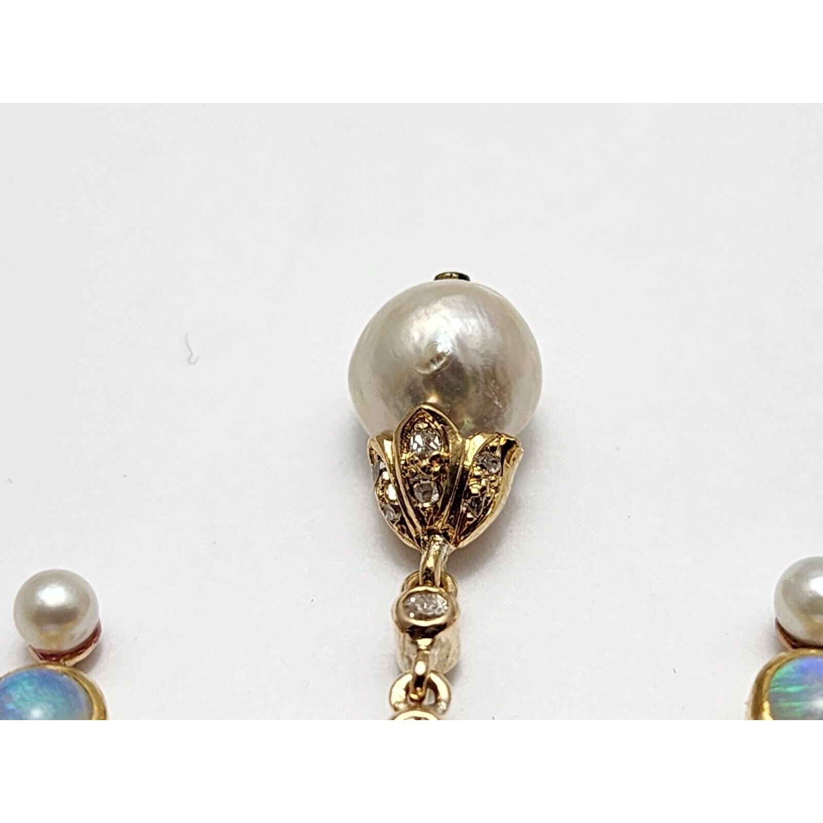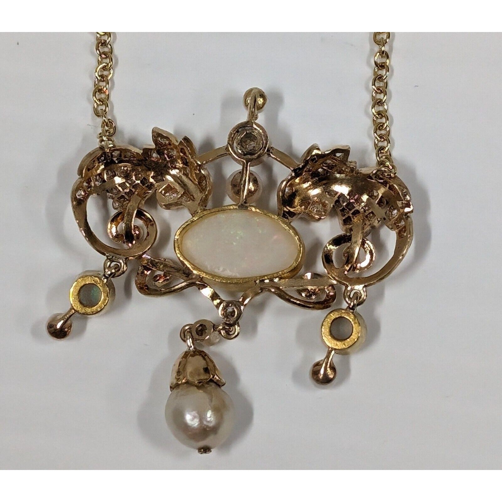 - Necklace Includes a total of 5 Pearls, 3 Opals & 71 Mix of Raw/Old Cut Round Diamonds