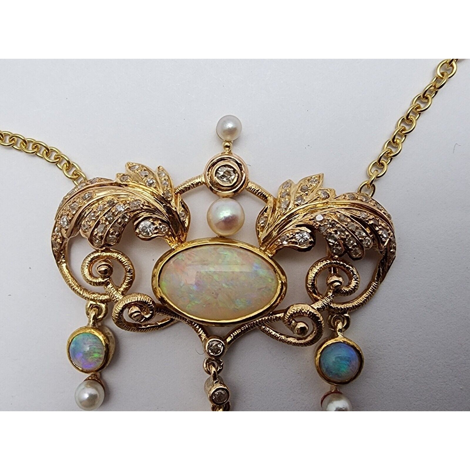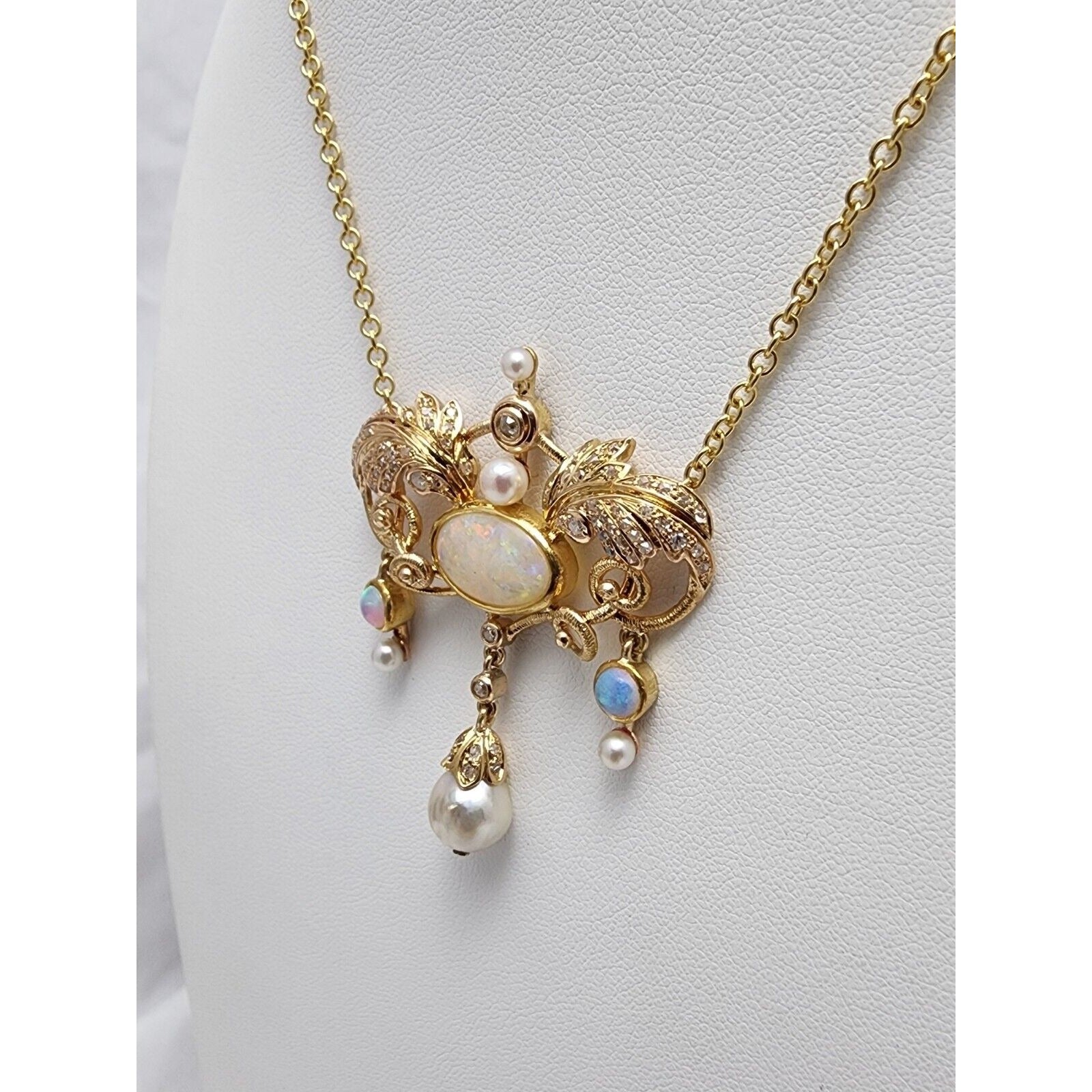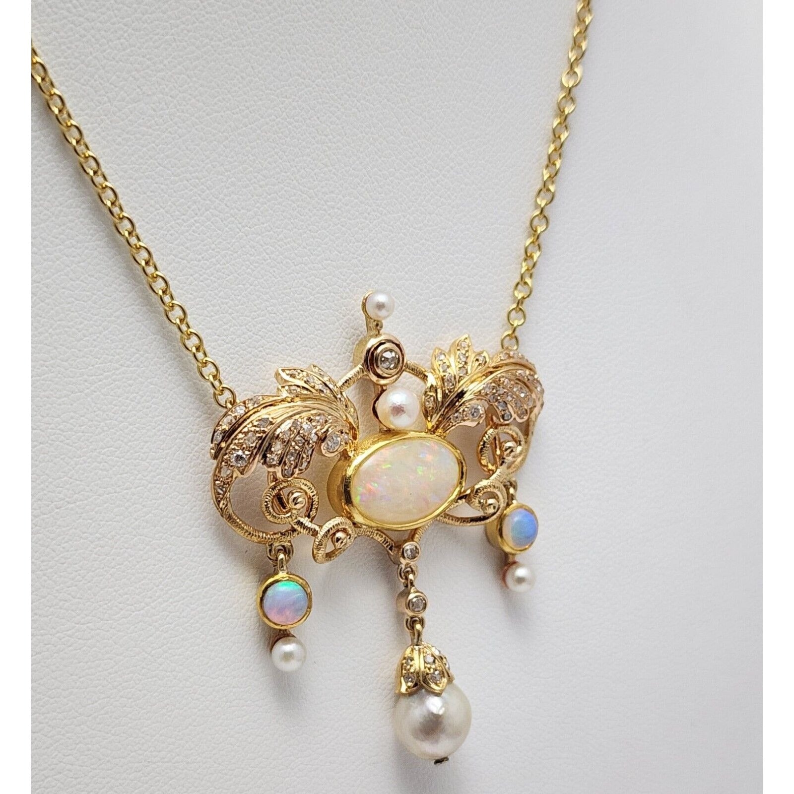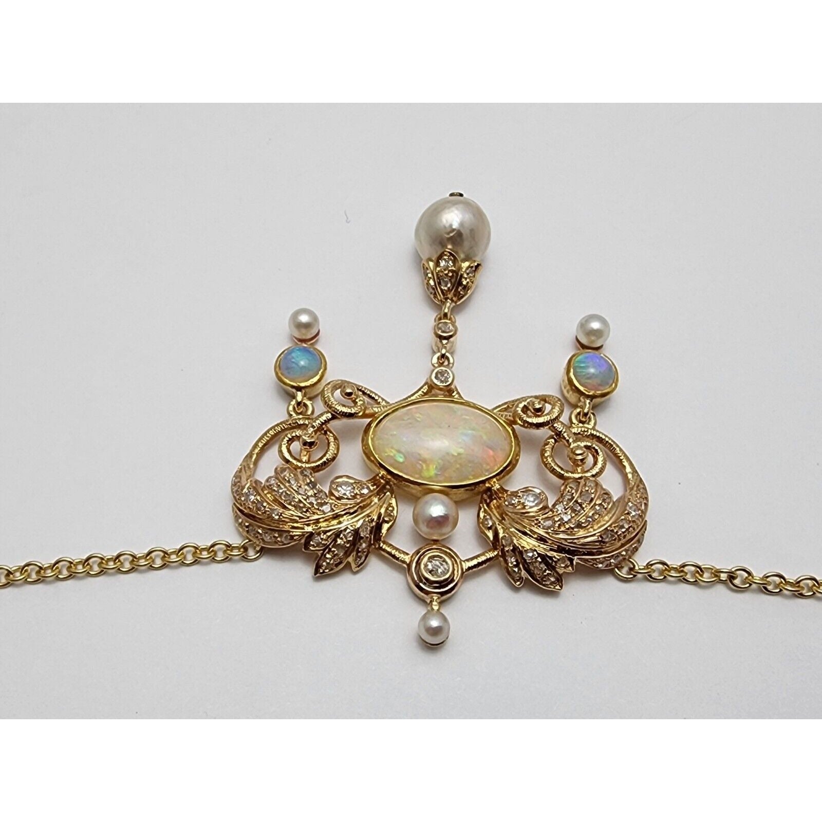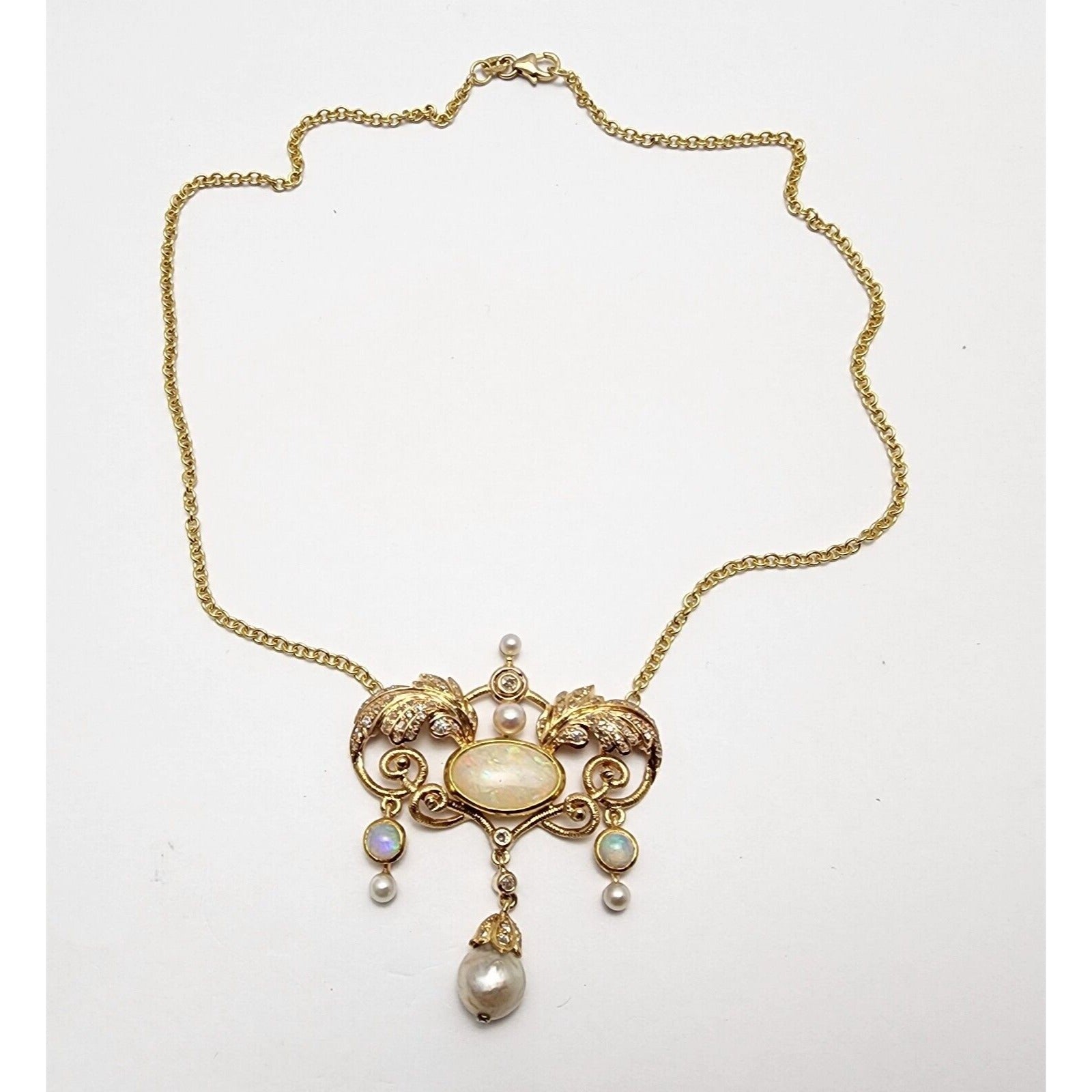 - Necklace Includes a total of 5 Pearls, 3 Opals & 71 Mix of Raw/Old Cut Round Diamonds