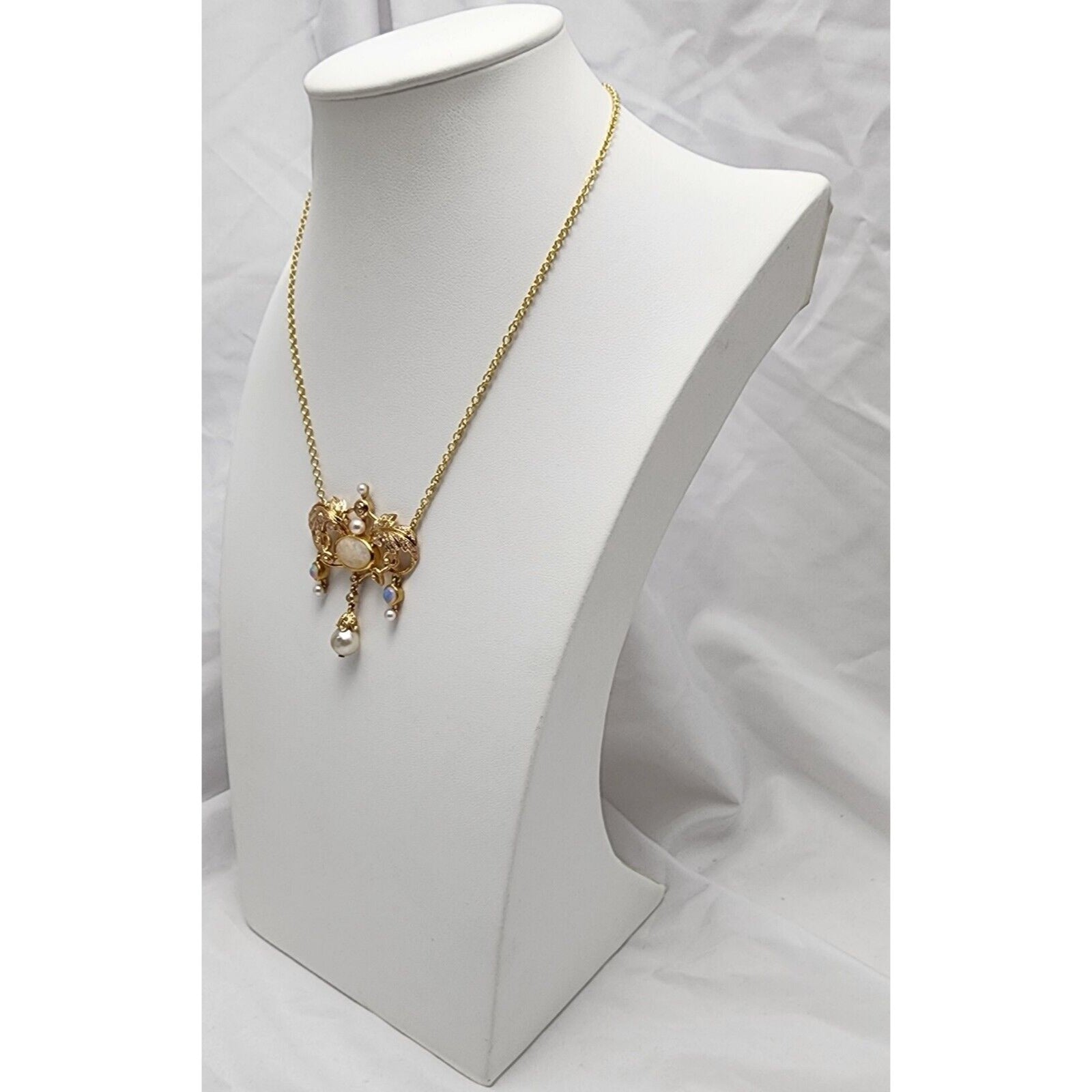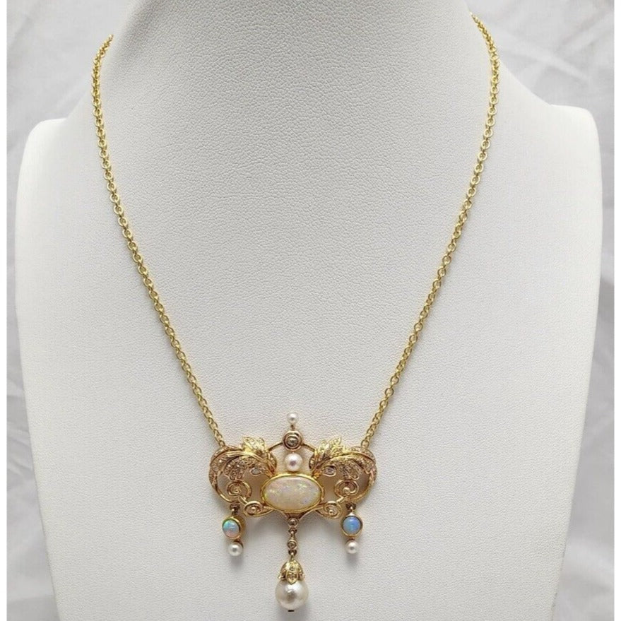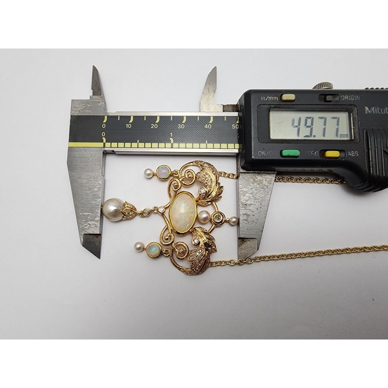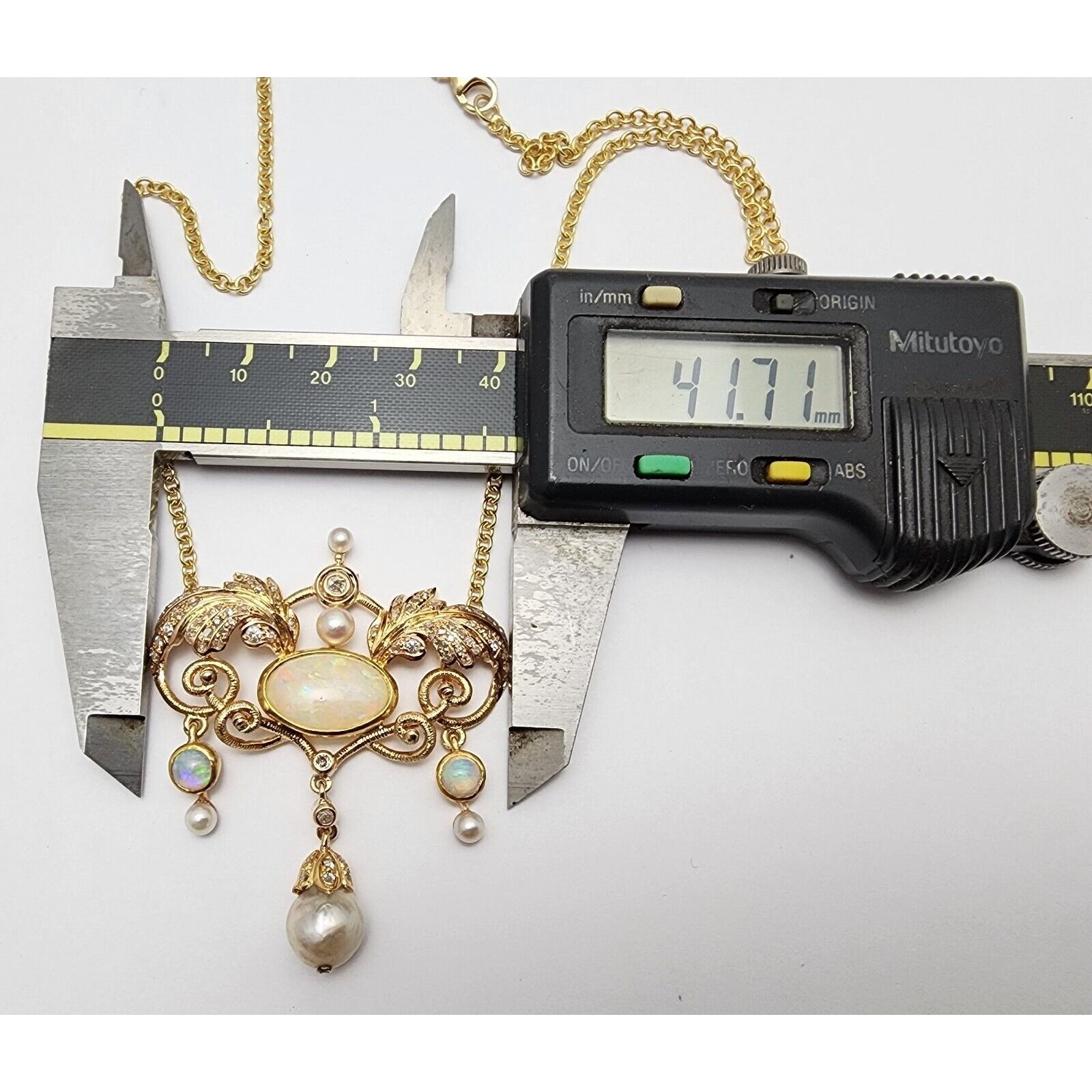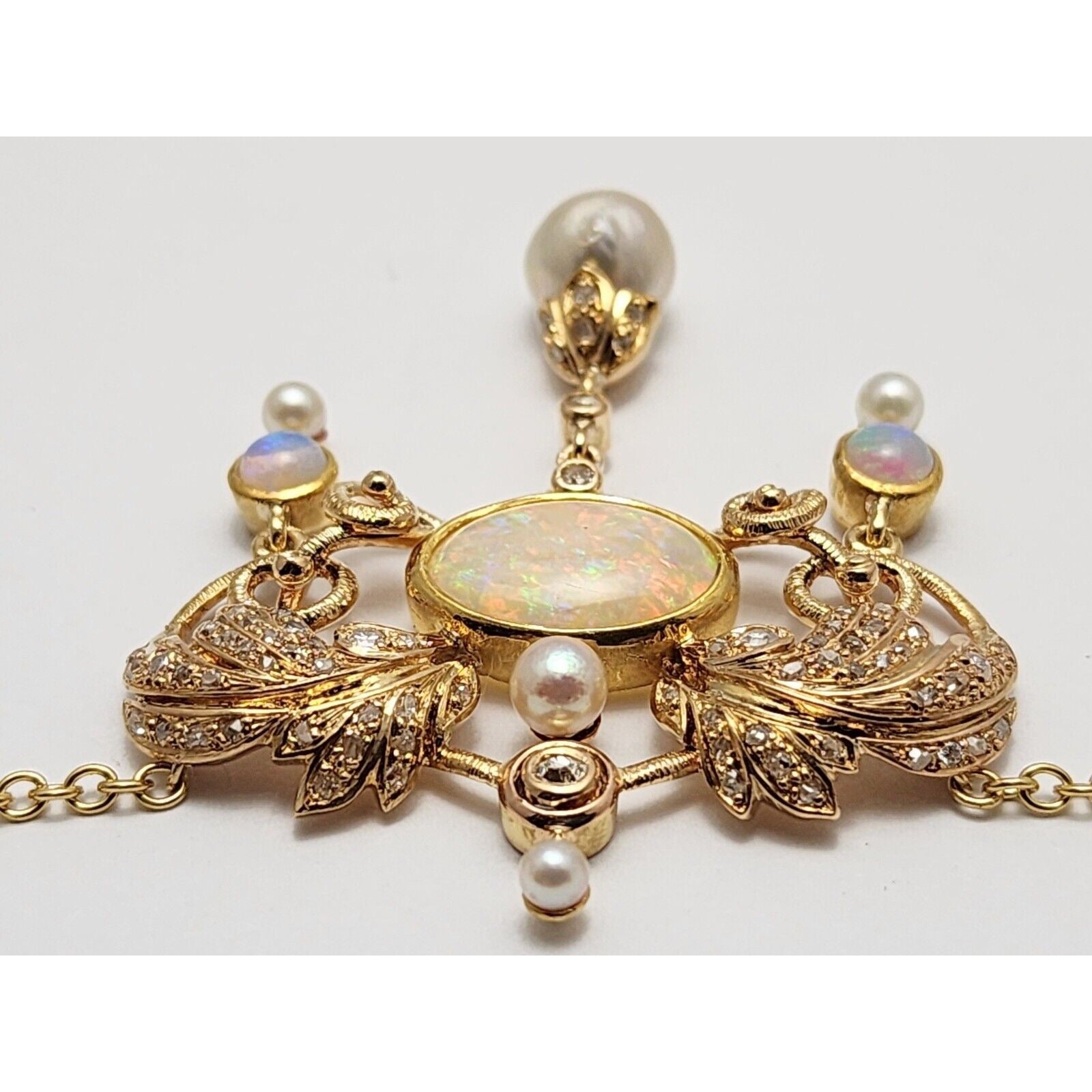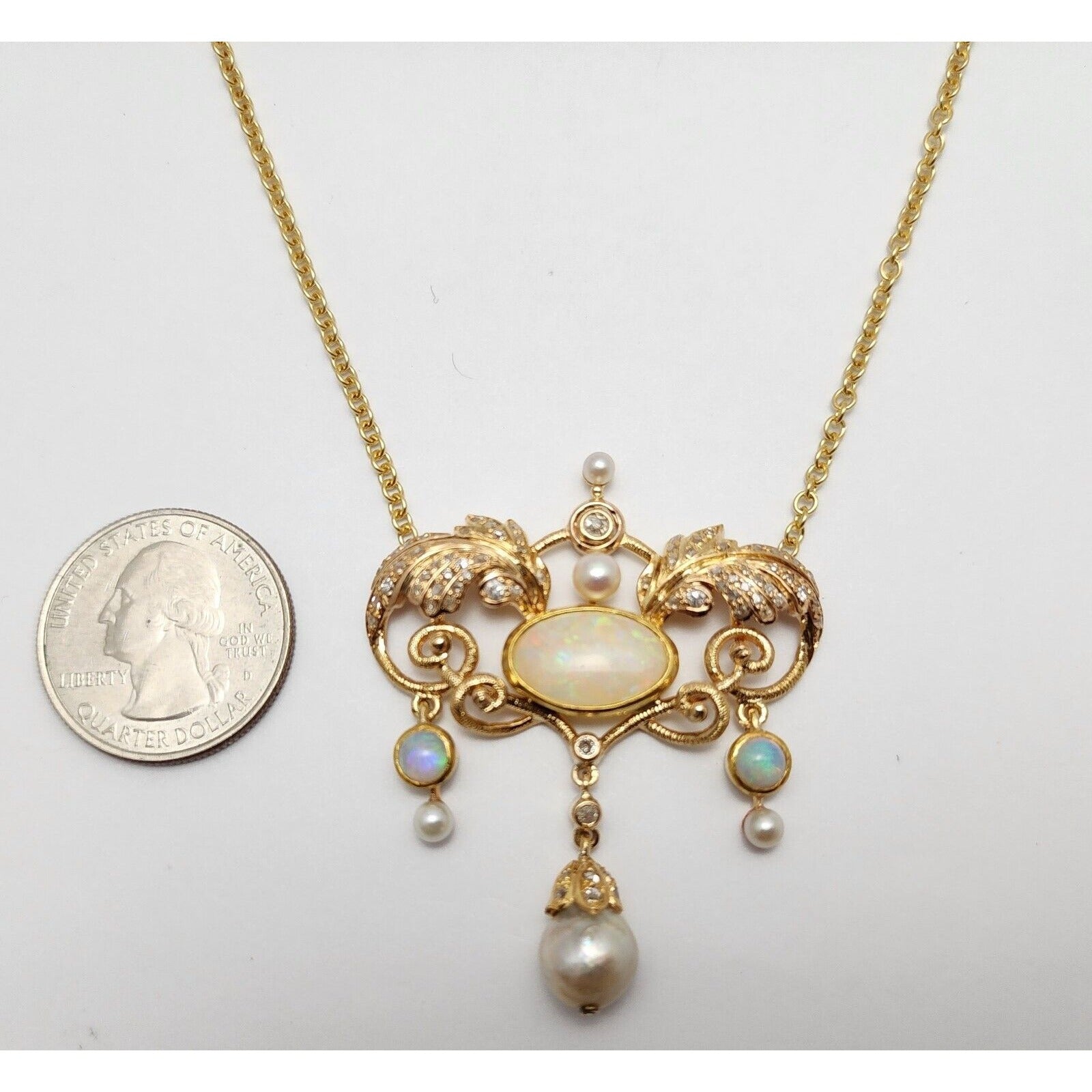 - Necklace Includes a total of 5 Pearls, 3 Opals & 71 Mix of Raw/Old Cut Round Diamonds