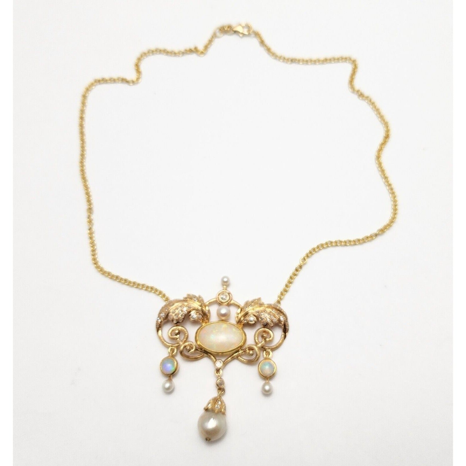 Vintage 18K Yellow Gold Opal, Pearl & Diamond Choker Link Chain Necklace