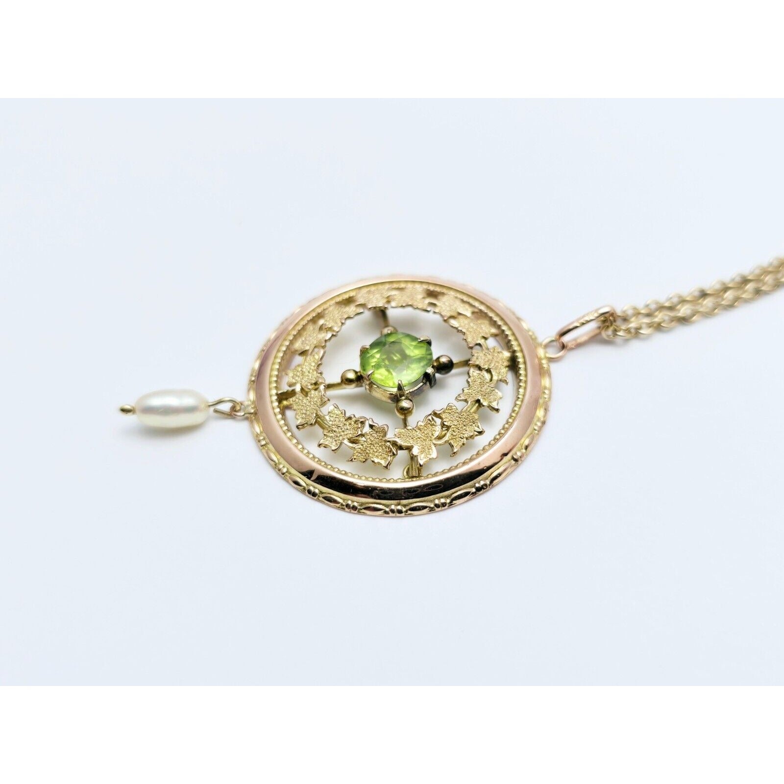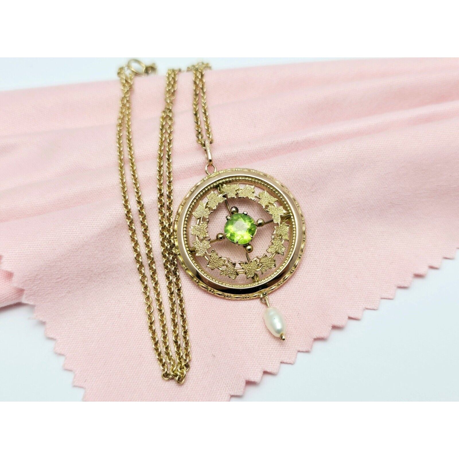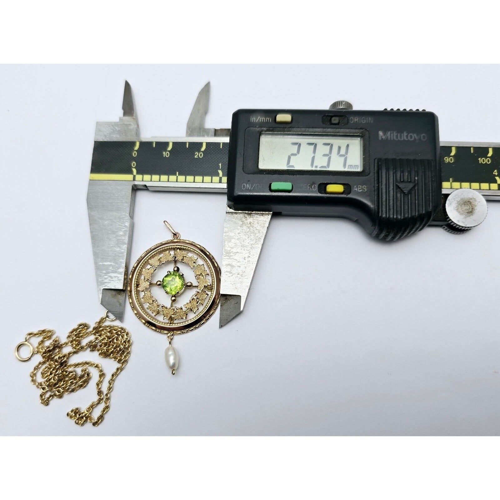 Vintage 9K Two Tone Gold Peridot & Pearl Round Charm Pendant Cable Link Necklace