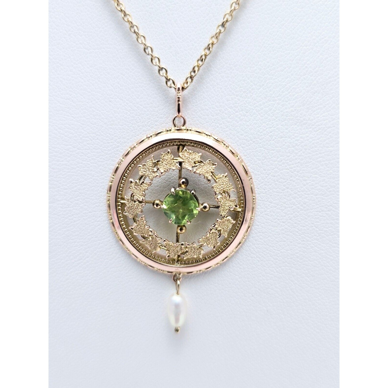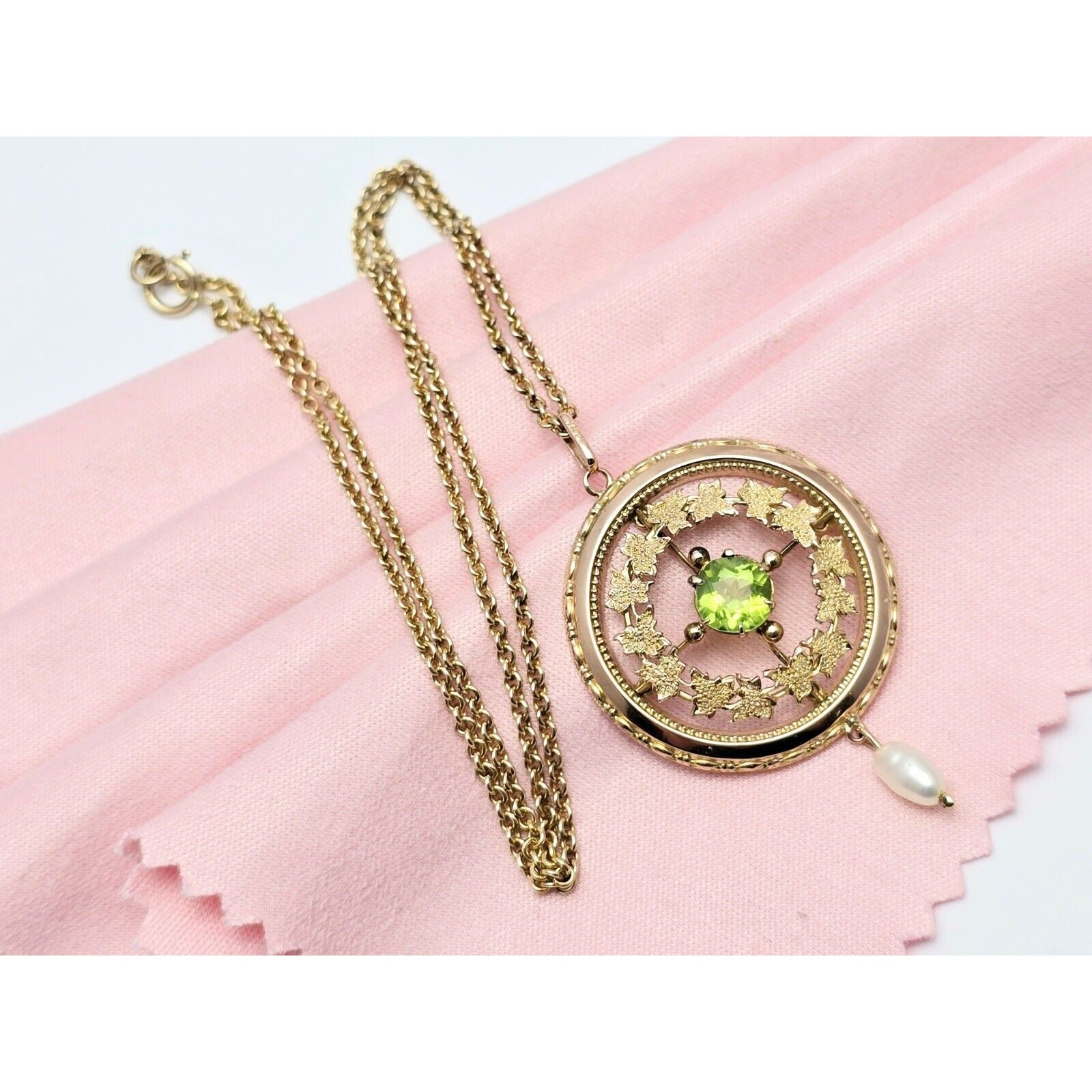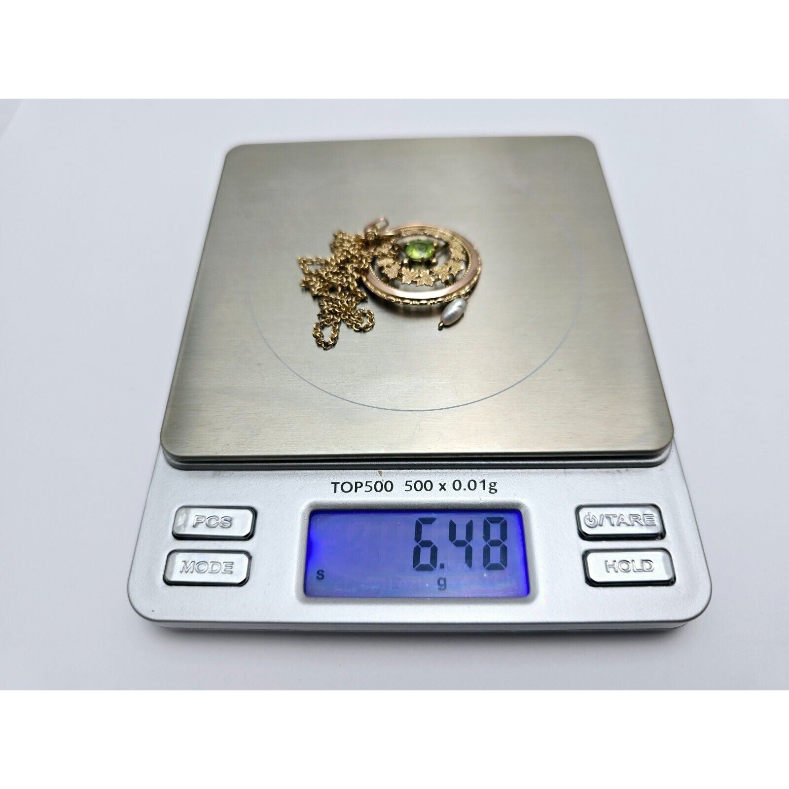 Vintage 9K Two Tone Gold Peridot & Pearl Round Charm Pendant Cable Link Necklace