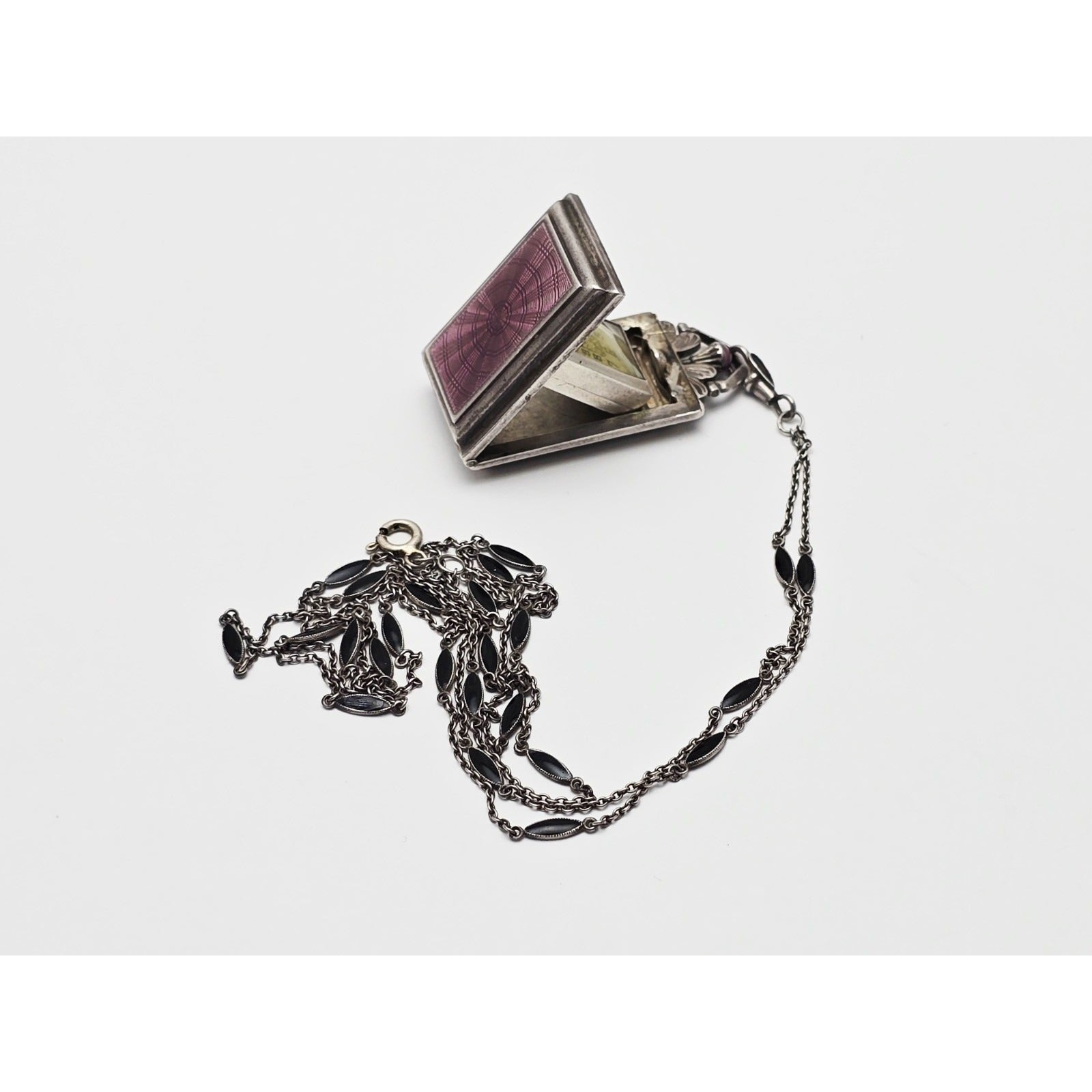- Design: Rectangular hinged pendant with guilloché purple enamel front and enamel station chain=