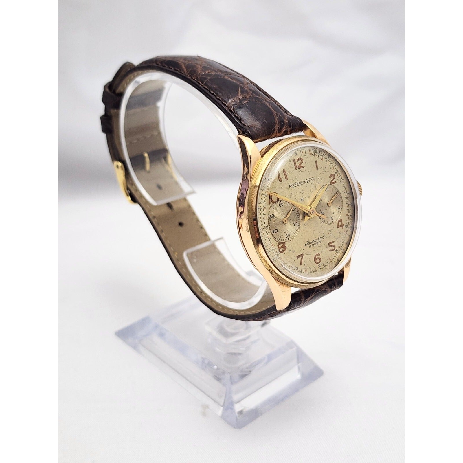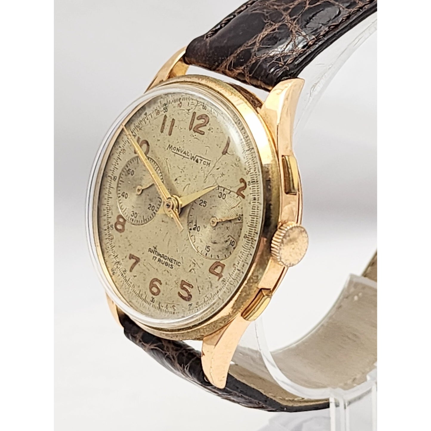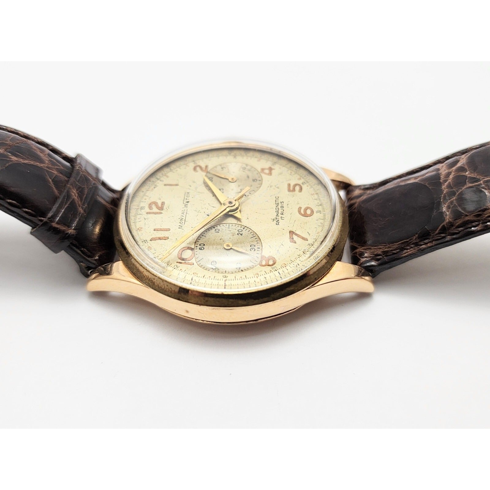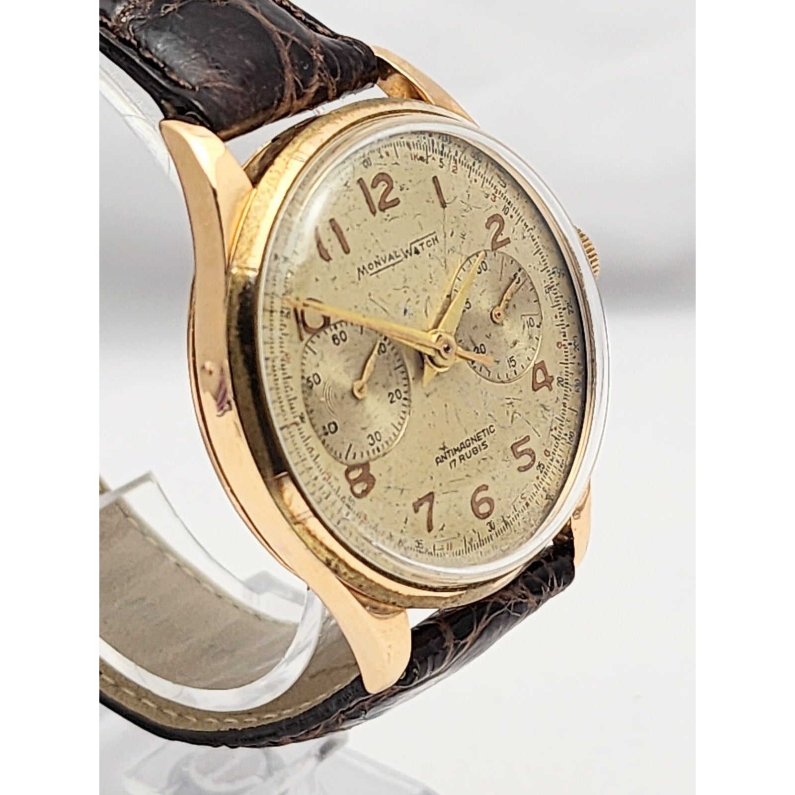 Vintage Monval 18K Rose Gold 37mm 17J Antimagnetic Chronograph Swiss Watch